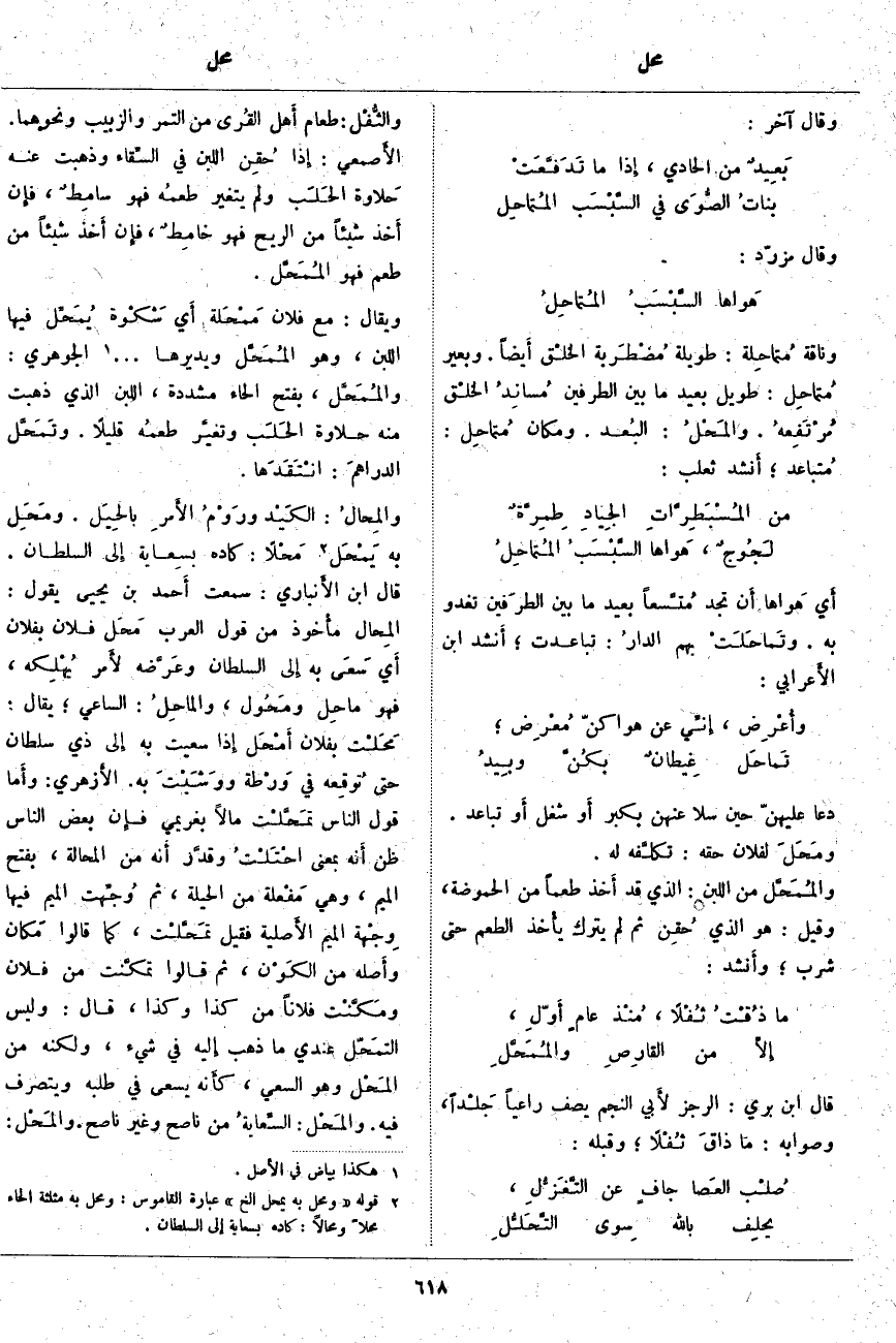 والثُّفْل: طَعَامُ أَهل القُرى مِنَ التَّمْرِ وَالزَّبِيبِ وَنَحْوِهِمَا. الأَصمعي: إِذا حُقِن اللَّبَنُ فِي السِّقاء وَذَهَبَتْ عَنْهُ حَلاوة الحَلَب وَلَمْ يَتَغَيَّرْ طعمُه فَهُوَ سامِطٌ، فإِن أَخذ شَيْئًا مِنَ الرِّيحِ فَهُوَ خامِطٌ، فإِن أَخذ شَيْئًا مِنْ طَعْمٍ فَهُوَ المُمَحَّل. وَيُقَالُ: مَعَ فُلَانٍ مَمْحَلَة أَي شَكْوة يُمَحِّل فِيهَا اللَّبَنَ، وَهُوَ المُمَحَّل وَيُدِيرُهَا «1» ... الْجَوْهَرِيُّ: والمُمَحَّل، بِفَتْحِ الْحَاءِ مُشَدَّدَةً، اللَّبَنُ الَّذِي ذَهَبَتْ مِنْهُ حَلَاوَةُ الحَلَب وتغيَّر طعمُه قَلِيلًا. وتَمَحَّلَ الدراهمَ: انْتَقَدَها. والمِحالُ: الكَيْد ورَوْمُ الأَمرِ بالحِيَل. ومَحِلَ [مَحَلَ] بِهِ يَمْحَلُ «2» مَحْلًا: كَادَهُ بسِعاية إِلى السُّلْطَانِ. قَالَ ابْنُ الأَنباري: سَمِعْتُ أَحمد بْنُ يَحْيَى يَقُولُ: المِحال مأْخوذ مِنْ قَوْلِ الْعَرَبِ مَحَلَ فُلَانٌ بِفُلَانٍ أَي سَعَى بِهِ إِلى السُّلْطَانِ وعَرَّضه لأَمر يُهْلِكه، فَهُوَ مَاحِل ومَحُول، والمَاحِلُ: السَّاعِي؛ يُقَالُ: مَحَلْت بِفُلَانٍ أَمْحَلَ إِذا سَعَيْتَ بِهِ إِلى ذِي سُلْطَانٍ حَتَّى تُوقِعه فِي وَرْطة ووَشَيْتَ بِهِ. الأَزهري: وأَما قَوْلُ النَّاسِ تمَحَّلْت مَالًا بِغَرِيمِي فإِن بَعْضَ النَّاسِ ظَنَّ أَنه بِمَعْنَى احْتَلْتُ وقدَّر أَنه مِنَ الْمَحَالَةِ، بِفَتْحِ الْمِيمِ، وَهِيَ مَفْعلة مِنَ الْحِيلَةِ، ثُمَّ وُجِّهت الْمِيمُ فِيهَا وِجْهة الْمِيمِ الأَصلية فَقِيلَ تمَحَّلْت، كَمَا قَالُوا مَكان وأَصله مِنَ الكَوْن، ثُمَّ قَالُوا تمكَّنت مِنْ فُلَانٍ ومَكَّنْت فُلَانًا مِنْ كَذَا وَكَذَا، قَالَ: وَلَيْسَ التَّمَحُّل عِنْدِي مَا ذَهَبَ إِليه فِي شَيْءٍ، وَلَكِنَّهُ مِنَ المَحْل وَهُوَ السَّعْيُ، كأَنه يَسْعَى فِي طَلَبِهِ وَيَتَصَرَّفُ فِيهِ. والمَحْل: السِّعايةُ مِنْ نَاصِحٍ وَغَيْرِ نَاصِحٍ. والمَحْل: