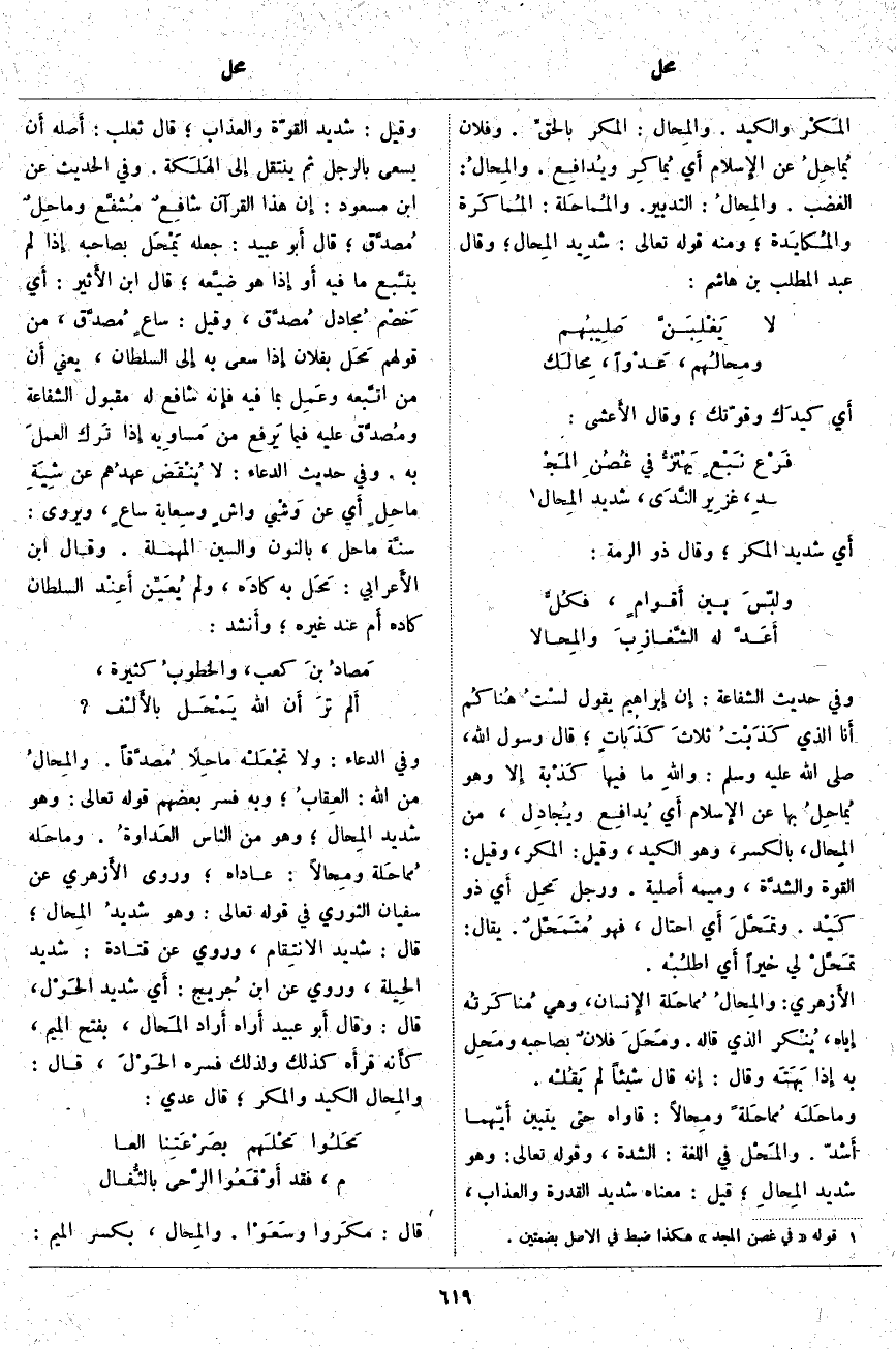، قَالَ: وَقَالَ أَبو عُبَيْدٍ أَراه أَراد المَحال، بِفَتْحِ الْمِيمِ، كأَنه قرأَه كَذَلِكَ وَلِذَلِكَ فَسَّرَهُ الحَوْلَ، قَالَ: والمِحَال الْكَيْدُ وَالْمَكْرُ؛ قَالَ عَدِيٌّ: