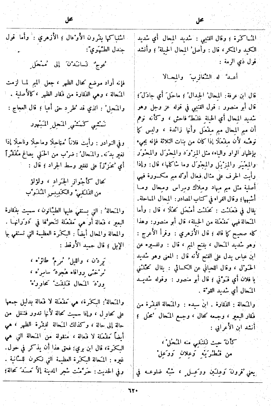 أَي الحيلةِ غلَطٌ فَاحِشٌ، وكأَنه تَوَهَّمَ أَن مِيمَ المِحال مِيمُ مِفْعَل وأَنها زَائِدَةٌ، وَلَيْسَ كَمَا توهَّمه لأَن مِفْعَلًا إِذا كَانَ مِنْ بَنَاتِ الثَّلَاثَةِ فإِنه يَجِيءُ بإِظهار الْوَاوِ وَالْيَاءِ، مِثْلَ المِزْوَد والمِحْوَل والمِحْوَر والمِعْيَر والمِزْيَل والمِجْوَل وَمَا شَاكَلَهَا، قَالَ: وإِذا رأَيت الْحَرْفَ عَلَى مِثَالِ فِعال أَوّله مِيمٌ مَكْسُورَةٌ فَهِيَ أَصلية مِثْلَ مِيمِ مِهاد ومِلاك ومِراس ومِحال وَمَا أَشبهها؛ وَقَالَ الْفَرَّاءُ فِي كِتَابِ الْمَصَادِرِ: المِحَال الْمُمَاحَلَةُ. يُقَالُ فِي فَعَلْت: مَحَلْت أَمْحَل مَحْلًا، قَالَ: وأَما المَحالة فَهِيَ مَفْعَلة مِنَ الحِيلة، قَالَ أَبو مَنْصُورٍ: وَهَذَا كُلُّهُ صَحِيحٌ كَمَا قَالَهُ؛ قَالَ الأَزهري: وقرأَ