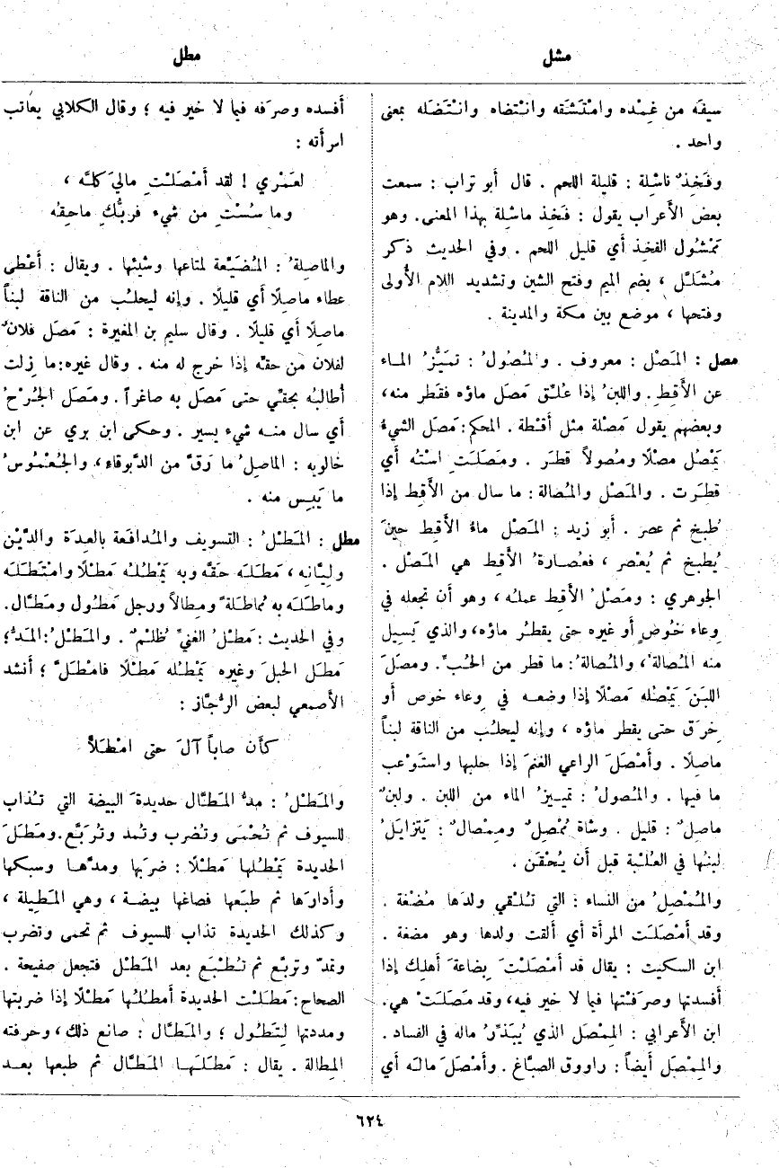 مصل: المَصْل: مَعْرُوفٌ. والمُصُولُ: تمَيُّزُ الْمَاءِ عَنِ الأَقِطِ. واللبنُ إِذا عُلِّق مَصَل مَاؤُهُ فقَطر مِنْهُ، وَبَعْضُهُمْ يَقُولُ مَصْلَة مَثَّلَ أَقْطة. الْمُحْكَمُ: مَصَلَ الشيءُ يَمْصُلُ مَصْلًا ومُصولًا قطَر. ومَصَلَتِ اسْتُه أَي قطرَت. والمَصْل والمُصَالَة: مَا سَالَ مِنَ الأَقِط إِذا طُبخ ثُمَّ عَصَرَ. أَبو زَيْدٍ: المَصْل ماءُ الأَقِط حينَ يُطبخ ثُمَّ يُعْصر، فعُصارةُ الأَقِط هِيَ المَصْل. الْجَوْهَرِيُّ: ومَصْلُ الأَقِط عملُه، وَهُوَ أَن تَجْعَلَهُ فِي وِعاء خُوصٍ أَو غَيْرِهِ حَتَّى يقطُر مَاؤُهُ، وَالَّذِي يَسِيل مِنْهُ المُصَالَةُ، والمُصَالَةُ: مَا قَطَرَ مِنَ الحُبِّ. ومَصَلَ اللبَنَ يَمْصُلُه مَصْلًا إِذا وَضَعَهُ فِي وِعاء خُوصٍ أَو خِرَق حَتَّى يُقَطَّرَ مَاؤُهُ، وإِنه ليحلُب من الناقة لَبَنًا مَاصِلًا. وأَمْصَلَ الرَّاعِي الغنمَ إِذا حَلَبَهَا واستَوْعب مَا فِيهَا. والمُصُولُ: تمييزُ الْمَاءِ مِنَ اللَّبَنِ. ولبنٌ مَاصِلٌ: قَلِيلٌ. وَشَاةٌ مُمْصِلٌ ومِمْصَالٌ: يَتزايَلُ لبنُها فِي العُلْبة قَبْلَ أَن يُحْقَن. والمُمْصِلُ مِنَ النِّسَاءِ: الَّتِي تُلْقي ولدَها مُضْغة. وَقَدْ أَمْصَلَتِ المرأَة أَي أَلقت وَلَدَهَا وَهُوَ مُضْغَةٌ. ابْنُ السِّكِّيتِ: يُقَالُ قَدْ أَمْصَلْتَ بِضاعةَ أَهلِك إِذا أَفسدتها وصرَفْتها فِيمَا لَا خَيْرَ فِيهِ، وَقَدْ مَصَلَتْ هِيَ. ابْنُ الأَعرابي: المِمْصَل الَّذِي يُبَذِّرُ مَالَهُ فِي الْفَسَادِ. والمِمْصَل أَيضاً: رَاوُوقُ الصبَّاغ. وأَمْصَلَ مالَه أَي أَفسده وصرَفه فِيمَا لَا خَيْرَ فِيهِ؛ وَقَالَ الْكِلَابِيُّ يُعَاتِبُ امرأَته: