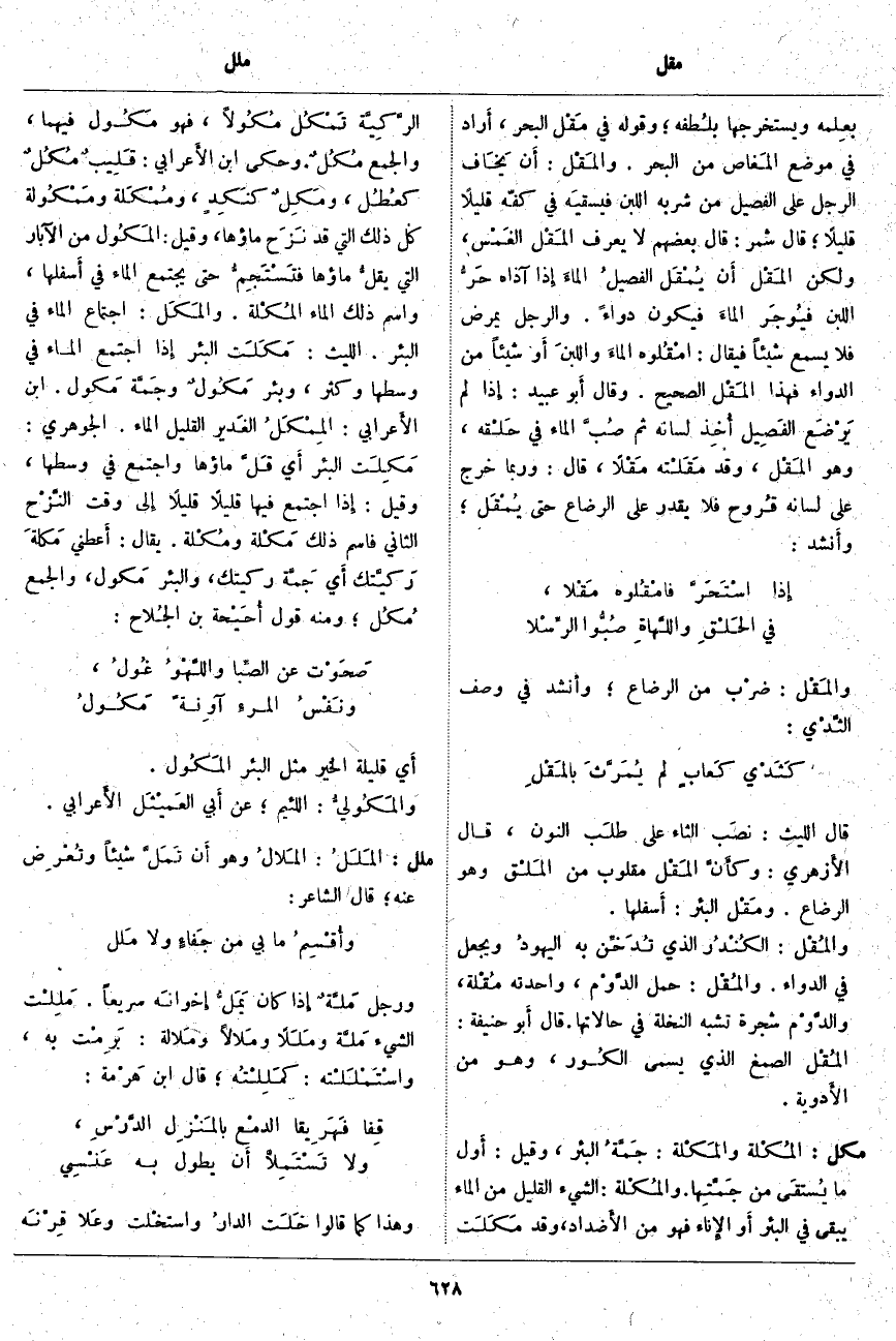 مكل: المُكْلَة والمَكْلَة: جَمَّةُ الْبِئْرِ، وَقِيلَ: أَول مَا يُستقَى مِنْ جَمَّتِها. والمُكْلَة: الشَّيْءُ الْقَلِيلُ مِنَ الْمَاءِ يَبْقَى فِي الْبِئْرِ أَو الإِناء فَهُوَ مِنْ الأَضداد، وَقَدْ مَكَلَتِ الرَّكِيَّة تَمْكُلُ مُكُولًا، فَهُوَ مَكُول فِيهِمَا، وَالْجَمْعُ مُكُلٌ. وَحَكَى ابْنُ الأَعرابي: قَلِيبٌ مُكُلٌ كعُطُل، ومَكِلٌ كنَكِدٍ، ومُمْكَلَة ومَمْكُولَة كُلُّ ذَلِكَ الَّتِي قَدْ نَزَح مَاؤُهَا، وَقِيلَ: المَكُول مِنَ الْآبَارِ الَّتِي يقلُّ مَاؤُهَا فتَسْتَجِمُّ حَتَّى يَجْتَمِعَ الْمَاءُ فِي أَسفلها، وَاسْمُ ذَلِكَ الْمَاءِ المُكْلَة. والمَكَل: اجْتِمَاعُ الْمَاءِ فِي الْبِئْرِ. اللَّيْثُ: مَكَلَتِ الْبِئْرُ إِذَا اجْتَمَعَ الْمَاءُ فِي وَسَطِهَا وَكَثُرَ، وَبِئْرٌ مَكُولٌ وجَمَّة مَكُول. ابْنُ الأَعرابي: المِمْكَلُ الغَدير الْقَلِيلُ الْمَاءِ. الْجَوْهَرِيُّ: مَكِلَت الْبِئْرُ أَي قَلَّ مَاؤُهَا وَاجْتَمَعَ فِي وَسَطِهَا، وَقِيلَ: إِذا اجْتَمَعَ فِيهَا قَلِيلًا قَلِيلًا إِلى وَقْتِ النَّزْح الثَّانِي فَاسْمُ ذَلِكَ مَكْلَة ومُكْلَة. يُقَالُ: أَعْطني مكلَةَ رَكيَّتك أَي جَمَّة رَكِيَّتِكَ، وَالْبِئْرُ مَكُول، وَالْجَمْعُ مُكُل؛ وَمِنْهُ قَوْلُ أُحَيْحة بْنِ الجُلاح:
