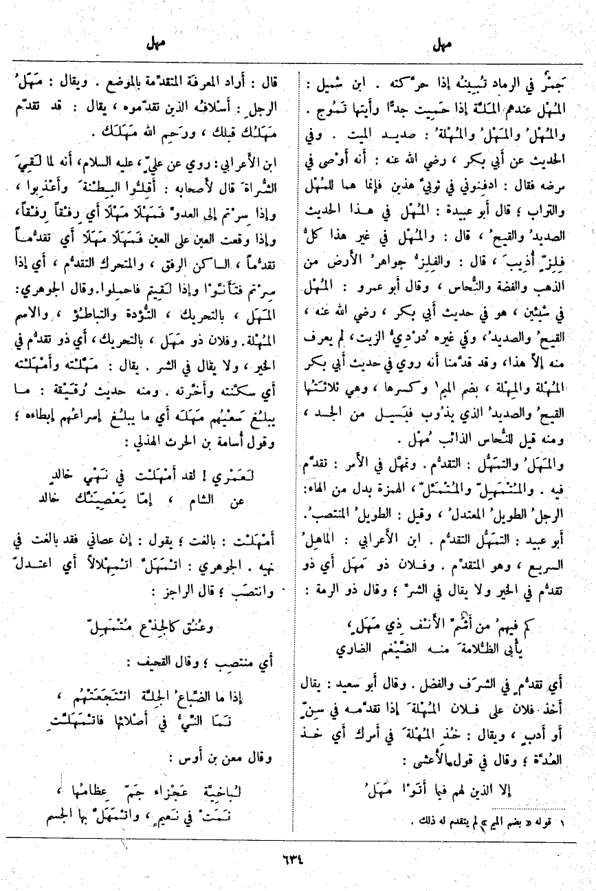 ؛ قَالَ أَبو عُبَيْدَةَ: المُهْل فِي هَذَا الْحَدِيثِ الصديدُ والقيحُ، قَالَ: والمُهْل فِي غَيْرِ هَذَا كلُّ فِلِزٍّ أُذِيبَ، قَالَ: والفِلِزُّ جواهرُ الأَرض مِنَ الذَّهَبِ وَالْفِضَّةِ والنُّحاس، وَقَالَ أَبو عَمْرٍو: المُهْل فِي شَيْئَيْنِ، هُوَ فِي حَدِيثِ أَبي بَكْرٍ، رَضِيَ اللَّهُ عَنْهُ، القيحُ والصديدُ، وَفِي غَيْرِهِ دُرْدِيُّ الزَّيْتِ، لَمْ يُعْرَفْ مِنْهُ إِلَّا هَذَا، وَقَدْ قدَّمنا أَنه رُوِيَ فِي حَدِيثِ أَبي بَكْرٍ المُهْلة والمِهْلة، بِضَمِّ الْمِيمِ «1» وَكَسْرِهَا، وَهِيَ ثلاثَتُها القيحُ والصديدُ الَّذِي يذُوب فيَسيل مِنَ الْجَسَدِ، وَمِنْهُ قِيلَ للنُّحاس الذَّائِبِ مُهْل. والمَهَلُ والتمَهُّل: التقدُّم. وتَمَهَّلَ فِي الأَمر: تقدَّم فِيهِ. والمُتْمَهِلّ والمُتْمَئلّ، الْهَمْزَةُ بَدَلٌ مِنَ الْهَاءِ: الرجلُ الطويلُ المعتدلُ، وَقِيلَ: الطويلُ المنتصبُ. أَبو عُبَيْدٍ: التَّمَهُّل التقدُّم. ابْنُ الأَعرابي: المَاهِلُ السَّرِيعُ، وَهُوَ المتقدِّم. وَفُلَانٌ ذُو مَهَل أَي ذُو تقدُّم فِي الْخَيْرِ وَلَا يُقَالُ فِي الشرِّ؛ وَقَالَ ذُو الرُّمَّةِ: