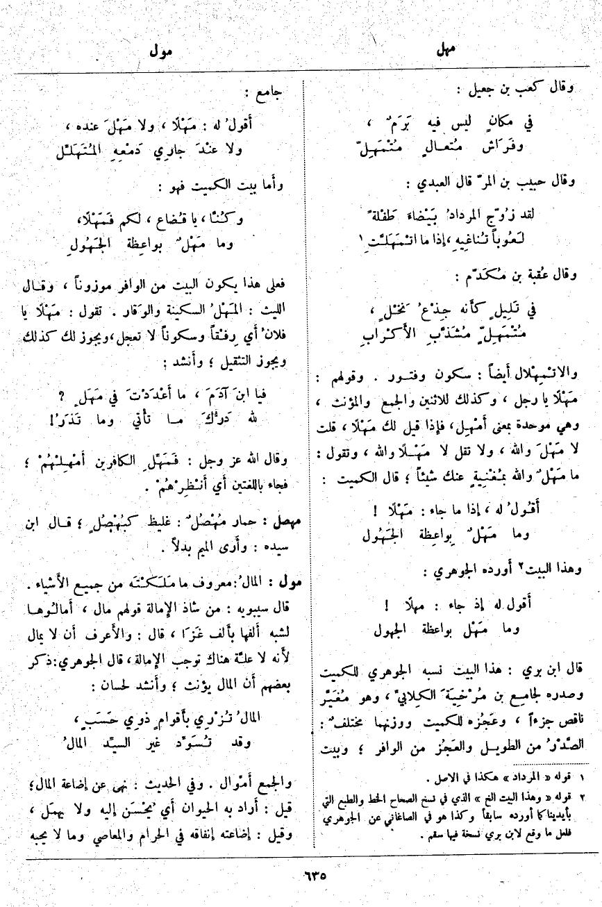 فَعَلَى هَذَا يَكُونَ الْبَيْتُ مِنَ الْوَافِرِ مَوْزُونًا، وَقَالَ اللَّيْثُ: المَهْلُ السَّكِينَةُ والوَقار. تَقُولُ: مَهْلًا يَا فلانُ أَي رِفْقاً وَسُكُونًا لَا تَعْجَلُ، وَيَجُوزُ لَكَ كَذَلِكَ وَيَجُوزُ التَّثْقِيلُ؛ وأَنشد: