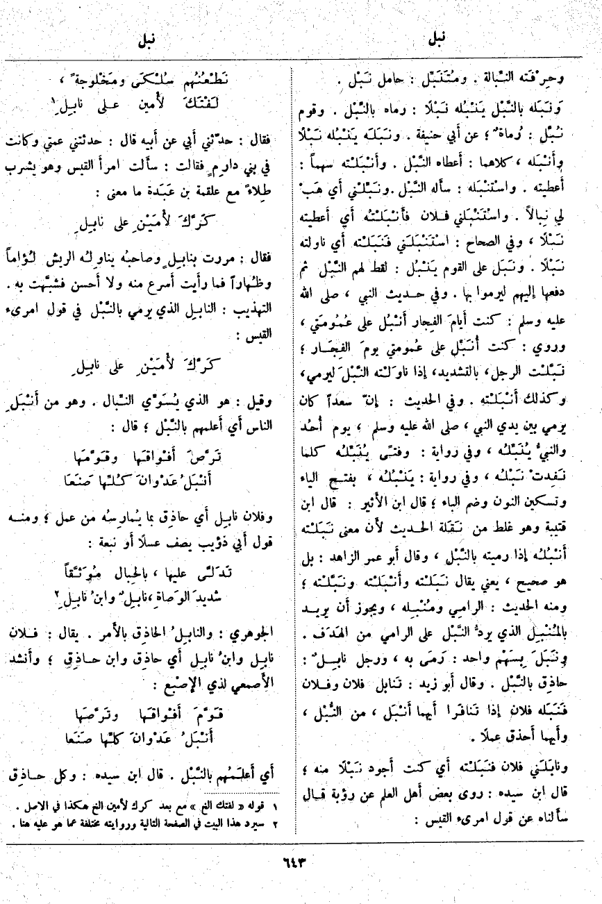 ، وَيَجُوزُ أَن يُرِيدَ بالمُنْبِل الَّذِي يردُّ النَّبْل عَلَى الرَّامِي مِنَ الهَدَف. ونَبَلَ بِسَهْم وَاحِدٍ: رَمَى بِهِ، وَرَجُلٌ نَابِلٌ: حاذِق بالنَّبْل. وَقَالَ أَبو زَيْدٍ: تَنَابَلَ فُلَانٌ وَفُلَانٌ فَنَبَلَه فُلَانٌ إِذا تَنافَرا أَيهما أَنْبَل، مِنَ النُّبْل، وأَيهما أَحذق عَمَلًا. ونَابَلَني فُلَانٌ فنَبَلْتُه أَي كُنْتُ أَجود نَبْلًا مِنْهُ؛ قَالَ ابْنُ سِيدَهْ: رَوَى بَعْضُ أَهل الْعِلْمِ عَنْ رُؤْبَةَ قَالَ سأَلناه عَنْ قَوْلِ امْرِئِ الْقَيْسِ: