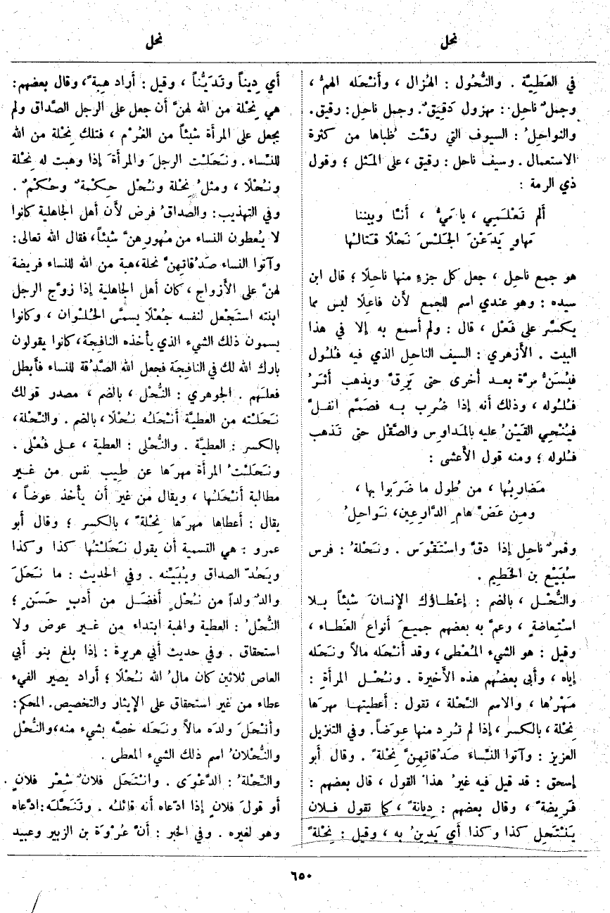 وقمرٌ نَاحِل إِذا دقَّ واسْتَقْوَس. ونَحْلةُ: فَرَسُ سُبَيْع بْنِ الخَطِيم. والنُّحْل، بِالضَّمِّ: إِعْطاؤُك الإِنسانَ شَيْئًا بِلَا اسْتِعاضةٍ، وعمَّ بِهِ بَعْضُهُمْ جميعَ أَنواع العَطاء، وَقِيلَ: هُوَ الشَّيْءُ المُعْطى، وَقَدْ أَنْحَلَه مَالًا ونَحَلَه إِياه، وأَبى بعضُهم هَذِهِ الأَخيرة. ونُحْل المرأَةِ: مَهْرُها، وَالِاسْمُ النِّحْلَة، تَقُولُ: أَعطيتها مهرَها نِحْلَة، بِالْكَسْرِ، إِذا لَمْ تُرِد مِنْهَا عِوَضاً. وَفِي التَّنْزِيلِ الْعَزِيزِ: وَآتُوا النِّساءَ صَدُقاتِهِنَّ نِحْلَةً