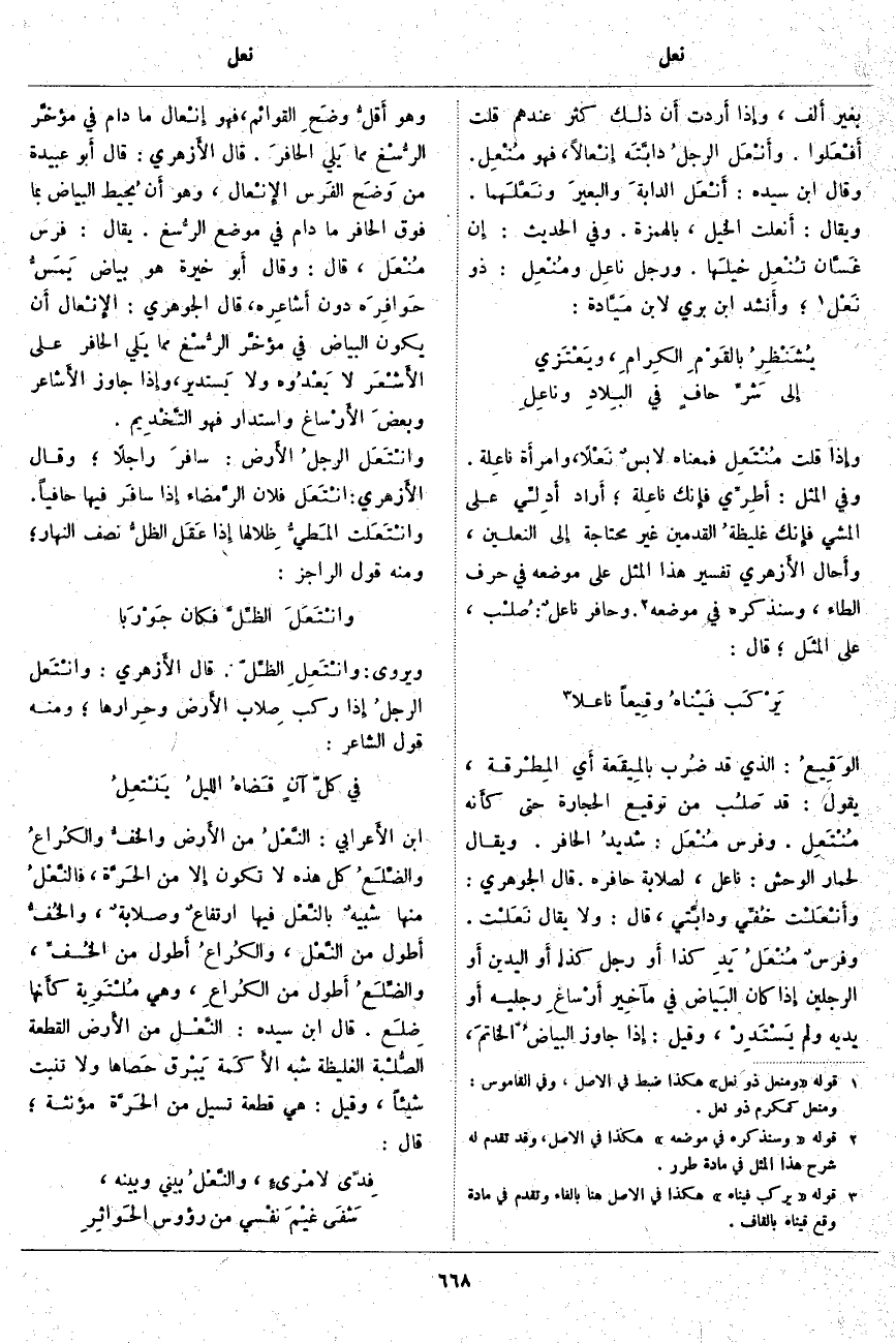 وإِذا قُلْتَ مُنْتَعِل فَمَعْنَاهُ لابسٌ نَعْلًا، وامرأَة نَاعِلَة. وَفِي الْمَثَلِ: أَطِرِّي فإِنك نَاعِلَة؛ أَراد أَدِلِّي عَلَى الْمَشْيِ فإِنك غليظةُ الْقَدَمَيْنِ غَيْرُ مُحْتَاجَةٍ إِلى النَّعْلَيْنِ، وأَحال الأَزهري تَفْسِيرَ هَذَا الْمَثَلِ عَلَى مَوْضِعِهِ فِي حَرْفِ الطَّاءِ، وَسَنَذْكُرُهُ فِي مَوْضِعِهِ «2». وَحَافِرٌ نَاعِلٌ: صُلْب، عَلَى المثَل؛ قَالَ: