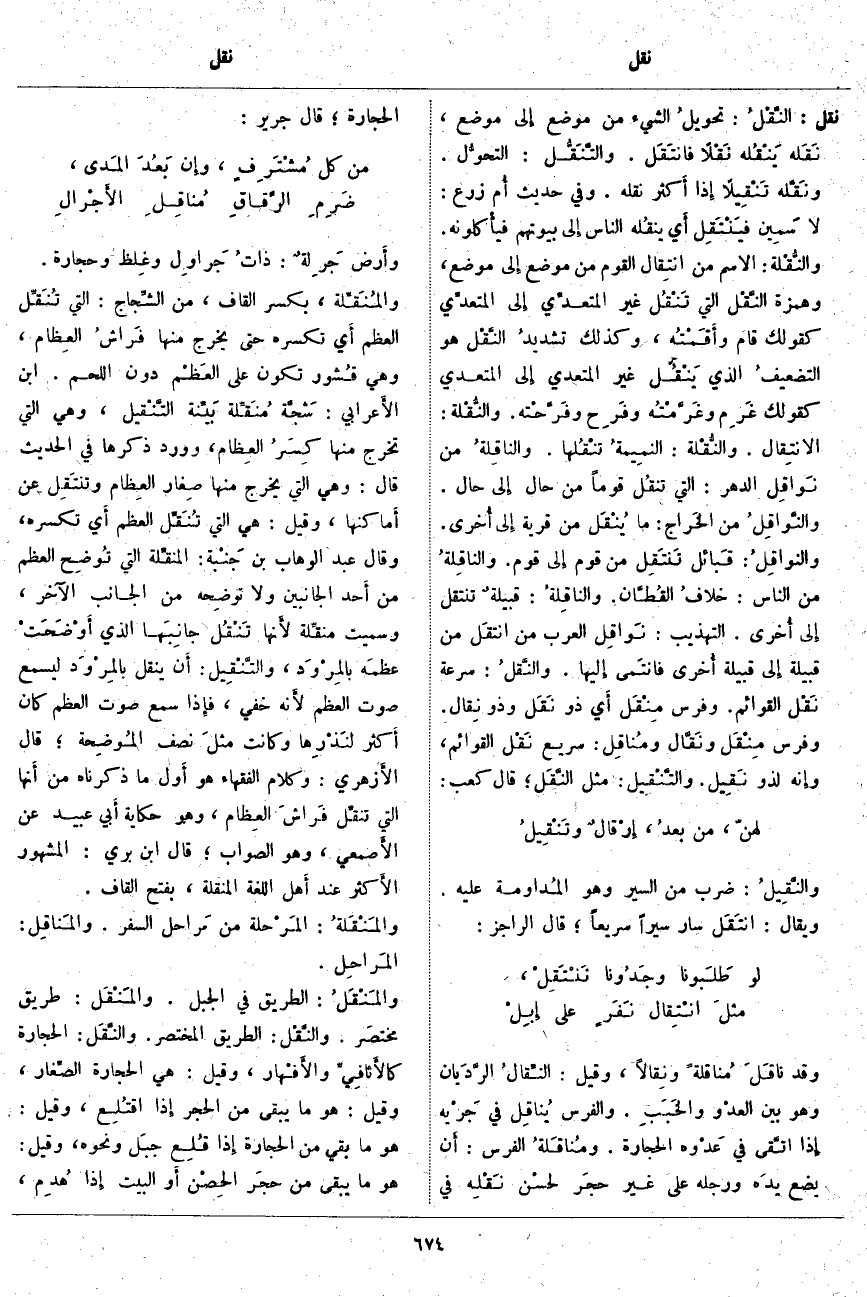 نقل: النَّقْلُ: تحويلُ الشَّيْءِ مِنْ مَوْضِعٍ إِلى مَوْضِعٍ، نَقَله يَنْقُلُه نَقْلًا فانْتَقَلَ. والتَّنَقُّل: التحوُّل. ونَقَّلَه تَنْقِيلًا إِذا أَكثر نَقْلَهُ. وَفِي حَدِيثِ