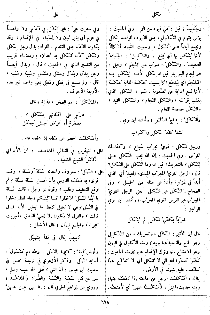 ، بِمَعْنَى القُيود، الْوَاحِدُ نِكْل وَيُجْمَعُ أَيضاً عَلَى أَنْكَال، وَسُمِّيَتِ الْقُيُودُ أَنْكَالًا لأَنها يُنْكَل بِهَا أَي يُمنع. والنَّاكِلُ: الجَبانُ الضعيفُ. والنِّكْلُ: ضرْب مِنَ اللُّجُم، وَقِيلَ: هُوَ لِجام البَرِيدِ قِيلَ لَهُ نِكْل لأَنه يُنْكَل بِهِ المُلْجَم أَي يُدفَع، كَمَا سُمِّيَتْ حَكَمة الدَّابَّةِ حَكَمَة لأَنها تَمْنَعُ الدَّابَّةَ عَنِ الصُّعوبة. شَمِرٌ: النِّكْل الَّذِي يَغْلِبُ قِرْنَه، والنِّكْل اللِّجام، والنِّكْل الْقَيْدُ، والنِّكْل حَدِيدَةُ اللِّجَامِ. والنَّكَلُ: عِناجُ الدَّلْوِ؛ وأَنشد ابْنُ بَرِّيٍّ: