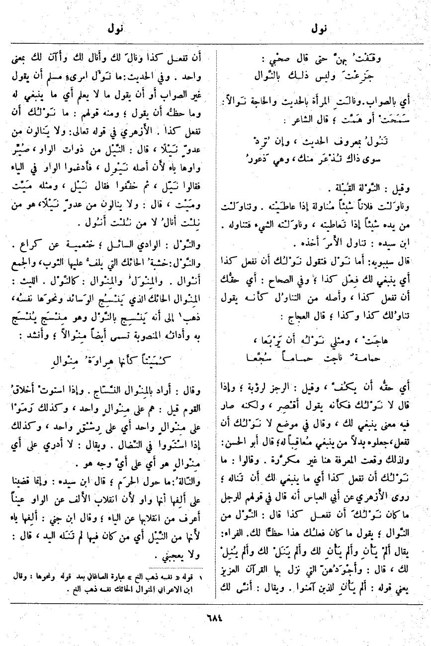 وَقِيلَ: النَّوْلَة القُبْلة. ونَاوَلْت فُلَانًا شَيْئًا مُنَاوَلَة إِذا عاطَيْته. وتَنَاوَلْت مِنْ يَدِهِ شَيْئًا إِذا تَعاطيته، ونَاوَلْته الشيءَ فتَنَاوَلَهُ. ابْنُ سِيدَهْ: تَنَاوَلَ الأَمرَ أَخذه. قَالَ سِيبَوَيْهِ: أَما نَوْل فَتَقُولُ نَوْلُك أَن تَفْعَلَ كَذَا أَي يَنْبَغِي لَكَ فِعْل كَذَا؛ وَفِي الصِّحَاحِ: أَي حقُّك أَن تَفْعَلَ كَذَا، وأَصله مِنَ التناوُل كأَنه يَقُولُ تناوُلك كَذَا وَكَذَا؛ قَالَ الْعَجَّاجُ: