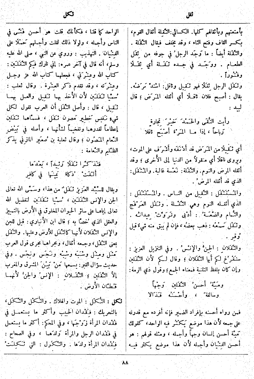 ثكل: الثُّكْل: الْمَوْتُ وَالْهَلَاكُ. والثُّكْل والثَّكَل، بِالتَّحْرِيكِ: فِقْدان [فُقْدان] الْحَبِيبِ وأَكثر مَا يُسْتَعْمَلُ فِي فُقْدان المرأَة زَوْجَها، وَفِي الْمُحْكَمِ: أَكثر مَا يُسْتَعْمَلُ فِي فُقْدان الرَّجُلِ والمرأَة وَلدَهما، وَفِي الصحاح: فِقْدان [فُقْدان] المرأَة ولدَها. والثَّكُول: الَّتِي ثَكِلَتْ