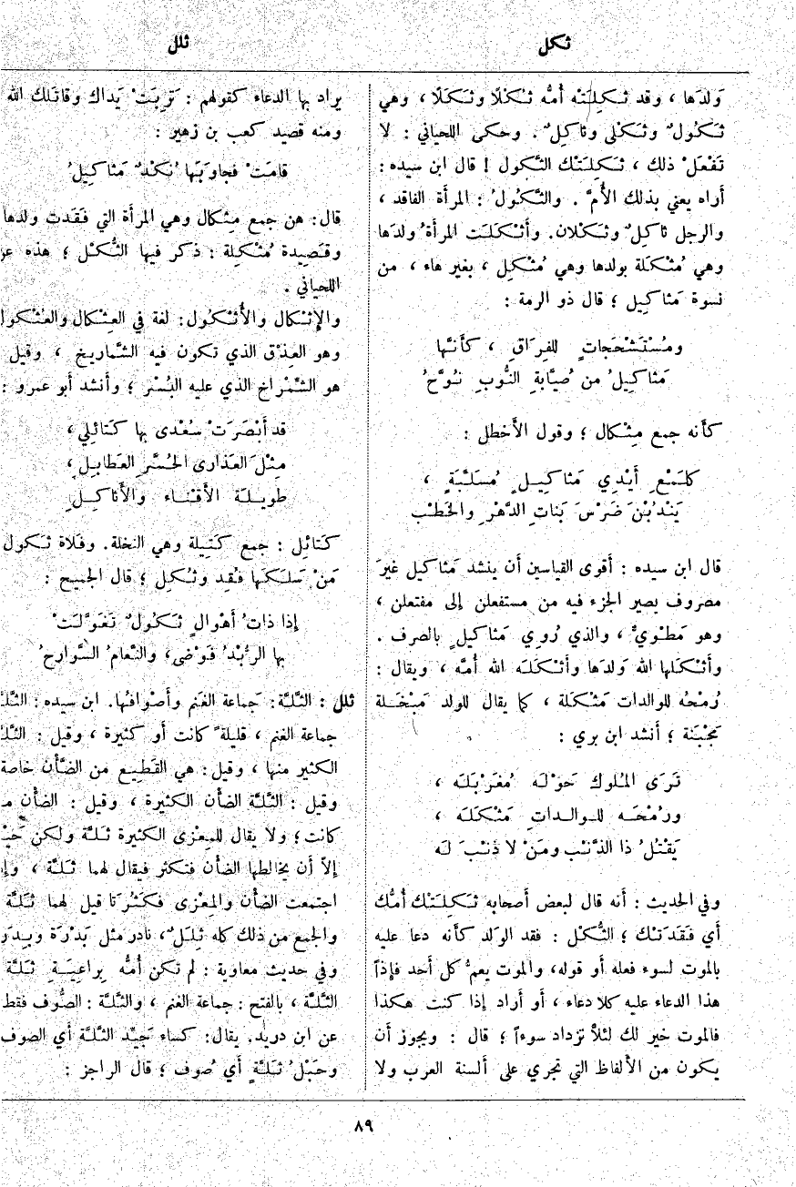قَالَ ابْنُ سِيدَهْ: أَقوى الْقِيَاسَيْنِ أَن يُنْشَدَ مَثاكِيل غيرَ مَصْرُوفٍ يَصِيرُ الْجُزْءُ فِيهِ مِنْ مُسْتَفْعِلُنْ إِلى مُفْتَعِلُنْ، وَهُوَ مَطْويٌّ، وَالَّذِي رُوِي مَثاكِيلٍ بِالصَّرْفِ. وأَثْكَلَهَا اللَّهُ وَلدَها وأَثْكَلَه اللَّهُ أُمَّه، وَيُقَالُ: رُمْحُه لِلْوَالِدَاتِ مَثْكَلَة، كَمَا يُقَالُ لِلْوَلَدِ مَبْخَلة مَجْبَنة؛ أَنشد ابْنُ بَرِّيٍّ: