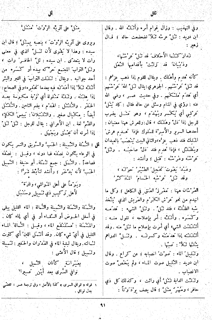 العُرْشان هَاهُنَا: مَغْرِزُ العُنقِ فِي الْكَاهِلِ؛ وَكُلُّ مَا انْهَدَمَ مِنْ نَحْوِ عَرْش الكَرْم والعَريش الَّذِي يُتَّخذ شِبه الظُّلَّة، فَقَدْ ثُلَّ. وثَلَّ الشَّيْءَ: هَدَمه وكَسَره. وأَثَلَّه: أَمر بِإِصْلَاحِهِ، تَقُولُ مِنْهُ: أَثْلَلْت الشيءَ أَي أَمرت بإِصلاح مَا ثُلَّ مِنْهُ. وَقَدْ أَثْلَلْته إِذا هَدَمْتَه وكسرتَه. وثَلَّ الدَّرَاهِمَ يَثُلُّها ثَلًّا: صَبَّها. وثَلِيلُ الْمَاءِ: صَوْت انْصِبَابِهِ؛ عَنْ كُرَاعٍ. وَقَالَ ابْنُ دُرَيْدٍ: الثَّلِيل صَوْتُ الْمَاءِ، وَلَمْ يَخُصَّ صَوْتَ الِانْصِبَابِ. وثَلَّت الدَّابَّةُ تَثُلُّ أَي رَاثَتْ، وَكَذَلِكَ كَلُّ ذِي حَافِرٍ، ومُهْرٌ مِثَلٌّ؛ قَالَ يَصِفُ بِرْذَوْناً: