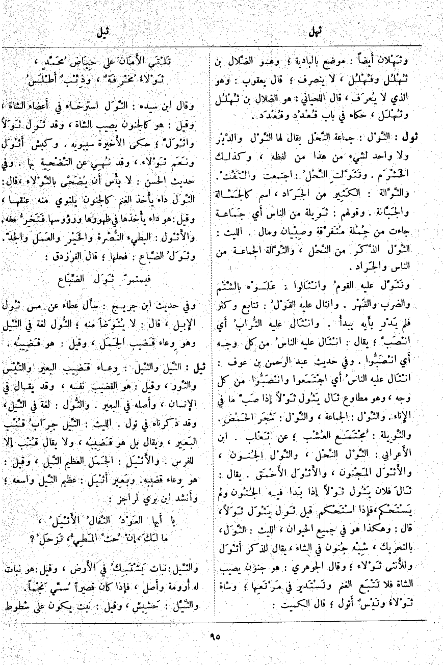 ثول: الثَّوْل: جَمَاعَةُ النَّحْل يُقَالُ لَهَا الثَّوْل والدَّبْر وَلَا وَاحِدَ لِشَيْءٍ مِنْ هَذَا مِنْ لَفْظِهِ، وَكَذَلِكَ الخَشْرَم. وتَثَوَّلتِ النَّحْلُ: اجْتَمَعَتْ والْتَفَّتْ. والثَّوَّالَة: الكَثِير مِنَ الجَرَاد، اسْمٌ كالجَمَّالة والجَبَّانة. وَقَوْلُهُمْ: ثَوِيلَة مِنَ النَّاسِ أَي جَمَاعة جَاءَتْ مِنْ جُمْلة مُتَفرِّقة وصِبْيان وَمَالٌ. اللَّيْثُ: الثَّوْل الذَّكَر مِنَ النَّحْل، والثَّوَّالة الْجَمَاعَةُ مِنَ النَّاسِ والجَراد. وتَثَوَّل عَلَيْهِ القومُ وانْثَالوا: عَلَوْه بالشَّتْم وَالضَّرْبِ والقَهْر. وانْثَالَ عَلَيْهِ القَوْلُ: تَتَابَعَ وَكَثُرَ فَلَمْ يَدْرِ بأَيِّهِ يبدأُ. وانْثَال عَلَيْهِ التُّرابُ أَي انْصَبَّ؛ يُقَالُ: انْثَال عَلَيْهِ الناسُ مِنْ كُلِّ وَجْهٍ أَي انْصَبُّوا. وَفِي حَدِيثِ