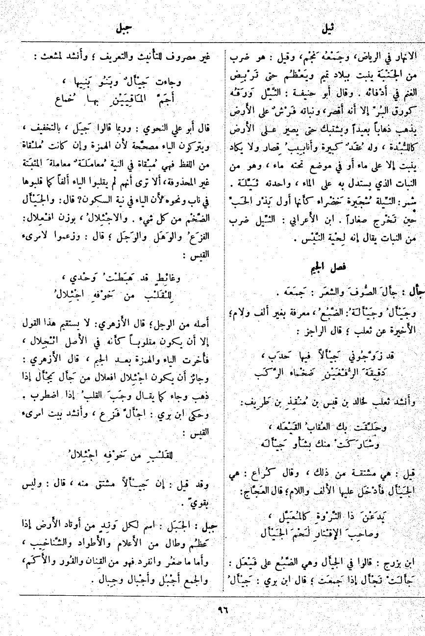 جبل: الجَبَل: اسْمٌ لِكُلِّ وَتِدٍ مِنْ أَوتاد الأَرض إِذا عَظُم وَطَالَ مِنَ الأَعلام والأَطواد والشَّناخِيب، وأَما مَا صغُر وَانْفَرَدَ فَهُوَ مِنَ القِنان والقُور والأَكَم، وَالْجَمْعُ أَجْبُل وأَجْبَال وجِبَال.