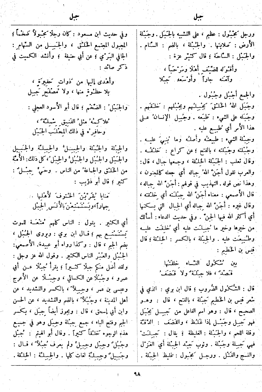؛ المَجْبُول الْمُجْتَمِعُ الخَلْق، والجَبِل مِنَ السِّهامِ: الْجَافِي البَرْي؛ عَنْ أَبي حَنِيفَةَ؛ وأَنشد الْكُمَيْتُ فِي ذِكْرِ صَائِدٍ: