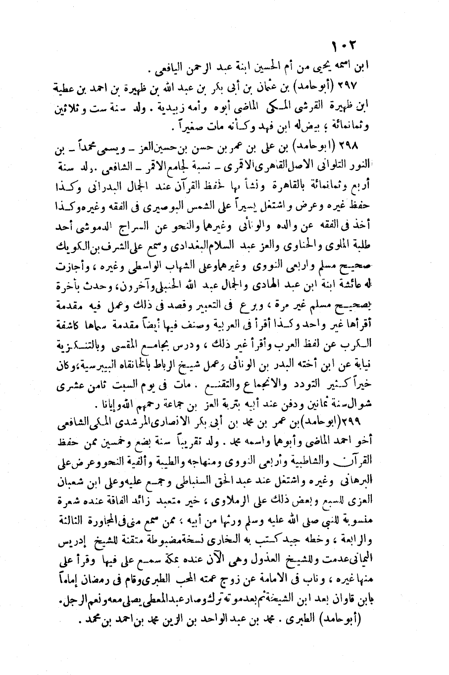 ورثهَا من أَبِيه مِمَّن سمع مني فِي الْمُجَاورَة الثَّالِثَة وَالرَّابِعَة وخطه جيد كتب بِهِ البُخَارِيّ نُسْخَة مضبوطة متقنة للشَّيْخ إِدْرِيس الْيَمَانِيّ عدمت وللشيخ العذول وَهِي الْآن عِنْده بِمَكَّة سمع عَليّ فِيهَا وَقَرَأَ عَليّ مِنْهَا غَيره وناب فِي الْإِمَامَة عَن زوج عمته الْمُحب الطَّبَرِيّ وَقَامَ فِي رَمَضَان إِمَامًا بِابْن قاوان بعد ابْن الشيخة ثمَّ بعد مَوته ترك وَصَارَ عبد الْمُعْطِي يُصَلِّي مَعَه وَنعم الرجل (أَبُو حَامِد) الطَّبَرِيّ مُحَمَّد بن عبد الْوَاحِد بن الزين مُحَمَّد بن أَحْمد بن مُحَمَّد