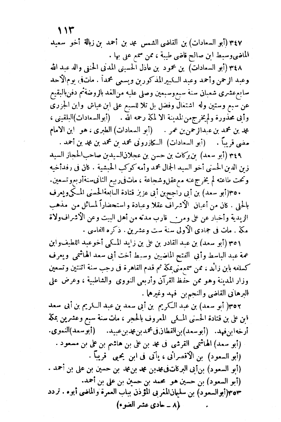 347 - (أَبُو السعادات) بن القَاضِي الشَّمْس مُحَمَّد بن أَحْمد بن زبالة أَخُو سعيد الْمَاضِي وسبط ابْن صَالح قَاضِي طيبَة مِمَّن سمع عَليّ بهَا 34 {أَبُو السعادات) بن مَحْمُود بن عاذل الْحُسَيْنِي الْمدنِي الْحَنَفِيّ وَالِد عبد الله وَعبد الرَّحْمَن وَأحمد وَعبد الْكَبِير الْمَذْكُورين وَيُسمى مُحَمَّدًا مَاتَ فِي يَوْم الْأَحَد سَابِع عشري شعْبَان سنة سبع وَسبعين وَصلى عَلَيْهِ من الْغَد بالروضة ثمَّ دفن بِالبَقِيعِ عَن سبع وَسِتِّينَ وَله اشْتِغَال وَفضل بل تَلا للسبع على ابْن عَيَّاش وَابْن الْجَزرِي وَأبي مَحْذُورَة وَلم يخرج من الْمَدِينَة إِلَّا لمَكَّة رَحمَه الله (أَبُو السعادات) البُلْقِينِيّ مُحَمَّد بن مُحَمَّد بن عبد الرَّحْمَن بن عمر (أَبُو السعادات) الطَّبَرِيّ هُوَ ابْن الإِمَام مضى قَرِيبا (أَبُو السعادات) الكازروني مُحَمَّد بن مُحَمَّد بن مُحَمَّد بن أَحْمد 349 (أَبُو سعد) بن بَرَكَات بن حسن بن عجلَان السَّيِّد بن صَاحب الْحجاز السَّيِّد زين الدّين الحسني أَخُو السَّيِّد الْجمال مُحَمَّد وَأمه كَوْكَب الحبشية كَانَ فِي رفد أَخِيه وَتَحْت طَاعَته لم يخرج عَنهُ مَعَ عقل وشجاعة مَاتَ فِي ربيع الثَّانِي سنة أَربع وَتِسْعين 350 (أَبُو سعد) بن أبي رَاجِح بن أبي عَزِيز قَتَادَة النَّابِغَة الحسني الْمَكِّيّ وَيعرف بالحلى كَانَ من أَعْيَان الْأَشْرَاف عقلا وَعبادَة واستحضارا لمسائل من مَذْهَب الزيدية وأخبار عَن عَليّ وَمن قَارب مدَّته من أهل الْبَيْت وَعَن الْأَشْرَاف وُلَاة مَكَّة مَاتَ فِي جُمَادَى الأولى سنة سِتّ وَعشْرين ذكره الفاسي 35 (أَبُو سعد) بن عبد الْقَادِر بن عَليّ بن زايد الْمَكِّيّ أَخُو عبد اللَّطِيف وَابْن عمَّة عبد الباسط وَأبي الْفَتْح الماضيين وسبط أُخْت أبي سعد الْهَاشِمِي وَيعرف كسلفه بِابْن زَائِد مِمَّن سمع مني بِمَكَّة ثمَّ قدم الْقَاهِرَة فِي رَجَب سنة اثْنَتَيْنِ وَتِسْعين وزار الْمَدِينَة وَهُوَ مِمَّن حفظ الْقُرْآن وأربعي النَّوَوِيّ والشاطبية وَعرض على البرهاني القَاضِي والنجم بن فَهد وَغَيرهمَا 35 (أَبُو سعد) بن عبد الْكَرِيم بن أبي سعد بن عبد الْكَرِيم بن أبي سعد بن عَليّ بن قَتَادَة الحسني الْمَكِّيّ الْمَعْرُوف بِالْحجرِ مَاتَ سنة سبع وَعشْرين بِمَكَّة أرخه ابْن فَهد (أَبُو سعد) بن الْقطَّان فِي مُحَمَّد بن مُحَمَّد بن عبيد (أَبُو سعد) النموي (أَبُو سعد) الْهَاشِمِي الْقرشِي فِي مُحَمَّد بن عَليّ بن هَاشم بن عَليّ بن مَسْعُود (أَبُو السُّعُود) بن الأقصرائي يَأْتِي فِي ابْن يحيى قَرِيبا (أَبُو السُّعُود) بن أبي البركات فِي مُحَمَّد بن مُحَمَّد بن مُحَمَّد بن حُسَيْن بن عَليّ بن أَحْمد (أَبُو السُّعُود) بن حُسَيْن هُوَ مُحَمَّد بن حُسَيْن بن عَليّ بن أَحْمد 353 (أَبُو السُّعُود) بن سُلَيْمَان المغربي الْمُؤَذّن بِبَاب الْعمرَة والماضي أَبوهُ تردد