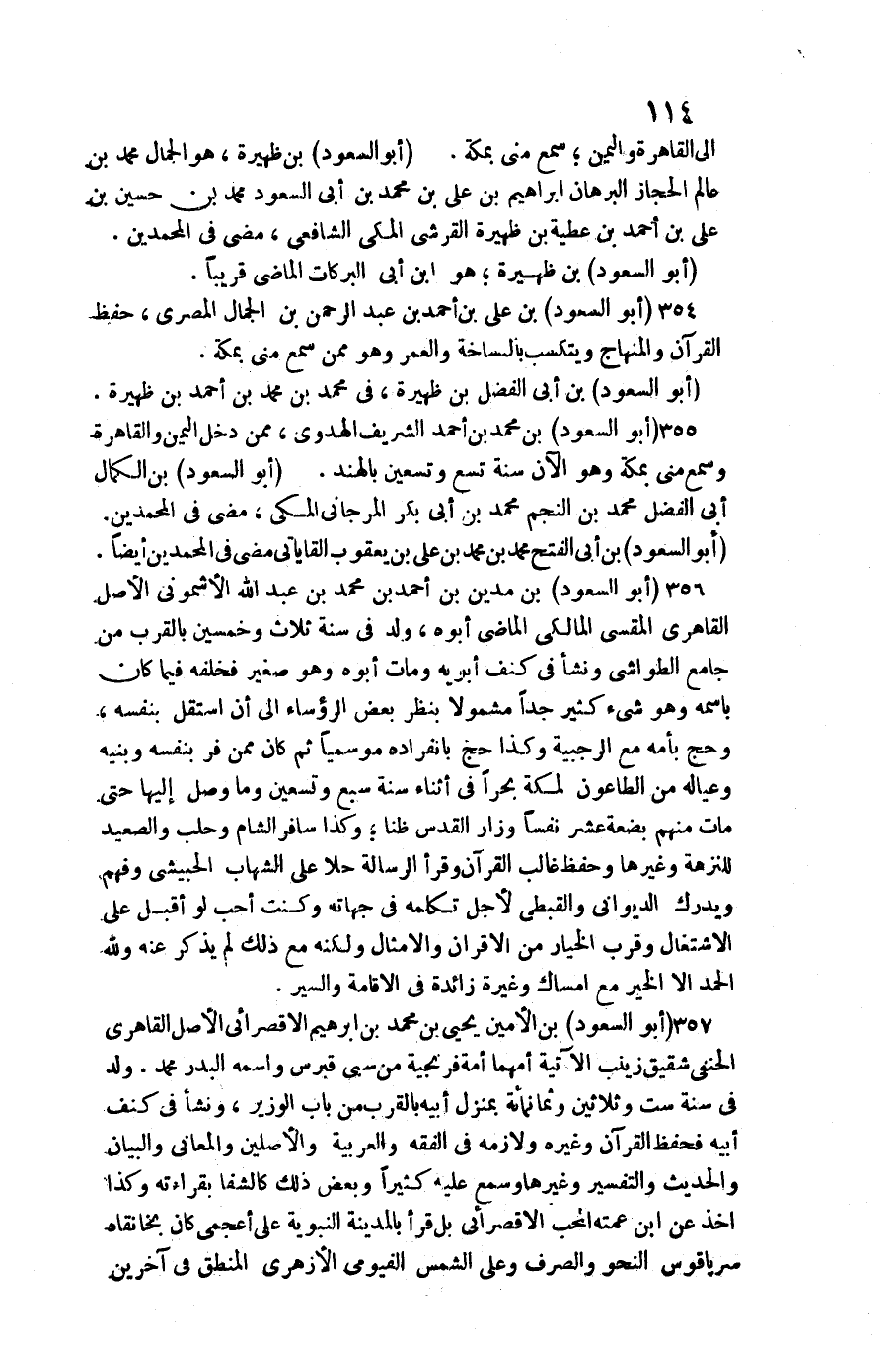 إِلَى الْقَاهِرَة واليمن سمع مني بِمَكَّة (أَبُو السُّعُود) بن ظهيرة هُوَ الْجمال مُحَمَّد بن عَالم الْحجاز الْبُرْهَان إِبْرَاهِيم بن عَليّ بن مُحَمَّد بن أبي السُّعُود مُحَمَّد بن حُسَيْن بن عَليّ بن أَحْمد بن عَطِيَّة بن ظهيرة الْقرشِي الْمَكِّيّ الشَّافِعِي مضى فِي المحمدين أَبُو السُّعُود بن ظهيرة هُوَ ابْن أبي البركات الْمَاضِي قَرِيبا 354 (أَبُو السُّعُود) بن عَليّ بن أَحْمد بن عبد الرَّحْمَن بن الْجمال الْمصْرِيّ حفظ الْقُرْآن والمنهاج ويتكسب بالنساخة والعمر وَهُوَ مِمَّن سمع مني بِمَكَّة (أَبُو السُّعُود) بن أبي الْفضل بن ظهيرة فِي مُحَمَّد بن مُحَمَّد بن أَحْمد بن ظهيرة 355 (أَبُو السُّعُود) بن مُحَمَّد بن أَحْمد الشريف الهدوي مِمَّن دخل الْيمن والقاهرة وَسمع مني بِمَكَّة وَهُوَ الْآن سنة تسع وَتِسْعين بِالْهِنْدِ (أَبُو السُّعُود) بن الْكَمَال أبي الْفضل مُحَمَّد بن النَّجْم مُحَمَّد بن أبي بكر الْمرْجَانِي الْمَكِّيّ مضى فِي المحمدين (أَبُو السُّعُود) بن أبي الْفَتْح مُحَمَّد بن مُحَمَّد بن عَليّ بن يَعْقُوب القاياتي مضى فِي المحمدين أَيْضا 356 (أَبُو السُّعُود) بن مَدين بن أَحْمد بن مُحَمَّد بن عبد الله الأشموني الأَصْل القاهري المقسي الْمَالِكِي الْمَاضِي أَبوهُ ولد فِي سنة ثَلَاث وَخمسين بِالْقربِ من جَامع الطواشي وَنَشَأ فِي كنف أَبوهُ وَمَات أَبوهُ وَهُوَ صَغِير فخلفه فِيمَا كَانَ باسمه وَهُوَ شَيْء كثير جدا مشمولا بِنَظَر بعض الرؤساء إِلَى أَن اسْتَقل بِنَفسِهِ وَحج بِأُمِّهِ مَعَ الرجبية وَكَذَا حج بِانْفِرَادِهِ موسميا ثمَّ كَانَ مِمَّن فر بِنَفسِهِ وبنيه وَعِيَاله من الطَّاعُون لمَكَّة بحرا فِي أثْنَاء سنة سبع وَتِسْعين وَمَا وصل إِلَيْهَا حَتَّى مَاتَ مِنْهُم بضعَة عشر نفسا وزار الْقُدس ظنا وَكَذَا سَافر الشَّام وحلب والصعيد للنزهة وَغَيرهَا وَحفظ غَالب الْقُرْآن وَقَرَأَ الرسَالَة حلا على الشهَاب الحبيشي وَفهم وَيدْرك الديواني والقبطي لأجل تكَلمه فِي جهاته وَكنت أحب لَو أقبل على الِاشْتِغَال وَقرب الْخِيَار من الأقران والأمثال وَلكنه مَعَ ذَلِك لم يذكر عَنهُ وَللَّه الْحَمد إِلَّا الْخَيْر مَعَ إمْسَاك وغيرة زَائِدَة فِي الْإِقَامَة وَالسير 357 (أَبُو السُّعُود) بن الْأمين يحيى بن مُحَمَّد بن إِبْرَاهِيم الأقصرائي الأَصْل القاهري الْحَنَفِيّ شَقِيق زَيْنَب الْآتِيَة أمهما أمة فرنجية من سبي قبرس واسْمه الْبَدْر مُحَمَّد ولد فِي سنة سِتّ وَثَلَاثِينَ وَثَمَانمِائَة بمنزل أَبِيه بِالْقربِ من بَاب الْوَزير وَنَشَأ فِي كنف أَبِيه فحفظ الْقُرْآن وَغَيره ولازمه فِي الْفِقْه والعربية والأصلين والمعاني وَالْبَيَان والْحَدِيث وَالتَّفْسِير وَغَيرهَا وَسمع عَلَيْهِ كثيرا وَبَعض ذَلِك كالشفا بقرَاءَته وَكَذَا أَخذ عَن ابْن عمته الْمُحب الأقصرائي بل قَرَأَ بِالْمَدِينَةِ النَّبَوِيَّة على أعجمي كَانَ بخانقاه سرياقوس النَّحْو وَالصرْف وعَلى الشَّمْس الفيومي الْأَزْهَرِي الْمنطق فِي آخَرين