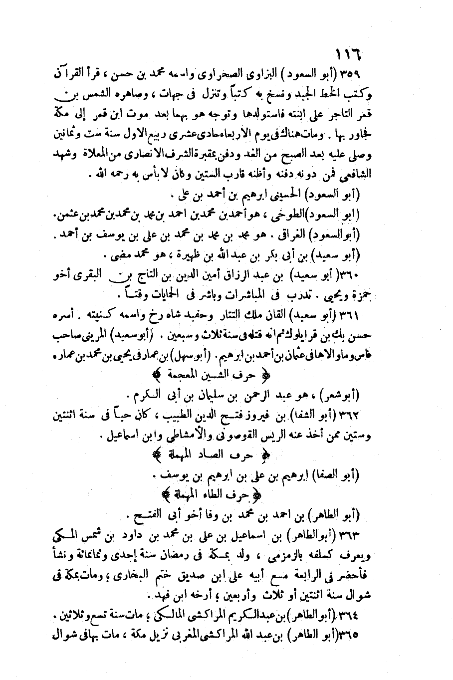 359 - (أَبُو السُّعُود) البزاوي الصحراوي واسْمه مُحَمَّد بن حسن قَرَأَ الْقُرْآن وَكتب الْخط الْجيد وَنسخ بِهِ كتبا وتنزل فِي جِهَات وصاهره الشَّمْس بن قمر التَّاجِر على ابْنَته فاستولدها وَتوجه هُوَ بهما بعد موت ابْن قمر إِلَى مَكَّة فجاور بهَا وَمَات هُنَاكَ فِي يَوْم الْأَرْبَعَاء حادي عشرى ربيع الأول سنة سِتّ وَثَمَانِينَ وَصلى عَلَيْهِ بعد الصُّبْح من الْغَد وَدفن بمقبرة الشّرف الْأنْصَارِيّ من المعلاة وَشهد الشَّافِعِي فَمن دونه دَفنه وَأَظنهُ قَارب السِّتين وَكَانَ لَا بَأْس بِهِ رَحمَه الله (أَبُو السُّعُود) الْحُسَيْنِي إِبْرَاهِيم بن أَحْمد بن عَليّ (أَبُو السُّعُود) الطوخي هُوَ أَحْمد بن مُحَمَّد بن أَحْمد بن مُحَمَّد بن مُحَمَّد بن مُحَمَّد بن عُثْمَان (أَبُو السُّعُود) الغراقي هُوَ مُحَمَّد بن مُحَمَّد بن مُحَمَّد بن عَليّ بن يُوسُف بن أَحْمد (أَبُو سعيد) بن أبي بكر بن عبد الله بن ظهيرة هُوَ مُحَمَّد مضى 360 (أَبُو سعيد) بن عبد الرَّزَّاق أَمِين الدّين بن التَّاج بن البقري أَخُو حَمْزَة وَيحيى تدرب فِي المباشرات وباشر فِي الحمايات وقتا 36 (أَبُو سعيد) القان ملك التتار وحفيد شاه رخ واسْمه كنيته أسره حسن بك بن قرايلوك ثمَّ أَنه قَتله فِي سنة ثَلَاث وَسبعين (أَبُو سعيد) المريني صَاحب فاس وَمَا والاها فِي عُثْمَان بن أَحْمد بن إِبْرَاهِيم (أَبُو سهل) بن عمار فِي يحيى بن مُحَمَّد بن عمار