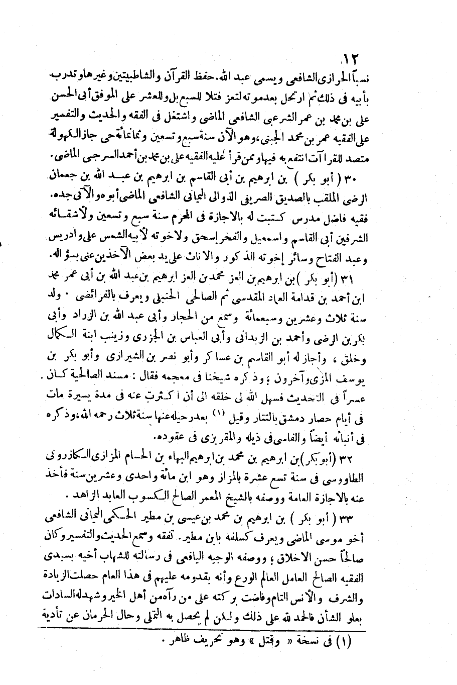 نسبا الْحرَازِي الشَّافِعِي وَيُسمى عبد الله حفظ الْقُرْآن والشاطبيتين وَغَيرهَا وتدرب بِأَبِيهِ فِي ذَلِك ثمَّ ارتحل بعد مَوته لتعز فَتلا للسبع بل وللعشر على الْمُوَافق أبي الْحسن على بن مُحَمَّد بن مُحَمَّد بن عمر الشرعبي الشَّافِعِي الْمَاضِي واشتغل فِي الْفِقْه والْحَدِيث وَالتَّفْسِير على الْفَقِيه عمر بن مُحَمَّد الجبني وَهُوَ الْآن سنة سبع وَتِسْعين وَثَمَانمِائَة حَيّ جَازَ الكهولة متصد للقراءات انتفق بِهِ فِيهَا وَمِمَّنْ قَرَأَ عَلَيْهِ الْفَقِيه عَليّ بن مُحَمَّد بن أَحْمد السرجي الْمَاضِي 30 (أَبُو بكر) بن إِبْرَاهِيم بن أبي الْقَاسِم بن إِبْرَاهِيم بن عبد الله بن جعمان الرضي الملقب بِالصديقِ السريفي الذوالي الْيَمَانِيّ الشَّافِعِي الْمَاضِي أَبوهُ والآتي جده فَقِيه فَاضل مدرس كتبت لَهُ بِالْإِجَازَةِ فِي الْمحرم سنة سبع وَتِسْعين ولأشقائه الشرفين أبي الْقَاسِم وَإِسْمَاعِيل وَالْفَخْر إِسْحَق ولأخوته لِأَبِيهِ الشَّمْس عَليّ وَإِدْرِيس وَعبد الفتاح وَسَائِر إخْوَته الذُّكُور وَالْإِنَاث على يَد بعض الآخذين عني بسؤاله 3 (أَبُو بكر) بن إِبْرَاهِيم بن الْعِزّ مُحَمَّد بن الْعِزّ إِبْرَاهِيم بن عبد الله بن أبي عمر مُحَمَّد ابْن أَحْمد بن قدامَة الْعِمَاد الْمَقْدِسِي ثمَّ الصَّالِحِي الْحَنْبَلِيّ وَيعرف بالفرائضي ولد سنة ثَلَاث وَعشْرين وَسَبْعمائة وَسمع من الحجار وَأبي عبد الله بن الزراد وَأبي بكر بن الرضى وَأحمد بن الزبداني وَأبي الْعَبَّاس بن الْجَزرِي وَزَيْنَب ابْنة الْكَمَال وَخلق وَأَجَازَ لَهُ أَبُو الْقَاسِم بن عَسَاكِر وَأَبُو نصر بن الشِّيرَازِيّ وَأَبُو بكر بن يُوسُف الْمزي وَآخَرُونَ وَذكره شَيخنَا فِي مُعْجَمه فَقَالَ مُسْند الصالحية كَانَ عسرا فِي التحديث فسهل الله لي خلقه إِلَى أَن أكثرت عَنهُ فِي مُدَّة يسيرَة مَاتَ فِي أَيَّام حِصَار دمشق بالتتار وَقيل بعد رحيله عَنْهَا سنة ثَلَاث رَحمَه الله وَذكره فِي أنبائه أَيْضا والفاسي فِي ذيله والمقريزي فِي عقوده 3 (أَبُو بكر) بن إِبْرَاهِيم بن مُحَمَّد بن إِبْرَاهِيم الْبَهَاء بن الحسام المزازي الكازروني الطاووسي فِي سنة تسع عشرَة بالمزاز وَهُوَ ابْن مائَة وَإِحْدَى وَعشْرين سنة فَأخذ عَنهُ بِالْإِجَازَةِ الْعَامَّة وَوَصفه بالشيخ المعمر الصَّالح الكسوب العابد الزَّاهِد 33 (أَبُو بكر) بن إِبْرَاهِيم بن مُحَمَّد بن عِيسَى بن مطير الْحكمِي الْيَمَانِيّ الشَّافِعِي أَخُو مُوسَى الْمَاضِي وَيعرف كسلفه بِابْن مطير تفقه وَسمع الحَدِيث وَالتَّفْسِير وَكَانَ صَالحا حسن الْأَخْلَاق وَوَصفه الْوَجِيه اليافعي فِي رسَالَته لِلشِّهَابِ أَخِيه بسيدي الْفَقِيه الصَّالح الْعَامِل الْعَالم الْوَرع وَأَنه بقدومه عَلَيْهِم فِي هَذَا الْعَام حصلت الزِّيَادَة والشرف والأنس التَّام وفاضت بركته على من رَآهُ من أهل الْخَيْر وَشهد لَهُ السادات بعلو الشَّأْن فَالْحَمْد لله على ذَلِك وَلَكِن لم يحصل بِهِ التملي وَحَال الحرمان عَن تأدية