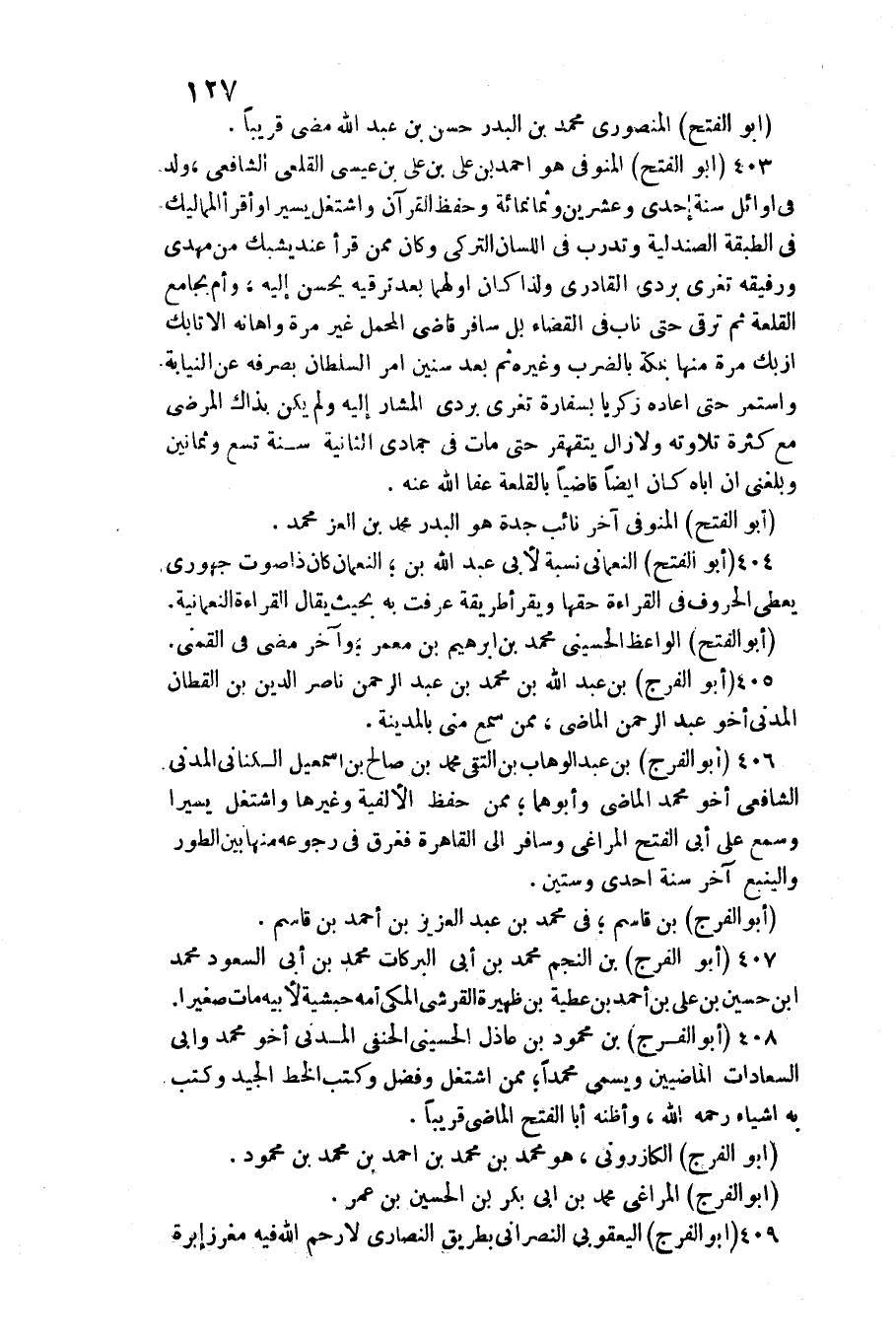 (أَبُو الْفَتْح) المنصوري مُحَمَّد بن الْبَدْر حسن بن عبد الله مضى قَرِيبا 403 (أَبُو الْفَتْح) المنوفي هُوَ أَحْمد بن عَليّ بن عَليّ بن عِيسَى القلعي الشَّافِعِي ولد فِي أَوَائِل سنة إِحْدَى وَعشْرين وَثَمَانمِائَة وَحفظ الْقُرْآن واشتغل يَسِيرا وأقرأ المماليك فِي الطَّبَقَة الصندلية وتدرب فِي اللِّسَان التركي وَكَانَ مِمَّن قَرَأَ عِنْد يشبك من مهْدي ورفيقه تغرى بردى القادري وَلذَا كَانَ أَولهمَا بعد ترقية يحسن إِلَيْهِ وَأم بِجَامِع القلعة ثمَّ ترقى حَتَّى نَاب فِي الْقَضَاء بل سَافر قَاضِي الْمحمل غير مرّة وأهانه الأتابك ازبك مرّة مِنْهَا بِمَكَّة بِالضَّرْبِ وَغَيره ثمَّ بعد سِنِين أَمر السُّلْطَان بصرفه عَن النِّيَابَة وَاسْتمرّ حَتَّى أَعَادَهُ زَكَرِيَّا بسفارة تغرى بردى الْمشَار إِلَيْهِ وَلم يكن بِذَاكَ المرضي مَعَ كَثْرَة تِلَاوَته ولازال يتقهقر حَتَّى مَاتَ فِي جُمَادَى الثَّانِيَة سنة تسع وَثَمَانِينَ وَبَلغنِي أَن أَبَاهُ كَانَ أَيْضا قَاضِيا بالقلعة عَفا الله عَنهُ (أَبُو الْفَتْح) المنوفي آخر نَائِب جدة هُوَ الْبَدْر مُحَمَّد بن الْعِزّ مُحَمَّد 404 (أَبُو الْفَتْح) النعماني نِسْبَة لأبي عبد الله بن النُّعْمَان كَانَ ذَا صَوت جَهورِي يُعْطي الْحُرُوف فِي الْقِرَاءَة حَقّهَا وَيقْرَأ طَريقَة عرفت بِهِ بِحَيْثُ يُقَال الْقِرَاءَة النعمانية (أَبُو الْفَتْح) الْوَاعِظ الْحُسَيْنِي مُحَمَّد بن إِبْرَاهِيم بن معمر وَآخر مضى فِي القمني 405 (أَبُو الْفرج) بن عبد الله بن مُحَمَّد بن عبد الرَّحْمَن نَاصِر الدّين بن الْقطَّان الْمدنِي أَخُو عبد الرَّحْمَن الْمَاضِي مِمَّن سمع مني بِالْمَدِينَةِ 406 (أَبُو الْفرج) بن عبد الْوَهَّاب بن التقي مُحَمَّد بن صَالح بن اسماعيل الْكِنَانِي الْمدنِي الشَّافِعِي أَخُو مُحَمَّد الْمَاضِي وأبوهما مِمَّن حفظ الألفية وَغَيرهَا واشتغل يَسِيرا وَسمع على أبي الْفَتْح المراغي وسافر إِلَى الْقَاهِرَة فغرق فِي رُجُوعه مِنْهَا بَين الطّور والينبع آخر سنة احدى وَسِتِّينَ (أَبُو الْفرج) بن قَاسم فِي مُحَمَّد بن عبد الْعَزِيز بن أَحْمد بن قَاسم 407 (أَبُو الْفرج) بن النَّجْم مُحَمَّد بن أبي البركات مُحَمَّد بن أبي السُّعُود مُحَمَّد بن حُسَيْن بن عَليّ بن أَحْمد بن عَطِيَّة بن ظهيرة الْقرشِي الْمَكِّيّ أمه حبشية لِأَبِيهِ مَاتَ صَغِيرا 40 {أَبُو الْفرج) بن مَحْمُود بن عاذل الْحُسَيْنِي الْحَنَفِيّ الْمدنِي أَخُو مُحَمَّد وَأبي السعادات الماضيين وَيُسمى مُحَمَّدًا مِمَّن اشْتغل وَفضل وَكتب الْخط الْجيد وَكتب بِهِ أَشْيَاء رَحمَه الله وَأَظنهُ أَبَا الْفَتْح الْمَاضِي قَرِيبا (أَبُو الْفرج) الكازروني هُوَ مُحَمَّد بن مُحَمَّد بن أَحْمد بن مُحَمَّد بن مَحْمُود (أَبُو الْفرج) المراغي مُحَمَّد بن أبي بكر بن الْحُسَيْن بن عمر 409 (أَبُو الْفرج) اليعقوبي النَّصْرَانِي بطرِيق النَّصَارَى لَا رحم الله فِيهِ مغرز إبرة
