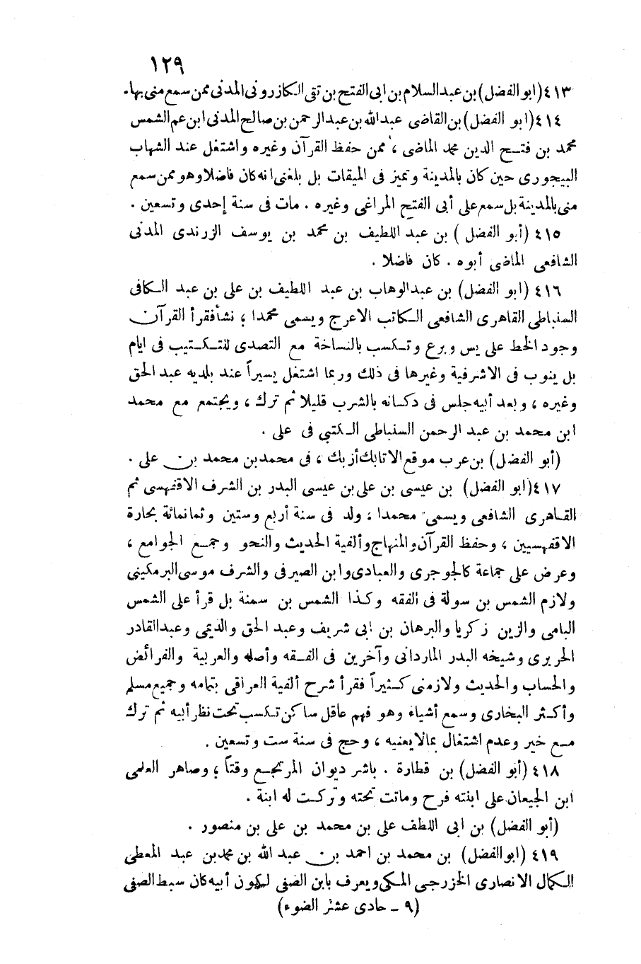 413 - (أَبُو الْفضل) بن عبد السَّلَام بن أبي الْفَتْح بن تَقِيّ الكازروني الْمدنِي مِمَّن سمع مني بهَا 414 (أَبُو الْفضل) بن القَاضِي عبد الله بن عبد الرَّحْمَن بن صَالح الْمدنِي ابْن عَم الشَّمْس مُحَمَّد بن فتح الدّين مُحَمَّد الْمَاضِي مِمَّن حفظ الْقُرْآن وَغَيره واشتغل عِنْد الشهَاب البيجوري حِين كَانَ بِالْمَدِينَةِ وتميز فِي الْمِيقَات بل بَلغنِي أَنه كَانَ فَاضلا وَهُوَ مِمَّن سمع مني بِالْمَدِينَةِ بل سمع على أبي الْفَتْح المراغي وَغَيره مَاتَ فِي سنة إِحْدَى وَتِسْعين 415 (أَبُو الْفضل) بن عبد اللَّطِيف بن مُحَمَّد بن يُوسُف الزرندي الْمدنِي الشَّافِعِي الْمَاضِي أَبوهُ كَانَ فَاضلا 416 (أَبُو الْفضل) بن عبد الْوَهَّاب بن عبد اللَّطِيف بن عَليّ بن عبد الْكَافِي السنباطي القاهري الشَّافِعِي الْكَاتِب الْأَعْرَج وَيُسمى مُحَمَّدًا نَشأ فَقَرَأَ الْقُرْآن وجود الْخط على يس وبرع وتكسب بالنساخة مَعَ التصدي للتكتيب فِي أَيَّام بل يَنُوب فِي الأشرفية وَغَيرهَا فِي ذَلِك وَرُبمَا اشْتغل يَسِيرا عِنْد بلديه عبد الْحق وَغَيره وَبعد أَبِيه جلس فِي دكانه بالشرب قَلِيلا ثمَّ ترك ويجتمع مَعَ مُحَمَّد بن مُحَمَّد بن عبد الرَّحْمَن السنباطي الكتبي فِي عَليّ (أَبُو الْفضل) بن عرب موقع الأتابك أزبك فِي مُحَمَّد بن مُحَمَّد بن عَليّ 417 (أَبُو الْفضل) بن عِيسَى بن عَليّ بن عِيسَى الْبَدْر بن الشّرف الأقفهسي ثمَّ القاهري الشَّافِعِي وَيُسمى مُحَمَّدًا ولد فِي سنة أَربع وَسِتِّينَ وَثَمَانمِائَة بحارة الأقفهسيين وَحفظ الْقُرْآن والمنهاج وألفية الحَدِيث والنحو وَجمع الْجَوَامِع وَعرض على جمَاعَة كالجوجري والعبادي وَابْن الصَّيْرَفِي والشرف مُوسَى البرمكيني ولازم الشَّمْس بن سولة فِي الْفِقْه وَكَذَا الشَّمْس بن سمنة بل قَرَأَ على الشَّمْس البامي والزين زَكَرِيَّا والبرهان بن أبي شرِيف وَعبد الْحق والديمي وَعبد الْقَادِر الحريري وَشَيْخه الْبَدْر المارداني وَآخَرين فِي الْفِقْه وَأَصله والعربية والفرائض والحساب والْحَدِيث ولازمني كثيرا فَقَرَأَ شرح ألفية الْعِرَاقِيّ بِتَمَامِهِ وَجَمِيع مُسلم وَأكْثر البُخَارِيّ وَسمع أَشْيَاء وَهُوَ فهم عَاقل سَاكن تكسب تَحت نظر أَبِيه ثمَّ ترك مَعَ خير وَعدم اشْتِغَال بِمَا لَا يعنيه وَحج فِي سنة سِتّ وَتِسْعين 41 {أَبُو الْفضل) بن قطارة بَاشر ديوَان المرتجع وقتا وصاهر العلمي بن الجيعان على ابْنَته فَرح وَمَاتَتْ تَحْتَهُ وَتركت لَهُ ابْنة (أَبُو الْفضل) بن أبي اللطف عَليّ بن مُحَمَّد بن عَليّ بن مَنْصُور 419 (أَبُو الْفضل) بن مُحَمَّد بن أَحْمد بن عبد الله بن مُحَمَّد بن عبد الْمُعْطِي الْكَمَال الْأنْصَارِيّ الخزرجي الْمَكِّيّ وَيعرف بِابْن الصفي لكَون أَبِيه كَانَ سبط الصفي