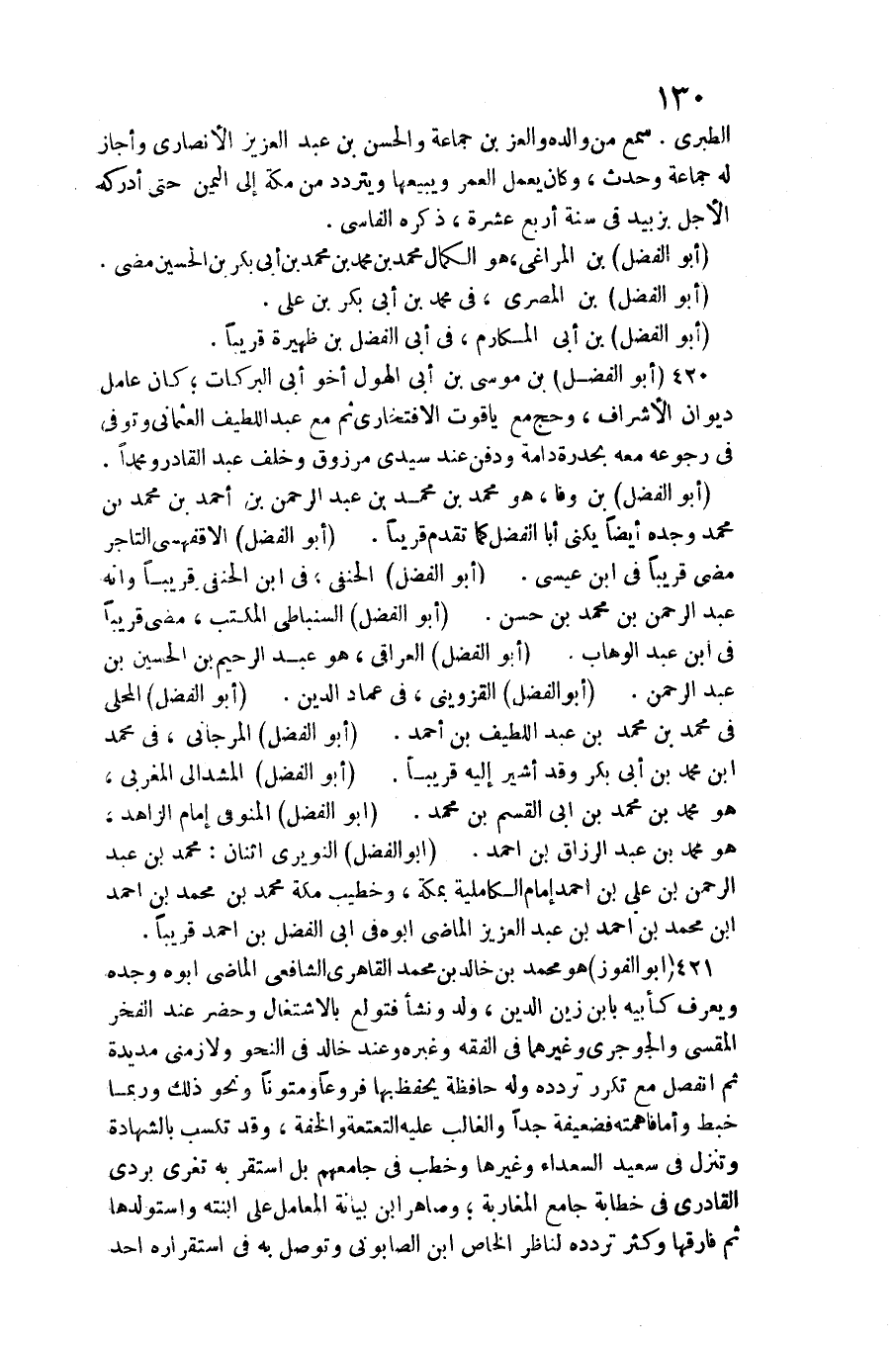 الطَّبَرِيّ سمع من وَالِده والعز بن جمَاعَة وَالْحسن بن عبد الْعَزِيز الْأنْصَارِيّ وَأَجَازَ لَهُ جمَاعَة وَحدث وَكَانَ يعْمل الْعُمر ويبيعها ويتردد من مَكَّة إِلَى الْيمن حَتَّى أدْركهُ الْأَجَل بزبيد فِي سنة أَربع عشرَة ذكره الفاسي (أَبُو الْفضل) بن المراغي هُوَ الْكَمَال مُحَمَّد بن مُحَمَّد بن مُحَمَّد بن أبي بكر بن الْحُسَيْن مضى (أَبُو الْفضل) بن الْمصْرِيّ فِي مُحَمَّد بن أبي بكر بن عَليّ (أَبُو الْفضل) بن أبي المكارم فِي أبي الْفضل بن ظهيرة قَرِيبا 420 (أَبُو الْفضل) بن مُوسَى بن أبي الهول أَخُو أبي البركات كَانَ عَامل ديوَان الْأَشْرَاف وَحج مَعَ ياقوت الافتخاري ثمَّ مَعَ عبد اللَّطِيف العثماني وَتُوفِّي فِي رُجُوعه مَعَه بحدرة دامة وَدفن عِنْد سَيِّدي مَرْزُوق وَخلف عبد الْقَادِر ومحمدا (أَبُو الْفضل) بن وفا هُوَ مُحَمَّد بن مُحَمَّد بن عبد الرَّحْمَن بن أَحْمد بن مُحَمَّد بن مُحَمَّد وجده أَيْضا يكنى أَبَا الْفضل كَمَا تقدم قَرِيبا (أَبُو الْفضل) الأقفهسي التَّاجِر مضى قَرِيبا فِي ابْن عِيسَى (أَبُو الْفضل) الْحَنَفِيّ فِي ابْن الْحَنَفِيّ قَرِيبا وَأَنه عبد الرَّحْمَن بن مُحَمَّد بن حسن (أَبُو الْفضل) السنباطي الْمكتب مضى قَرِيبا فِي ابْن عبد الْوَهَّاب (أَبُو الْفضل) الْعِرَاقِيّ هُوَ عبد الرَّحِيم بن الْحُسَيْن بن عبد الرَّحْمَن (أَبُو الْفضل) الْقزْوِينِي فِي عماد الدّين (أَبُو الْفضل) الْمحلي فِي مُحَمَّد بن مُحَمَّد بن عبد اللَّطِيف بن أَحْمد (أَبُو الْفضل) الْمرْجَانِي فِي مُحَمَّد بن مُحَمَّد بن أبي بكر وَقد أُشير إِلَيْهِ قَرِيبا (أَبُو الْفضل) المشدالي المغربي هُوَ مُحَمَّد بن مُحَمَّد بن أبي الْقسم بن مُحَمَّد (أَبُو الْفضل) المنوفي إِمَام الزَّاهِد هُوَ مُحَمَّد بن عبد الرَّزَّاق بن أَحْمد (أَبُو الْفضل) النويري اثْنَان مُحَمَّد بن عبد الرَّحْمَن بن عَليّ بن أَحْمد إِمَام الكاملية بِمَكَّة وخطيب مَكَّة مُحَمَّد بن مُحَمَّد بن أَحْمد بن مُحَمَّد بن أَحْمد بن عبد الْعَزِيز الْمَاضِي أَبوهُ فِي أبي الْفضل بن أَحْمد قَرِيبا 42 (أَبُو الْفَوْز) هُوَ مُحَمَّد بن خَالِد بن مُحَمَّد القاهري الشَّافِعِي الْمَاضِي أَبوهُ وجده وَيعرف كأبيه بِابْن زين الدّين ولد وَنَشَأ فتولع بالاشتغال وَحضر عِنْد الْفَخر المقسي والجوجري وَغَيرهمَا فِي الْفِقْه وَغَيره وَعند خَالِد فِي النَّحْو ولازمني مديدة ثمَّ انْفَصل مَعَ تكَرر تردده وَله حافظة يحفظ بهَا فروعا ومتونا وَنَحْو ذَلِك وَرُبمَا خبط وَأما فاهمته فضعيفة جدا وَالْغَالِب عَلَيْهِ التعتعة والخفة وَقد تكسب بِالشَّهَادَةِ وتنزل فِي سعيد السُّعَدَاء وَغَيرهَا وخطب فِي جامعهم بل اسْتَقر بِهِ تغرى بردى القادري فِي خطابة جَامع المغاربة وصاهر ابْن بيانة المعامل على ابْنَته واستولدها ثمَّ فَارقهَا وَكثر تردده لناظر الْخَاص ابْن الصَّابُونِي وتوصل بِهِ فِي استقراره أحد