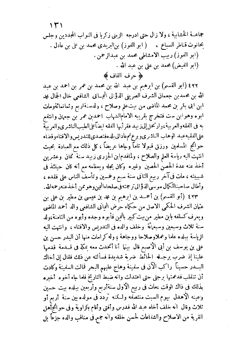 42 - (أَبُو الْقسم) بن إِبْرَاهِيم بن عبد الله بن مُحَمَّد بن عمر بن أَحْمد بن عبد الله بن مُحَمَّد بن جعمان الشّرف الصريفي الذؤالي الْيَمَانِيّ الشَّافِعِي خَال الْجمال مُحَمَّد بن أبي بكر بن مُحَمَّد الْمَاضِي من بَيت علم وَصَلَاح ولد سنة أَربع وَثَمَانمِائَة وَمَات أَبوهُ وَهُوَ ابْن سِتّ فَتخرج بقريبه الإِمَام الشهَاب أَحْمد بن عمر بن جعمان وانتفع بِهِ فِي الْفِقْه والعربية وارتحل إِلَى زبيد فَقَرَأَ بهَا الْفِقْه أَيْضا على الطّيب النَّاشِرِيّ والعربية على الْفَقِيه عبد الْوَهَّاب النَّاشِرِيّ وبرع ثمَّ عَاد إِلَى بَلَده فتصدى للتدريس والافتاء وَقَضَاء حوائج الْمُسلمين ورزق قبولا تَاما وجاها عريضا كل ذَلِك مَعَ الْعِبَادَة بِحَيْثُ انْتَهَت إِلَيْهِ رياسة الْعلم وَالصَّلَاح وَلما قدم ابْن الْجَزرِي زبيد سنة ثَمَان وَعشْرين أَخذ عَنهُ عدَّة الْحصن الْحصين وَغَيره وَكَانَ يجله ويعظمه مَعَ أَنه كَانَ حِينَئِذٍ فِي شبيبته مَاتَ فِي آخر ربيع الثَّانِي سنة سبع وَخمسين وتأسف النَّاس على فَقده وَأطَال صاحبنا الْكَمَال مُوسَى الذؤالي تَرْجَمته فِي صلحاء الْيمن وَهُوَ مِمَّن أَخذ عَنهُ رَحمَه الله 423 (أَبُو الْقسم) بن أَحْمد بن إِبْرَاهِيم بن مُحَمَّد بن عِيسَى بن مطير بن عَليّ بن عُثْمَان الشّرف الْحكمِي الأَصْل من حكماء حَوْض الْيَمَانِيّ الشَّافِعِي وَالِد أَحْمد الْمَاضِي وَيعرف كسلفه بِابْن مطير من بَيت كَبِير بِالْيمن فأبوه وجده وَأَبوهُ من الثَّامِنَة ولد سنة ثَلَاث وَسبعين وَسَبْعمائة وَخلف وَالِده فِي التدريس والإفتاء وانتهت إِلَيْهِ الرياسة بِبَلَدِهِ علما وَعَملا وصلاحا ووجاهة وَله كرامات مِنْهَا أَن الْبَدْر حسن بن عَليّ بن يُوسُف بن أبي الْأصْبع قَالَ بَيْنَمَا أَنا أتحدث مَعَه بِمَكَّة فِي قدمة قدمهَا علينا إِذْ ضرب بِرجلِهِ الْحَائِط ضَرْبَة شَدِيدَة فَسَأَلته عَن ذَلِك فَقَالَ إِن أَخَاك الْبَدْر حُسَيْنًا رَاكب الْآن فِي سفينة وهاج عَلَيْهِم الْبَحْر فمالت السَّفِينَة وكادت أَن تنْقَلب فدعمتها برجلي حَتَّى اعتدلت وَأَنه ضبط التَّارِيخ فَلَمَّا جَاءَ أَخُوهُ أخبرهُ بذلك فِي ذَاك الْوَقْت مَاتَ فِي ربيع الأول سنة أَربع وَأَرْبَعين بِبَلَدِهِ بَيت حُسَيْن وعينه الأهدل بِيَوْم السبت منتصفه وَلكنه تردد فِي مولده بَين سنة أَربع أَو ثَلَاث وَقَالَ انه خلف أَخَاهُ عبد الله فدرس وَأفْتى وَأقَام بالزاوية وَفِي حوائج أهل الْقرْيَة من الاصلاح والشفاعات لحسن خلقه وَأَنه جمع فِي مَنَاقِب وَالِده جُزْءا بل