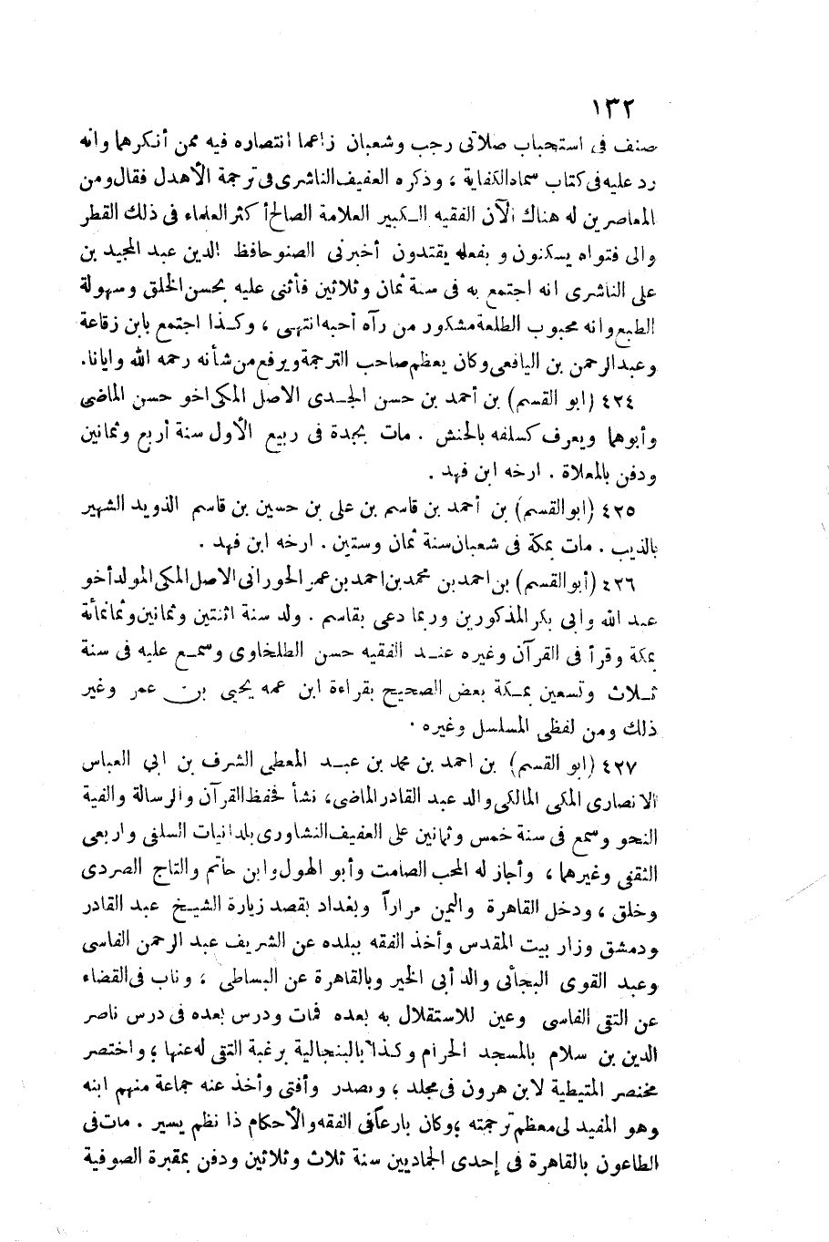 صنف فِي اسْتِحْبَاب صَلَاتي رَجَب وَشَعْبَان زاعما انتصاره فِيهِ مِمَّن أنكرهما وَأَنه رد عَلَيْهِ فِي كتاب سَمَّاهُ الْكِفَايَة وَذكره الْعَفِيف النَّاشِرِيّ فِي تَرْجَمَة الأهدل فَقَالَ وَمن المعاصرين لَهُ هُنَاكَ الْآن الْفَقِيه الْكَبِير الْعَلامَة الصَّالح أَكثر الْعلمَاء فِي ذَلِك الْقطر وَإِلَى فتواه يسكنون وبفعله يقتدون أَخْبرنِي الصنو حَافظ الدّين عبد الْمجِيد بن عَليّ النَّاشِرِيّ أَنه اجْتمع بِهِ فِي سنة ثَمَان وَثَلَاثِينَ فَأثْنى عَلَيْهِ بِحسن الْخلق وسهولة الطَّبْع وَأَنه مَحْبُوب الطلعة مشكور من رَآهُ أحبه انْتهى وَكَذَا اجْتمع بِابْن زقاعة وَعبد الرَّحْمَن بن اليافعي وَكَانَ يعظم صَاحب التَّرْجَمَة وَيرْفَع من شَأْنه رَحمَه الله وإيانا 424 (أَبُو الْقسم) بن أَحْمد بن حسن الجدي الأَصْل الْمَكِّيّ أَخُو حسن الْمَاضِي وأبوهما وَيعرف كسلفه بالحنش مَاتَ بجدة فِي ربيع الأول سنة أَربع وَثَمَانِينَ وَدفن بالمعلاة أرخه ابْن فَهد 425 (أَبُو الْقسم) بن أَحْمد بن قَاسم بن عَليّ بن حُسَيْن بن قَاسم الذويد الشهير بالذيب مَاتَ بِمَكَّة فِي شعْبَان سنة ثَمَان وَسِتِّينَ أرخه ابْن فَهد 426 (أَبُو الْقسم) بن أَحْمد بن مُحَمَّد بن أَحْمد بن عمر الحوراني الأَصْل الْمَكِّيّ المولد أَخُو عبد الله وَأبي بكر الْمَذْكُورين وَرُبمَا دعِي بقاسم ولد سنة اثْنَتَيْنِ وَثَمَانِينَ وَثَمَانمِائَة بِمَكَّة وَقَرَأَ فِي الْقُرْآن وَغَيره عِنْد الْفَقِيه حسن الطلخاوي وَسمع عَلَيْهِ فِي سنة ثَلَاث وَتِسْعين بِمَكَّة بعض الصَّحِيح بِقِرَاءَة ابْن عَمه يحيى بن عمر وَغير ذَلِك وَمن لَفْظِي المسلسل وَغَيره 427 (أَبُو الْقسم) بن أَحْمد بن مُحَمَّد بن عبد الْمُعْطِي الشّرف بن أبي الْعَبَّاس الْأنْصَارِيّ الْمَكِّيّ الْمَالِكِي وَالِد عبد الْقَادِر الْمَاضِي نَشأ فحفظ الْقُرْآن والرسالة وألفية النَّحْو وَسمع فِي سنة خمس وَثَمَانِينَ على الْعَفِيف النشاوري بلدانيات السلَفِي وأربعي الثَّقَفِيّ وَغَيرهمَا وَأَجَازَ لَهُ الْمُحب الصَّامِت وَأَبُو الهول وَابْن حَاتِم والتاج الصردي وَخلق وَدخل الْقَاهِرَة واليمن مرَارًا وبغداد بِقصد زِيَارَة الشَّيْخ عبد الْقَادِر ودمشق وزار بَيت الْمُقَدّس وَأخذ الْفِقْه بِبَلَدِهِ عَن الشريف عبد الرَّحْمَن الفاسي وَعبد الْقوي البجائي وَالِد أبي الْخَيْر وبالقاهرة عَن الْبِسَاطِيّ وناب فِي الْقَضَاء عَن التقي الفاسي وَعين للاستقلال بِهِ بعده فَمَاتَ ودرس بعده فِي درس نَاصِر الدّين بن سَلام بِالْمَسْجِدِ الْحَرَام وَكَذَا بالبنجالية برغبة التقي لَهُ عَنْهَا وَاخْتصرَ مخنصر الْمُتَيْطِيَّة لِابْنِ هَارُون فِي مُجَلد وتصدر وَأفْتى وَأخذ عَنهُ جمَاعَة مِنْهُم ابْنه وَهُوَ الْمُفِيد لي مُعظم تَرْجَمته وَكَانَ بارعا فِي الْفِقْه وَالْأَحْكَام ذَا نظم يسير مَاتَ فِي الطَّاعُون بِالْقَاهِرَةِ فِي احدى الجماديين سنة ثَلَاث وَثَلَاثِينَ وَدفن بمقبرة الصُّوفِيَّة