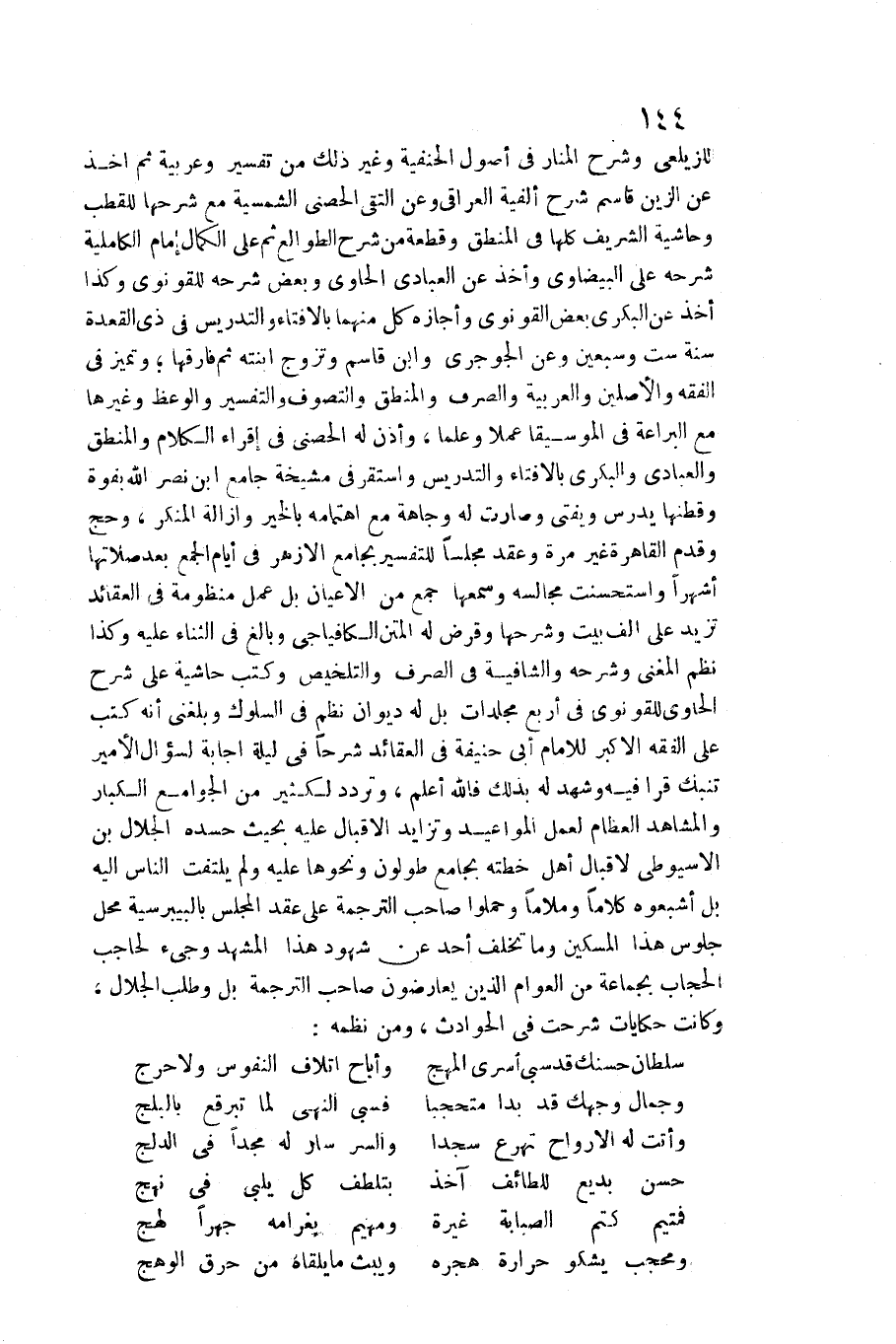 للزيلعي وَشرح الْمنَار فِي أصُول الْحَنَفِيَّة وَغير ذَلِك من تَفْسِير وعربية ثمَّ أَخذ عَن الزين قَاسم شرح ألفية الْعِرَاقِيّ وَعَن التقي الحصني الشمسية مَعَ شرحها للقطب وحاشية الشريف كلهَا فِي الْمنطق وَقطعَة من شرح الطوالع ثمَّ على الْكَمَال إِمَام الكاملية شَرحه على الْبَيْضَاوِيّ وَأخذ عَن الْعَبَّادِيّ الْحَاوِي وَبَعض شَرحه للقونوي وَكَذَا أَخذ عَن الْبكْرِيّ بعض القونوي وَأَجَازَهُ كل مِنْهُمَا بالإفتاء والتدريس فِي ذِي الْقعدَة سنة سِتّ وَسبعين وَعَن الْجَوْجَرِيّ وَابْن قَاسم وَتزَوج ابْنَته ثمَّ فَارقهَا وتميز فِي الْفِقْه والأصلين والعربية وَالصرْف والمنطق والتصوف وَالتَّفْسِير والوعظ وَغَيرهَا مَعَ البراعة فِي الموسيقا عملا وعلما وَأذن لَهُ الحصني فِي إقراء الْكَلَام والمنطق والعبادي والبكري بالإفتاء والتدريس وَاسْتقر فِي مشيخة جَامع ابْن نصر الله بفوة وقطنها يدرس ويفتي وَصَارَت لَهُ وجاهة مَعَ اهتمامه بِالْخَيرِ وَإِزَالَة الْمُنكر وَحج وَقدم الْقَاهِرَة غير مرّة وَعقد مَجْلِسا للتفسير بِجَامِع الْأَزْهَر فِي أَيَّام الْجمع بعد صلَاتهَا أشهرا واستحسنت مجالسه وسمعها جمع من الْأَعْيَان بل عمل منظومة فِي العقائد تزيد على ألف بَيت وَشَرحهَا وقرض لَهُ الْمَتْن الكافياجي وَبَالغ فِي الثَّنَاء عَلَيْهِ وَكَذَا نظم المغنى وَشَرحه والشافية فِي الصّرْف وَالتَّلْخِيص وَكتب حَاشِيَة على شرح الْحَاوِي للقونوي فِي أَربع مجلدات بل لَهُ ديوَان نظم فِي السلوك وَبَلغنِي أَنه كتب على للفقه الْأَكْبَر للْإِمَام أبي حنيفَة فِي العقائد شرحا فِي لَيْلَة إِجَابَة لسؤال الْأَمِير تنبك قَرَأَ فِيهِ وَشهد لَهُ بذلك فَالله أعلم وَتردد لكثير من الْجَوَامِع الْكِبَار والمشاهد الْعِظَام لعمل المواعيد وتزايد الإقبال عَلَيْهِ بِحَيْثُ حسده الْجلَال بن الأسيوطي لإقبال أهل خطته بِجَامِع طولون وَنَحْوهَا عَلَيْهِ وَلم يلْتَفت النَّاس إِلَيْهِ بل أشبعوه كلَاما وملاما وحملوا صَاحب التَّرْجَمَة على عقد الْمجْلس بالبيبرسية مَحل جُلُوس هَذَا الْمِسْكِين وَمَا تخلف أحد عَن شُهُود هَذَا المشهد وَجِيء لحاجب الْحجاب بِجَمَاعَة من الْعَوام الَّذين يعارضون صَاحب التَّرْجَمَة بل وَطلب الْجلَال وَكَانَت حكايات شرحت فِي الْحَوَادِث وَمن نظمه