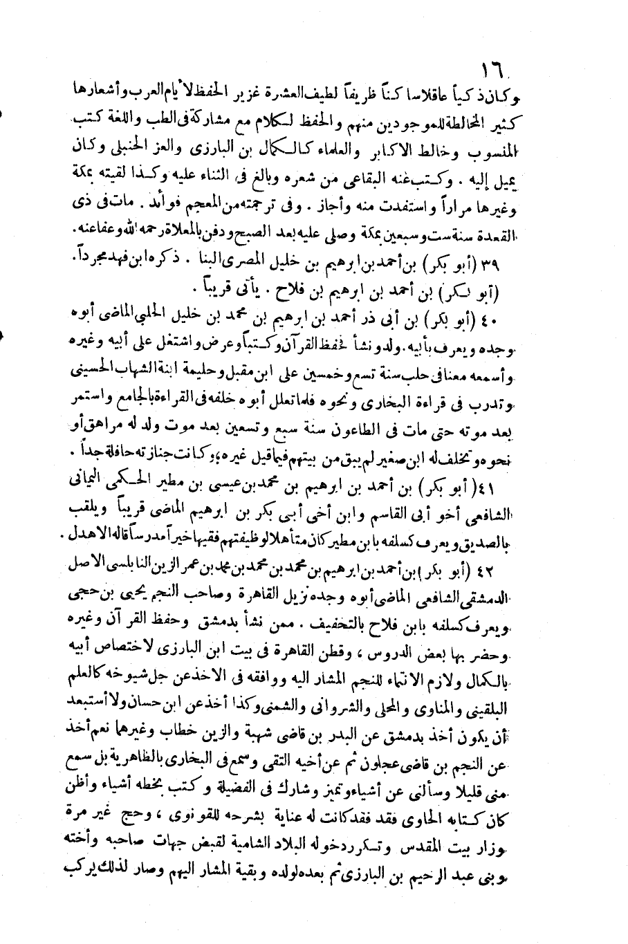 وَكَانَ ذكيا عَاقِلا سَاكِنا ظريفا لطيف الْعشْرَة غزير الْحِفْظ لأيام الْعَرَب وَأَشْعَارهَا كثير المخالطة للموجودين مِنْهُم وَالْحِفْظ لكَلَام مَعَ مُشَاركَة فِي الطِّبّ واللغة كتب الْمَنْسُوب وخالط الأكابر وَالْعُلَمَاء كالكمال بن الْبَارِزِيّ والعز الْحَنْبَلِيّ وَكَانَ يمِيل إِلَيْهِ وَكتب عَنهُ البقاعي من شعره وَبَالغ فِي الثَّنَاء عَلَيْهِ وَكَذَا لَقيته بِمَكَّة وَغَيرهَا مرَارًا واستفدت مِنْهُ وَأَجَازَ وَفِي تَرْجَمته من المعجم فَوَائِد مَاتَ فِي ذِي الْقعدَة سنة سِتّ وَسبعين بِمَكَّة وَصلى عَلَيْهِ بعد الصُّبْح وَدفن بالمعلاة رَحمَه الله وَعَفا عَنهُ 39 (أَبُو بكر) بن أَحْمد بن إِبْرَاهِيم بن خَلِيل الْمصْرِيّ الْبَنَّا ذكره ابْن فَهد مُجَردا (أَبُو بكر) بن أَحْمد بن إِبْرَاهِيم بن فلاح يَأْتِي قَرِيبا 40 (أَبُو بكر) بن أبي ذَر أَحْمد بن إِبْرَاهِيم بن مُحَمَّد بن خَلِيل الْحلَبِي الْمَاضِي أَبوهُ وجده وَيعرف بِأَبِيهِ ولد وَنَشَأ فحفظ الْقُرْآن وكتبا وَعرض واشتغل على أَبِيه وَغَيره وأسمعه مَعنا فِي حلب سنة تسع وَخمسين على ابْن مقبل وحليمة ابْنة الشهَاب الْحُسَيْنِي وتدرب فِي قِرَاءَة البُخَارِيّ وَنَحْوه فَلَمَّا تعلل أَبوهُ خَلفه فِي الْقِرَاءَة بالجامع وَاسْتمرّ بعد مَوته حَتَّى مَاتَ فِي الطَّاعُون سنة سبع وَتِسْعين بعد موت ولد لَهُ مراهق أَو نَحوه وتخلف لَهُ ابْن صَغِير لم يبْق نم بَيتهمْ فِيمَا قيل غَيره وَكَانَت جنَازَته حافلة جدا 4 (أَبُو بكر) بن أَحْمد بن إِبْرَاهِيم بن مُحَمَّد بن عِيسَى بن مطير الْحكمِي الْيَمَانِيّ الشَّافِعِي أَخُو أبي الْقَاسِم وَابْن أخي أبي بكر بن إِبْرَاهِيم الْمَاضِي قَرِيبا ويلقب بِالصديقِ وَيعرف كسلفه بِابْن مطير كَانَ متأهلا لوظيفتهم فَقِيها خيرا مدرسا قَالَه الأهدل 4 (أَبُو بكر) بن أَحْمد بن إِبْرَاهِيم بن مُحَمَّد بن مُحَمَّد بن مُحَمَّد بن عمر الزين النابلسي الأَصْل الدمشق الشَّافِعِي الْمَاضِي أَبوهُ وجده نزيل الْقَاهِرَة وَصَاحب النَّجْم يحيى بن حجي وَيعرف كسلفه بِابْن فلاح بِالتَّخْفِيفِ مِمَّن نَشأ بِدِمَشْق وَحفظ الْقُرْآن وَغَيره وَحضر بهَا بعض الدُّرُوس وقطن الْقَاهِرَة فِي بَيت ابْن الْبَارِزِيّ لاخْتِصَاص أَبِيه بالكمال ولازم الانتماء للنجم الْمشَار إِلَيْهِ وَوَافَقَهُ فِي الْأَخْذ عَن جلّ شُيُوخه كَالْعلمِ البُلْقِينِيّ والمناوي والمحلى والشرواني والشمني وَكَذَا أَخذ عَن ابْن حسان وَلَا أستبعد أَن يكون أَخذ بِدِمَشْق عَن الْبَدْر بن قَاضِي شُهْبَة والزين خطاب وَغَيرهمَا نعم أَخذ عَن النَّجْم بن قَاضِي عجلون ثمَّ عَن أَخِيه التقي وَسمع فِي البُخَارِيّ بالظاهرية بل سمع مني قَلِيلا وسألني عَن أَشْيَاء وتميز وشارك فِي الْفَضِيلَة وَكتب بِخَطِّهِ أَشْيَاء وأظن كَانَ كِتَابه الْحَاوِي فقد فقد كَانَت لَهُ عناية بشرحه للقونوي وَحج غير مرّة وزار بَيت الْمُقَدّس وتكرر دُخُوله الْبِلَاد الشامية لقبض جِهَات صَاحبه وَأُخْته وَبني عبد الرَّحِيم بن الْبَارِزِيّ ثمَّ بعده لوَلَده وَبَقِيَّة الْمشَار إِلَيْهِم وَصَارَ لذَلِك يركب