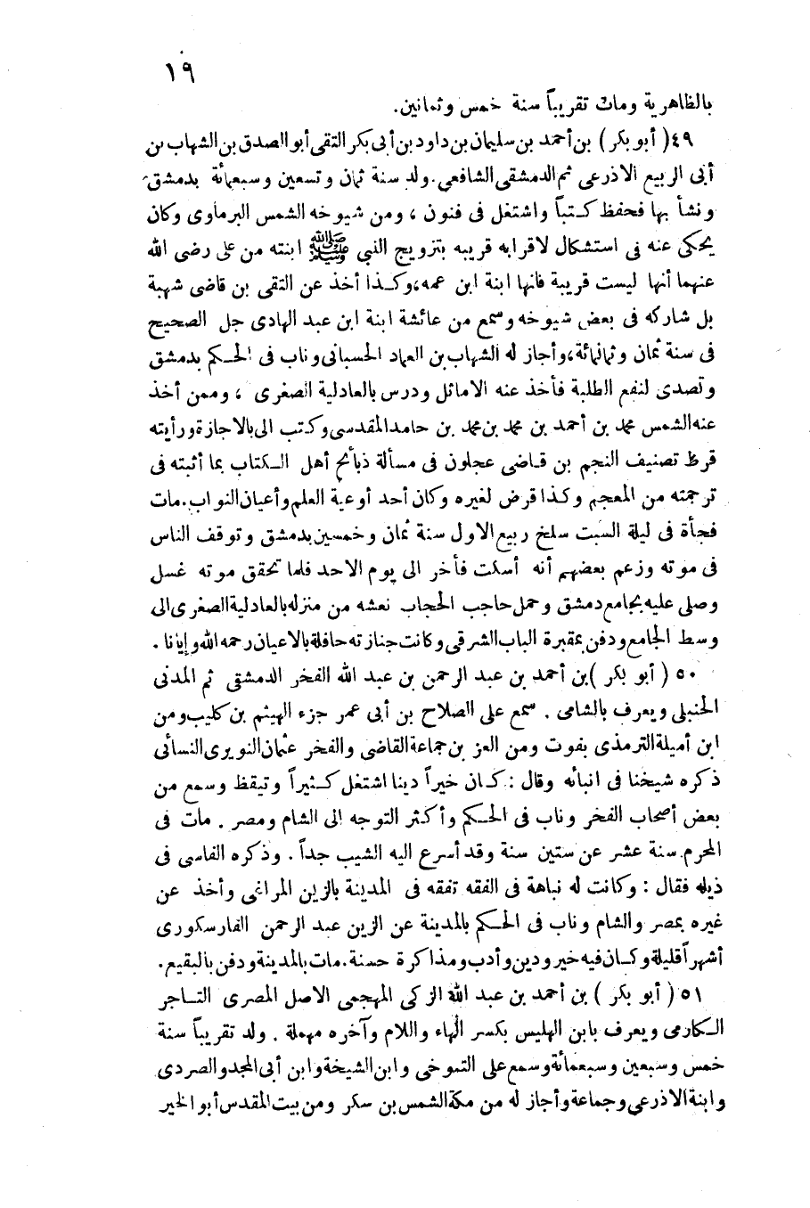ابْنَته من عَليّ رَضِي الله عَنْهُمَا أَنَّهَا لَيست قريبَة فَإِنَّهَا ابْنة ابْن عَمه وَكَذَا أَخذ عَن التقي بن قَاضِي شُهْبَة بل شَاركهُ فِي بعض شُيُوخه وَسمع من عَائِشَة ابْنة ابْن عبد الْهَادِي جلّ الصَّحِيح فِي سنة ثَمَان وَثَمَانمِائَة وَأَجَازَ لَهُ الشهَاب بن الْعِمَاد الحسباني وناب فِي الحكم بِدِمَشْق وتصدى لنفع الطّلبَة فَأخذ عَنهُ الأماثل ودرس بالعادلية الصُّغْرَى وَمِمَّنْ أَخذ عَنهُ الشَّمْس مُحَمَّد بن أَحْمد بن مُحَمَّد بن مُحَمَّد بن حَامِد الْمَقْدِسِي وَكتب إِلَيّ بِالْإِجَازَةِ ورأيته قرط تصنيف النَّجْم بن قَاضِي عجلون فِي مَسْأَلَة ذَبَائِح أهل الْكتاب بِمَا أثْبته فِي تَرْجَمته فِي المعجم وَكَذَا قرض لغيره وَكَانَ أحد أوعية الْعلم وأعيان النواب مَاتَ فَجْأَة فِي لَيْلَة السبت سلخ ربيع الأول سنة ثَمَان وَخمسين بِدِمَشْق وَتوقف النَّاس فِي مَوته وَزعم بَعضهم أَنه أسكت فَأخر إِلَى يَوْم الْأَحَد فَلَمَّا تحقق مَوته غسل وَصلى عَلَيْهِ بِجَامِع دمشق وَحمل حَاجِب الْحجاب نعشه من منزله بالعادلية الصُّغْرَى إِلَى وسط الْجَامِع وَدفن بمقبرة الْبَاب الشَّرْقِي وَكَانَت جنَازَته حافلة بالأعيان رَحمَه الله وإيانا 50 (أَبُو بكر) بن أَحْمد بن عبد الرَّحْمَن بن عبد الله الْفَخر الدِّمَشْقِي ثمَّ الْمدنِي الْحَنْبَلِيّ وَيعرف بالشامي سمع على الصّلاح بن أبي عمر جُزْء الْهَيْثَم بن كُلَيْب وَمن ابْن أميلة التِّرْمِذِيّ بفوت وَمن الْعِزّ بن جمَاعَة القَاضِي وَالْفَخْر عُثْمَان النويري النَّسَائِيّ ذكره شَيخنَا فِي أنبائه وَقَالَ كَانَ خيرا دينا اشْتغل كثيرا وتيقظ وَسمع من بعض أَصْحَاب الْفَخر وناب فِي الحكم وَأكْثر التَّوَجُّه إِلَى الشَّام ومصر مَاتَ فِي الْمحرم سنة عشر عَن سِتِّينَ سنة وَقد أسْرع إِلَيْهِ الشيب جدا وَذكره الفاسي فِي ذيله فَقَالَ وَكَانَت لَهُ نباهة فِي الْفِقْه تفقه فِي الْمَدِينَة بالزين المراغي وَأخذ عَن غَيره بِمصْر وَالشَّام وناب فِي الحكم بِالْمَدِينَةِ عَن الزين عبد الرَّحْمَن الفارسكوري أشهرا قَليلَة وَكَانَ فِيهِ خير وَدين وأدب ومذاكرة حَسَنَة مَاتَ بِالْمَدِينَةِ وَدفن بِالبَقِيعِ 5 (أَبُو بكر) بن أَحْمد بن عبد الله الزكي المهجمي الأَصْل الْمصْرِيّ التَّاجِر الكارمي وَيعرف بِابْن الهليس بِكَسْر الْهَاء وَاللَّام وَآخره مُهْملَة ولد تَقْرِيبًا سنة خمس وَسبعين وَسَبْعمائة وَسمع على التنوخي وَابْن الشيخة وَابْن أبي الْمجد والصردي وَابْنَة الْأَذْرَعِيّ وَجَمَاعَة وَأَجَازَ لَهُ من مَكَّة الشَّمْس بن سكر وَمن بَيت الْمُقَدّس أَبُو الْخَيْر
