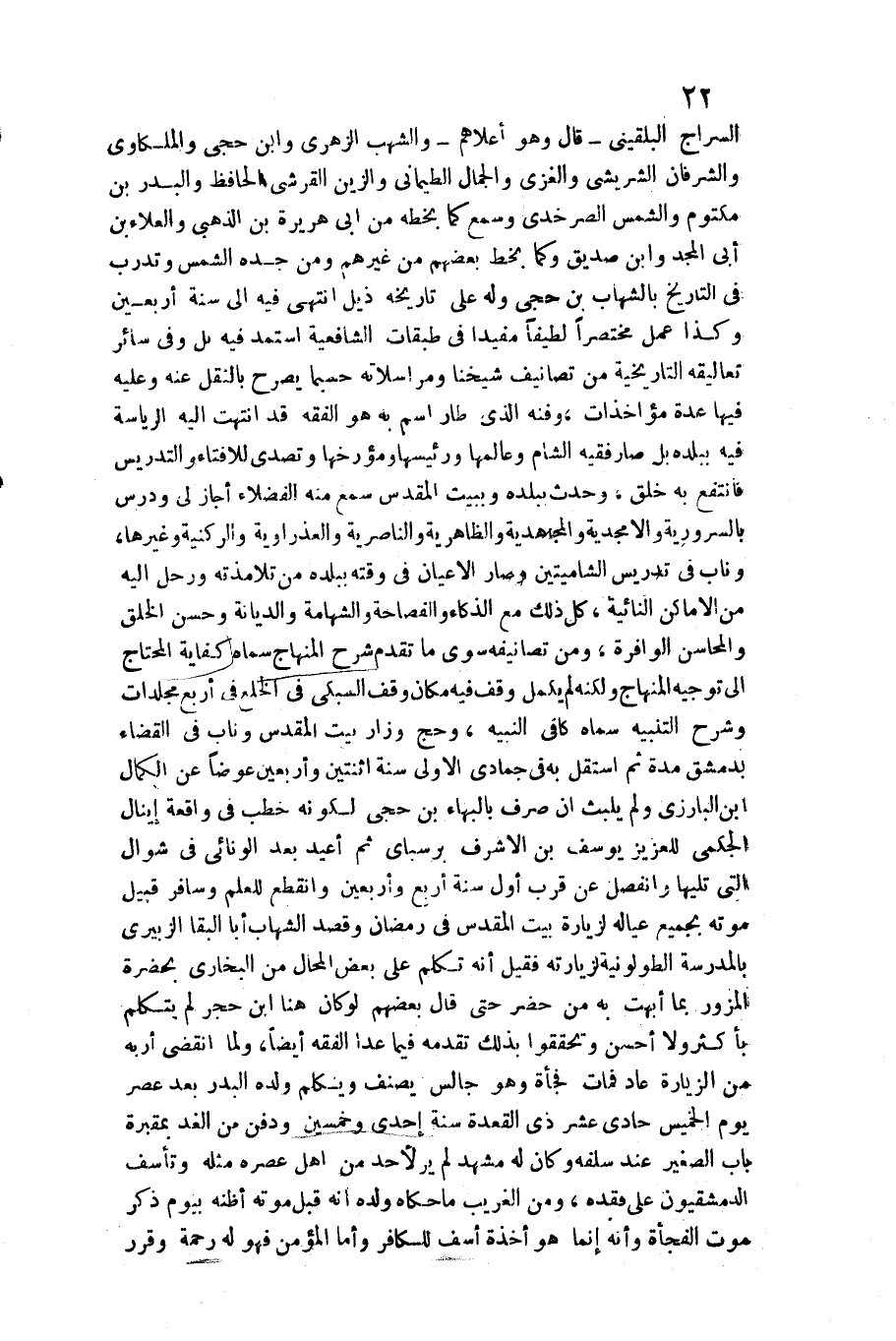 سراج البُلْقِينِيّ قَالَ وَهُوَ أعلاهم والشهب الزُّهْرِيّ وَابْن حجي والملكاوي الشرفان الشريشي والغزي وَالْجمال الطيماني والزين الْقرشِي الْحَافِظ والبدر بن مَكْتُوم وَالشَّمْس الصرخدي وَسمع كَمَا بِخَطِّهِ من أبي هُرَيْرَة بن الذَّهَبِيّ والْعَلَاء بن أبي الْمجد وَابْن صديق وكما يخط بَعضهم من غَيرهم وَمن جده الشَّمْس وتدرب على التَّارِيخ بالشهاب بن حجي وَله على تَارِيخه ذيل انْتهى فِيهِ إِلَى سنة أَرْبَعِينَ كَذَا عمل مُخْتَصرا لطيفا مُفِيدا فِي طَبَقَات الشَّافِعِيَّة استمد فِيهِ بل وَفِي سَائِر تعاليقه التاريخية من تصانيف شَيخنَا ومراسلاته حَسْبَمَا يُصَرح بِالنَّقْلِ عَنهُ وَعَلِيهِ فِيهَا عدت مؤاخذات وفنه الَّذِي طَار اسْم بِهِ هُوَ الْفِقْه قد انْتَهَت إِلَيْهِ الرياسة فِيهِ بِبَلَدِهِ بل صَار فَقِيه الشَّام وعالمها ورئيسها ومؤرخها وتصدى للإفتاء والتدريس فَانْتَفع بِهِ خلق وَحدث بِبَلَدِهِ وببيت الْمُقَدّس سمع مِنْهُ الْفُضَلَاء أجَاز لي ودرس بالسرورية والأمجدية والمجاهدية والظاهرية والناصرية والعذراوية والركنية وَغَيرهَا وناب فِي تدريس الشاميتين وَصَارَ الْأَعْيَان فِي وقته بِبَلَدِهِ من تلامذته ورحل إِلَيْهِ من الْأَمَاكِن النائية كل ذَلِك مَعَ الذكاء والفصاحة والشهامة والديانة وَحسن الْخلق والمحاسن الوافرة وَمن تصانيفه سوى مَا تقدم شرح الْمِنْهَاج سَمَّاهُ كِفَايَة الْمُحْتَاج إِلَى تَوْجِيه الْمِنْهَاج وَلكنه لم يكمل وقف فِيهِ مَكَان وقف السُّبْكِيّ فِي الْخلْع فِي أَربع مجلدات وَشرح التَّنْبِيه سَمَّاهُ كَافِي النبيه وَحج وزار بَيت الْمُقَدّس وناب فِي الْقَضَاء بِدِمَشْق مُدَّة ثمَّ اسْتَقل بِهِ فِي جُمَادَى الأولى سنة اثْنَتَيْنِ وَأَرْبَعين عوضا عَن الْكَمَال ابْن الْبَارِزِيّ وَلم يلبث أَن صرف بالبهاء بن حجي لكَونه خطب فِي وَاقعَة إينال الجكمي للعزيز يُوسُف بن الْأَشْرَف برسباي ثمَّ أُعِيد بعد الونائي فِي شَوَّال الَّتِي تَلِيهَا وانفصل عَن قرب أول سنة أَربع وَأَرْبَعين وَانْقطع للْعلم وسافر قبيل مَوته بِجَمِيعِ عِيَاله لزيارة بَيت الْمُقَدّس فِي رَمَضَان وَقصد الشهَاب أَبَا البقا الزبيرِي بِالْمَدْرَسَةِ الطولونية لزيارته فَقيل أَنه تكلم على بعض الْمحَال من البُخَارِيّ بِحَضْرَة المزور بِمَا أبهت بِهِ من حضر حَتَّى قَالَ بَعضهم لَو كَانَ هُنَا ابْن حجر لم يتَكَلَّم بِأَكْثَرَ وَلَا أحسن وتحققوا بذلك تقدمه فِيمَا عدا الْفِقْه أَيْضا وَلما انْقَضى أربه من الزِّيَارَة عَاد فَمَاتَ فَجْأَة وَهُوَ جَالس يصنف ويكلم وَلَده الْبَدْر بعد عصر يَوْم الْخَمِيس حادي عشر ذِي الْقعدَة سنة إِحْدَى وَخمسين وَدفن من الْغَد بمقبرة بَاب الصَّغِير عِنْد سلفه وَكَانَ لَهُ مشْهد لم ير لأحد من أهل عصره مثله وتأسف الدمشقيون على فَقده وَمن الْغَرِيب مَا حَكَاهُ وَلَده أَنه قبل مَوته أَظُنهُ بِيَوْم ذكر موت الْفجأَة وَأَنه إِنَّمَا أَخذه أَسف للْكَافِرِ وَأما الْمُؤمن فَهُوَ لَهُ رَحْمَة وَقرر