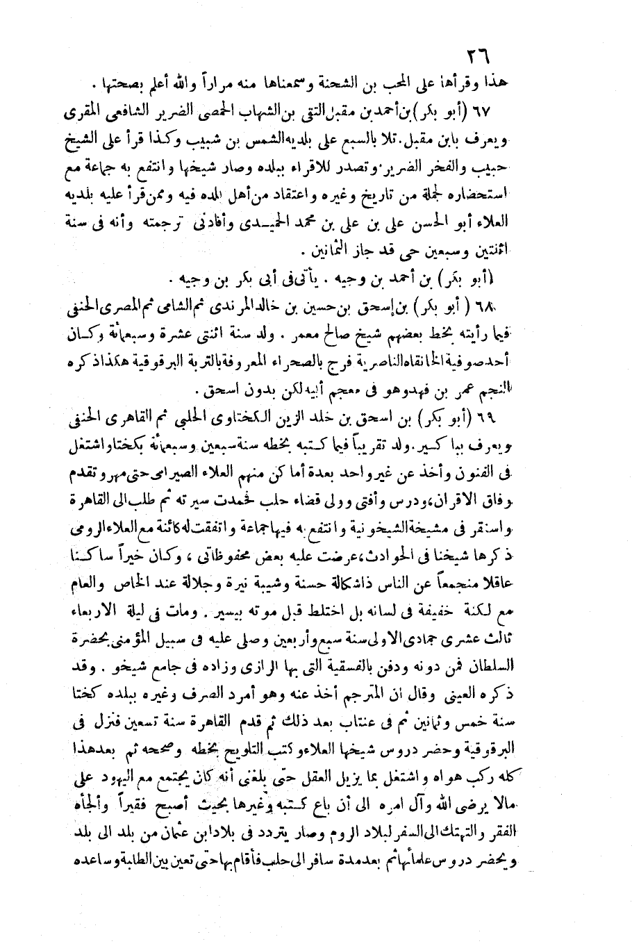 هَذَا وَقرأَهَا على الْمُحب بن الشّحْنَة وسمعناها مِنْهُ مرَارًا وَالله أعلم بِصِحَّتِهَا 67 (أَبُو بكر) بن أَحْمد بن مقبل التقى بن الشهَاب الْحِمصِي الضَّرِير الشَّافِعِي الْمقري وَيعرف بِابْن مقبل تَلا بالسبع على بلدية الشَّمْس بن شبيب وَكَذَا قَرَأَ على الشَّيْخ حبيب وَالْفَخْر الضَّرِير وتصدر للإقراء بِبَلَدِهِ وَصَارَ شيخها وانتفع بِهِ جمَاعَة مَعَ استحضاره لجملة من تَارِيخ وَغَيره واعتقاد من أهل بَلَده فِيهِ وَمِمَّنْ قَرَأَ عَلَيْهِ بلديه الْعَلَاء أَبُو الْحسن عَليّ بن عَليّ بن مُحَمَّد الْحميدِي وأفادني تَرْجَمته وَأَنه فِي سنة اثْنَتَيْنِ وَسبعين حَيّ قد جَازَ الثَّمَانِينَ (أَبُو بكر) بن أَحْمد بن وجيه يَأْتِي فِي أبي بكر بن وجيه 6 {أَبُو بكر) بن إِسْحَاق بن حُسَيْن بن خَالِد المرندي ثمَّ الشَّامي ثمَّ الْمصْرِيّ الْحَنَفِيّ فِيمَا رَأَيْته بِخَط بَعضهم شيخ صَالح معمر ولد سنة اثْنَتَيْ عشرَة وَسَبْعمائة وَكَانَ أحد صوفية الخانقاه الناصرية فرج بالصحراء الْمَعْرُوفَة بالتربة البرقوقية هَكَذَا ذكره النَّجْم عمر بن فَهد وَهُوَ فِي مُعْجم أَبِيه لَكِن بِدُونِ إِسْحَاق 69 (أَبُو بكر) بن إِسْحَاق بن خلد الزين الكختاوي الْحلَبِي ثمَّ القاهري الْحَنَفِيّ وَيعرف بباكير ولد تَقْرِيبًا فِيمَا كتبه بِخَطِّهِ سنة سبعين وَسَبْعمائة بكختار واشتغل فِي الْفُنُون وَأخذ عَن غير وَاحِد بعدة أَمَاكِن مِنْهُم الْعَلَاء الصيرامي حَتَّى مهر وَتقدم وفَاق الأقران ودرس وَأفْتى وَولي قَضَاء حلب فحمدت سيرته ثمَّ طلب إِلَى الْقَاهِرَة وَاسْتقر فِي مشيخة الشيخونية وانتفع بِهِ فِيهَا جمَاعَة واتفقت لَهُ كائنة مَعَ الْعَلَاء الرُّومِي ذكرهَا شَيخنَا فِي الْحَوَادِث عرضت عَلَيْهِ بعض محفوظاتي وَكَانَ خيرا سَاكِنا عَاقِلا منجمعا عَن النَّاس ذَا شكالة حَسَنَة وَشَيْبَة نيرة وجلالة عِنْد الْخَاص وَالْعَام مَعَ لكنه خَفِيفَة فِي لِسَانه بل اخْتَلَط قبل مَوته بِيَسِير وَمَات فِي لَيْلَة الْأَرْبَعَاء ثَالِث عشري جُمَادَى الأولى سنة سبع وَأَرْبَعين وَصلى عَلَيْهِ فِي سَبِيل المؤمني بِحَضْرَة السُّلْطَان فَمن دونه وَدفن بالفسقية الَّتِي بهَا الرَّازِيّ وزاده فِي جَامع شيخو وَقد ذكره الْعَيْنِيّ وَقَالَ إِن المترجم أَخذ عَنهُ وَهُوَ أَمْرَد الصّرْف وَغَيرهَا بِبَلَدِهِ كختا سنة خمس وَثَمَانِينَ ثمَّ فِي عنتاب بعد ذَلِك ثمَّ قدم الْقَاهِرَة سنة تسعين فَنزل فِي البرقوقية وَحضر دروس شيخها الْعَلَاء وَكتب التَّلْوِيح بِخَطِّهِ وَصَححهُ ثمَّ بعد هَذَا كُله ركب هَوَاهُ واشتغل بِمَا يزِيل الْعقل حَتَّى بَلغنِي أَنه كَانَ يجْتَمع مَعَ الْيَهُود على مَا لَا يُرْضِي الله وَآل أمره إِلَى أَن بَاعَ كتبه وَغَيرهَا بِحَيْثُ أصبح فَقِيرا وألجأه الْفقر والتهتك إِلَى السّفر لبلاد الرّوم وَصَارَ يتَرَدَّد فِي بِلَاد ابْن عُثْمَان من بلد إِلَى بلد ويحضر دروس علمائها ثمَّ بعد مُدَّة سَافر إِلَى حلب فَأَقَامَ بهَا حَتَّى تعين بَين الطّلبَة وساعده