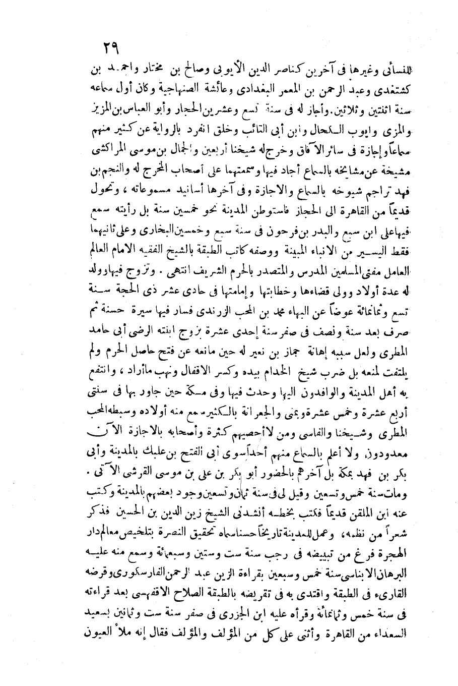 للنسائي وَغَيرهَا فِي آخَرين كناصر الدّين الأيوبي وَصَالح بن مُخْتَار وَأحمد بن كشتغدي وَعبد الرَّحْمَن بن المعمر الْبَغْدَادِيّ وَعَائِشَة الصنهاجية وَكَانَ أول سَمَاعه سنة اثْنَتَيْنِ وَثَلَاثِينَ وَأَجَازَ لَهُ فِي سنة تسع وَعشْرين الحجار وَأَبُو الْعَبَّاس بن المزيز والمزي وَأَيوب الكحال وَابْن أبي التائب وَخلق انْفَرد بالرواية عَن كثير مِنْهُم سَمَاعا وإجازة فِي سَائِر الْآفَاق وَخرج لَهُ شَيخنَا أَرْبَعِينَ وَالْجمال بن مُوسَى المراكشي مشيخة عَن مشايخه بِالسَّمَاعِ أَجَاد فِيهَا وسمعتهما على أَصْحَاب الْمخْرج لَهُ والنجم بن فَهد تراجم شُيُوخه بِالسَّمَاعِ وَالْإِجَازَة وَفِي آخرهَا أَسَانِيد مسموعاته وتحول قَدِيما من الْقَاهِرَة إِلَى الْحجاز فاستوطن الْمَدِينَة نَحْو خمسين سنة بل رَأَيْته سمع فِيهَا على ابْن سبع والبدر بن فَرِحُونَ فِي سنة سبع وَخمسين البُخَارِيّ وعَلى ثَانِيهمَا فَقَط الْيَسِير من الأنباء المبينة وَوَصفه كَاتب الطَّبَقَة بالشيخ الْفَقِيه الإِمَام الْعَالم الْعَامِل مفتي الْمُسلمين الْمدرس والمتصدر بِالْحرم الشريف انْتهى وَتزَوج فِيهَا وَولد لَهُ عدَّة أَوْلَاد وَولي قضاءها وخطابتها وإمامتها فِي حادي عشر ذِي الْحجَّة سنة تسع وَثَمَانمِائَة عوضا عَن الْبَهَاء مُحَمَّد بن الْمُحب الزرندي فَسَار فِيهَا سيرة حَسَنَة ثمَّ صرف بعد سنة وَنصف فِي صفر سنة إِحْدَى عشرَة بِزَوْج ابْنَته الرضى أبي حَامِد المطري وَلَعَلَّ سَببه إهانة جماز بن نعير لَهُ حِين مانعه عَن فتح حَاصِل الْحرم وَلم يلْتَفت لمَنعه بل ضرب شيخ الخدام بِيَدِهِ وَكسر الأقفال وَنهب مَا أَرَادَ وانتفع بِهِ أهل الْمَدِينَة والوافدون إِلَيْهَا وَحدث فِيهَا وَفِي مَكَّة حِين جاور بهَا فِي سنتي أَربع عشرَة وَخمْس عشرَة وبمنى والجعرانة بالكثير سمع مِنْهُ أَوْلَاده وسبطه الْمُحب المطري وَشَيخنَا والفاسي وَمن لَا أحصيهم كَثْرَة وَأَصْحَابه بِالْإِجَازَةِ الْآن معدودون وَلَا أعلم بِالسَّمَاعِ مِنْهُم أحدا سوى أبي الْفَتْح بن علبك بِالْمَدِينَةِ وَأبي بكر بن فَهد بِمَكَّة بل آخِرهم بالحضور أَبُو بكر بن عَليّ بن مُوسَى الْقرشِي الْآتِي وَمَات سنة خمس وَتِسْعين وَقيل لي فِي سنة ثَمَان وَتِسْعين وجود بَعضهم بِالْمَدِينَةِ وَكتب عَنهُ ابْن الملقن قَدِيما فَكتب بِخَطِّهِ أَنْشدني الشَّيْخ زين الدّين بن الْحُسَيْن فَذكر شعرًا من نظمه وَعمل للمدينة تَارِيخا حسنا سَمَّاهُ تَحْقِيق النُّصْرَة بتلخيص معالم دَار الْهِجْرَة فرغ من تبييضه فِي رَجَب سنة سِتّ وَسِتِّينَ وَسَبْعمائة وَسمع مِنْهُ عَلَيْهِ الْبُرْهَان الأبناسي سنة خمس وَسبعين بِقِرَاءَة الزين عبد الرَّحْمَن الفارسكوري وقرضه الْقَارئ فِي الطَّبَقَة واقتدى بِهِ فِي تقريضه بالطبقة الصّلاح الأقفيسي بعد قِرَاءَته فِي سنة خمس وَثَمَانمِائَة وقرأه عَلَيْهِ ابْن الْجَزرِي فِي صفر سنة سِتّ وَثَمَانِينَ بِسَعِيد السُّعَدَاء من الْقَاهِرَة وَأثْنى على كل من الْمُؤلف والمؤلف فَقَالَ إِنَّه مَلأ الْعُيُون