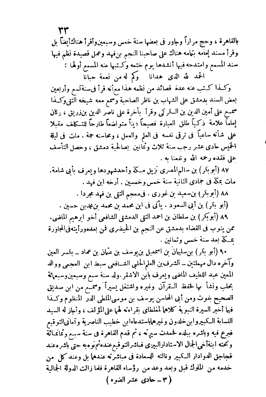 وَكَذَا كتب عَنهُ عدَّة قصائد من نظمه هَذَا مَعَ أَنه قَرَأَ فِي سنة تسع وَأَرْبَعين بعض السَّنَد بِدِمَشْق على الشهَاب بن نَاظر الصاحبة وَسمع مَعَه شَيْخه التقي وَكَذَا سمع على أَمِين الدّين بن الكركي وَقَرَأَ بِأخرَة على نَاصِر الدّين بن زُرَيْق وَكَانَ إِمَامًا عَلامَة ذكيا طلق الْعبارَة فصيحا دينا متواضعا طارحا للتكلف مُقبلا على شَأْنه ساعيا فِي ترقي نَفسه فِي الْعلم وَالْعَمَل ومحاسنه جمة مَاتَ فِي لَيْلَة الْخَمِيس حادي عشر رَجَب سنة ثَلَاث وَثَمَانِينَ بصالحية دمشق وَحصل التأسف على فَقده رَحمَه الله ونفعنا بِهِ 87 (أَبُو بكر) بن سَالم الْمصْرِيّ نزيل مَكَّة وَأحد شهودها وَيعرف بِأبي شامة مَاتَ بِمَكَّة فِي جُمَادَى الثَّانِيَة سنة خمس وَخمسين أرخه ابْن فَهد 8 {أَبُو بكر) بن سعيد بن غوري فِي مُعْجم التقي بن فَهد مُجَردا (أَبُو بكر) بن أبي السُّعُود يَأْتِي فِي ابْن مُحَمَّد بن مُحَمَّد بن مُحَمَّد بن حُسَيْن 89 (أَبُو بكر) بن سُلْطَان بن أَحْمد التقي الدِّمَشْقِي الشَّافِعِي أَخُو إِبْرَاهِيم الْمَاضِي مِمَّن يَنُوب فِي الْقَضَاء بِدِمَشْق عَن النَّجْم بن الخيضري فَمن بعده ورأيته فِي الْمُجَاورَة بِمَكَّة بعد سنة خمس وَثَمَانِينَ 90 (أَبُو بكر) بن سُلَيْمَان بن إِسْمَاعِيل بن يُوسُف بن عُثْمَان بن عماد بِكَسْر الْعين وَآخره دَال مهملتين الشّرف بن الْعلم الْحلَبِي الشَّافِعِي سبط ابْن العجمي ووالد الْمعِين عبد اللَّطِيف الْمَاضِي وَيعرف بِابْن الْأَشْقَر ولد سنة سبع وَسبعين وَسَبْعمائة بحلب وَنَشَأ بهَا فحفظ الْقُرْآن وَغَيره واشتغل يَسِيرا وَسمع من ابْن صديق الصَّحِيح بفوت وَمن أبي المحاسن يُوسُف بن مُوسَى الْمَلْطِي الدّرّ المنظوم وَكَذَا فِيمَا أخبر السِّيرَة النَّبَوِيَّة كِلَاهُمَا لمغلطاي بقرَاءَته لَهما عل الْمُؤلف وَأَجَازَ لَهُ السَّيِّد النسابة الْكَبِير وَابْن خلدون وَغَيرهمَا باستدعاء ابْن خطيب الناصرية وتعانى التوقيع فبرع فِيهِ وباشره بِبَلَدِهِ فخمدت سيرته ثمَّ قدم الْقَاهِرَة فِي سنة سبع وَثَمَانمِائَة وَتَحْته ابْنة أخي الْجمال الاستادار البيري فباشر التوقيع عِنْده ثمَّ نوه بِهِ حَتَّى بَاشرهُ عِنْد قجاجق الدوادار الْكَبِير ونالته السَّعَادَة فِي مُبَاشَرَته عِنْدهمَا بل وَعند كل من خدمه من الْمُلُوك قبل وَبعد وعد من رُؤَسَاء الْقَاهِرَة فَلَمَّا زَالَت الدولة الجمالية
