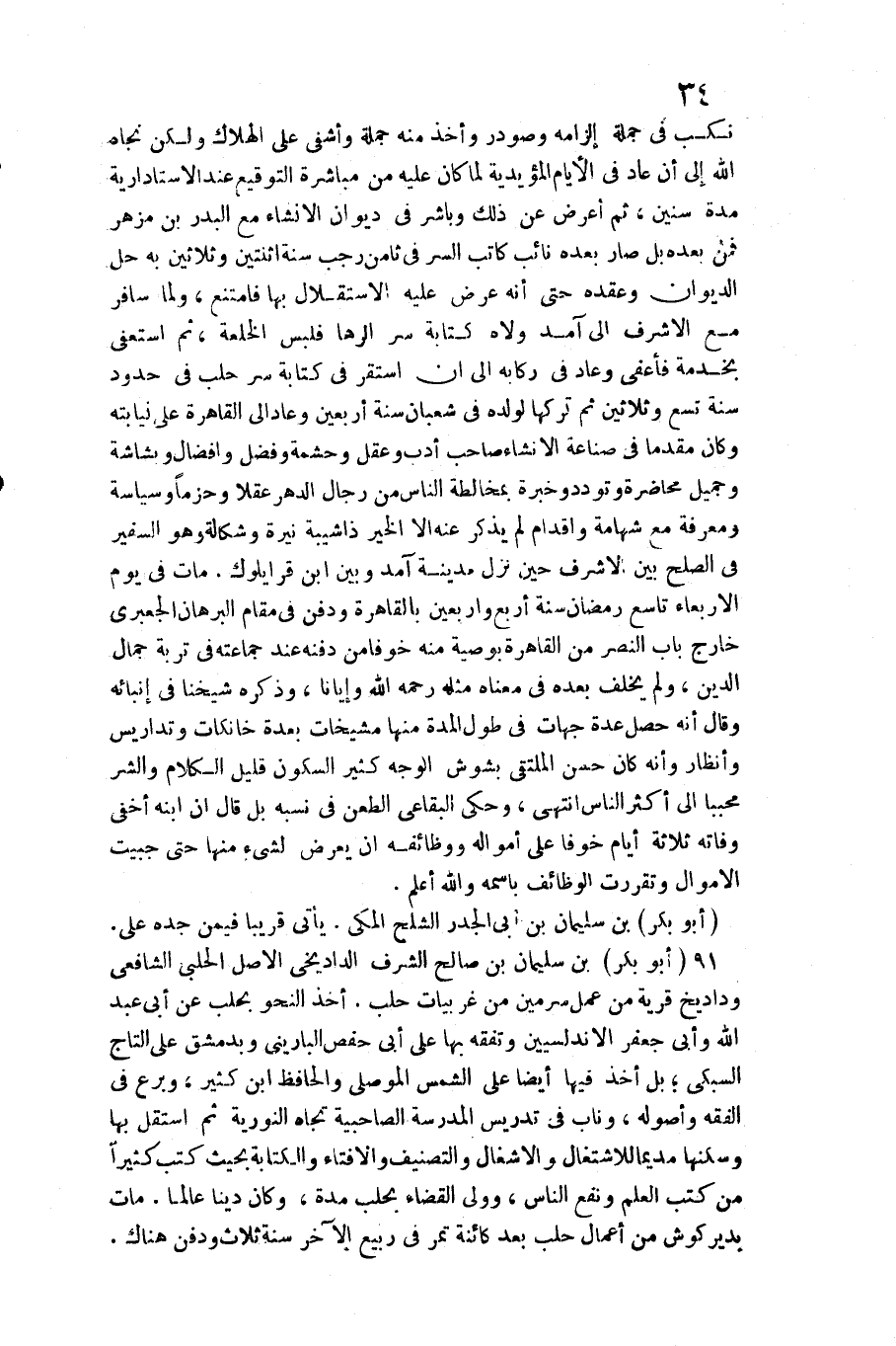 نكب فِي جملَة إِلْزَامه وصودر وَأخذ مِنْهُ جملَة وأشفى على الْهَلَاك وَلَكِن نجاه الله إِلَى أَن عَاد فِي الْأَيَّام المؤيدية لما كَانَ عَلَيْهِ من مُبَاشرَة التوقيع عِنْد الاستادارية مُدَّة سِنِين ثمَّ أعرض عَن ذَلِك وباشر فِي ديوَان الْإِنْشَاء مَعَ الْبَدْر بن مزهر فَمن بعده بل صَار بعده نَائِب كَاتب السِّرّ فِي ثامن رَجَب سنة اثْنَتَيْنِ وَثَلَاثِينَ بِهِ حل الدِّيوَان وعقده حَتَّى أَنه عرض عَلَيْهِ الِاسْتِقْلَال بهَا فَامْتنعَ وَلما سَافر مَعَ الْأَشْرَف إِلَى آمد ولاه كِتَابَة سر الرها فَلبس الخلعة ثمَّ استعفى بِخِدْمَة فأعفى وَعَاد فِي ركابه إِلَى أَن اسْتَقر فِي كِتَابَة شَرّ حلب فِي حُدُود سنة تسع وَثَلَاثِينَ ثمَّ تَركهَا لوَلَده فِي شعْبَان سنة أَرْبَعِينَ وَعَاد إِلَى الْقَاهِرَة على نيابته وَكَانَ مقدما فِي صناعَة الْإِنْشَاء صَاحب أدب وعقل وحشمة وَفضل وإفضال وبشاشة وَجَمِيل محاضرة وتودد وخبرة بمخالطة النَّاس من رجال الدَّهْر عقلا وحزما وسياسة وَمَعْرِفَة مَعَ شهامة وإقدام لم يذكر عَنهُ إِلَّا الْخَيْر ذَا شيبَة نيرة وشكالة وَهُوَ السفير فِي الصُّلْح بَين الْأَشْرَف حِين نزل مَدِينَة آمد وَبَين ابْن قرايلوك مَاتَ فِي يَوْم الْأَرْبَعَاء تَاسِع رَمَضَان سنة أَربع وَأَرْبَعين بِالْقَاهِرَةِ وَدفن فِي مقَام الْبُرْهَان الجعبري خَارج بَاب النَّصْر من الْقَاهِرَة بِوَصِيَّة مِنْهُ خوفًا من دَفنه عِنْد جماعته فِي تربة جمال الدّين وَلم يخلف بعده فِي مَعْنَاهُ مثله رَحمَه الله وإيانا وَذكره شَيخنَا فِي إنبائه وَقَالَ أَنه حصل عدَّة جِهَات فِي طول الْمدَّة مِنْهَا مشيخات بعدة خانكات وتداريس وأنظار وَأَنه كَانَ حسن الْمُلْتَقى بشوش الْوَجْه كثير السّكُون قَلِيل الْكَلَام وَالشَّر محببا إِلَى أَكثر النَّاس انْتهى وَحكى البقاعي الطعْن فِي نسبه بل قَالَ أَن ابْنه أخْفى وَفَاته ثَلَاثَة أَيَّام خوفًا على أَمْوَاله ووظائفه أَن يعرض لشَيْء مِنْهَا حَتَّى جبيت الْأَمْوَال وتقررت الْوَظَائِف باسمه وَالله أعلم (أَبُو بكر) بن سُلَيْمَان بن أبي الْجدر الشلح الْمَكِّيّ يَأْتِي قَرِيبا فِيمَن جده عَليّ 9 (أَبُو بكر) بن سُلَيْمَان بن صَالح الشّرف الداديخي الأَصْل الْحلَبِي الشَّافِعِي وداديخ قَرْيَة من عمل سرمين من غربيات حلب أَخذ النَّحْو بحلب عَن أبي عبد الله وَأبي جَعْفَر الأندلسيين وتفقه بهَا على أبي حَفْص الباريني وبدمشق على التَّاج السُّبْكِيّ بل أَخذ فِيهَا أَيْضا على الشَّمْس الْموصِلِي والحافظ ابْن كثير وبرع فِي الْفِقْه وأصوله وناب فِي تدريس الْمدرسَة الصاحبية تجاه النورية ثمَّ اسْتَقل بهَا وسكنها مديما للاشتغال والأشغال والتصنيف والإفتاء وَالْكِتَابَة بِحَيْثُ كتب كثيرا من كتب الْعلم ونفع النَّاس وَولي الْقَضَاء بحلب مُدَّة وَكَانَ دينا عَالما مَاتَ بدير كوش من أَعمال حلب بعد كائنة تمر فِي ربيع الآخر سنة ثَلَاث وَدفن هُنَاكَ