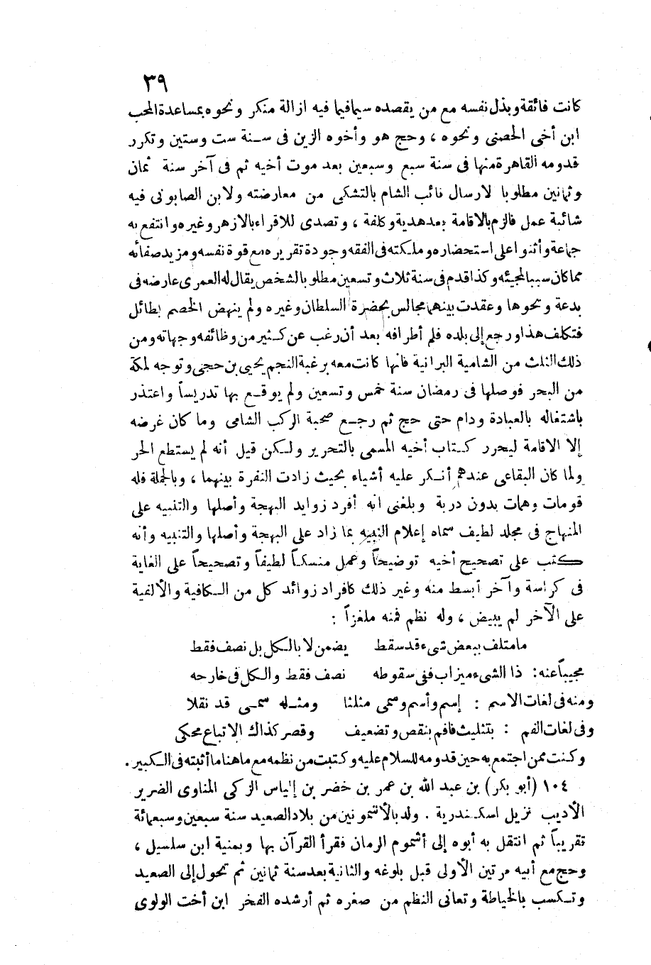 وَكنت مِمَّن اجْتمع بِهِ حِين قدومه للسلام عَلَيْهِ وكتبت من نظمه مَعَ مَا هُنَا مَا أثْبته فِي الْكَبِير 104 (أَبُو بكر) بن عبد الله بن عمر بن خضر بن إلْيَاس الزكي الْمَنَاوِيّ الضَّرِير الاديب نزيل اسكندرية ولد بالأشمونين من بِلَاد الصَّعِيد سنة سبعين وَسَبْعمائة تَقْرِيبًا ثمَّ انْتقل بِهِ أَبوهُ إِلَى أشموم الرُّمَّان فَقَرَأَ الْقُرْآن بهَا وبمنية ابْن سلسيل وَحج مَعَ أَبِيه مرَّتَيْنِ الأولى قبل بُلُوغه وَالثَّانيَِة بعد سنة ثَمَانِينَ ثمَّ تحول إِلَى الصَّعِيد وتكسب بالخياطة وتعانى النّظم من صغره ثمَّ أرشده الْفَخر ابْن أُخْت الولوي