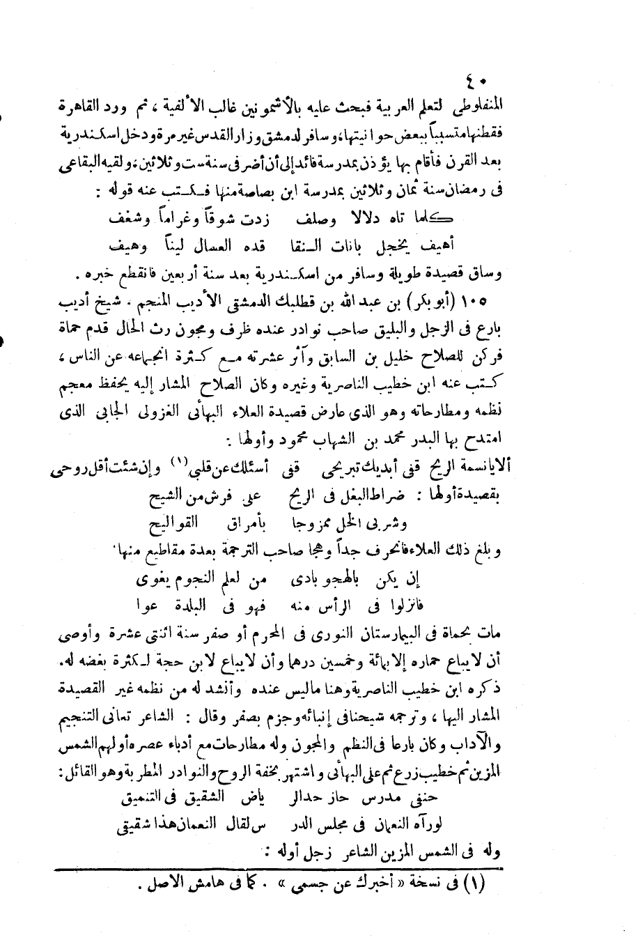 وسَاق قصيدة طَوِيلَة وسافر من اسكندرية بعد سنة أَرْبَعِينَ فَانْقَطع خَبره 105 (أَبُو بكر) بن عبد الله بن قطلبك الدِّمَشْقِي الأديب المنجم شيخ أديب بارع فِي الزجل والبليق صَاحب نَوَادِر عِنْده ظرف ومجون رث الْحَال قدم حماة فركن للصلاح خَلِيل بن السَّابِق وَأثر عشرته مَعَ كَثْرَة انجماعه عَن النَّاس كتب عَنهُ ابْن خطيب الناصرية وَغَيره وَكَانَ الصّلاح الْمشَار إِلَيْهِ يحفظ مُعْجم نظمه ومطارحاته وَهُوَ الَّذِي عَارض قصيدة الْعَلَاء البهائي الغزولي الجابي الَّذِي امتدح بهَا الْبَدْر مُحَمَّد بن الشهَاب مَحْمُود وأولها