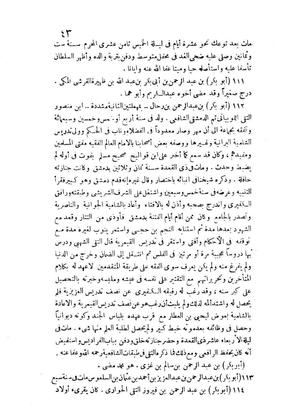 مَاتَ بعد توعك نَحْو عشرَة أَيَّام فِي لَيْلَة الْخَمِيس ثامن عشري الْمحرم سنة سِتّ وَثَمَانِينَ وَصلى عَلَيْهِ ضحى الْغَد فِي محفل متوسط وَدفن بتربة وَالِده وَأظْهر السُّلْطَان تأسفا عَلَيْهِ واستأصله حَيا وَمَيتًا عَفا الله عَنهُ وإيانا 11 (أَبُو بكر) بن عبد الرَّحْمَن بن أبي بكر بن عبد الله بن ظهيرة الْقرشِي الْمَكِّيّ درج صَغِيرا وَقد مضى أَخُوهُ عبد الْكَرِيم وأبوهما 11 (أَبُو بكر) بن عبد الرَّحْمَن بن رحال بمهملتين الثَّانِيَة مُشَدّدَة ابْن مَنْصُور التقي اللوبيان ثمَّ الدِّمَشْقِي الشَّافِعِي ولد فِي سنة أَربع أَو خمس وَخمسين وَسَبْعمائة وتفقه بِجَمَاعَة إِلَى أَن مهر وَصَارَ معدودا فِي الْفُضَلَاء وناب فِي الحكم وَولي تدريس الشامية البرانية وَغَيرهَا وَوَصفه بعض أَصْحَابنَا بِالْإِمَامِ الْعَالم الْفَقِيه مفتي الْمُسلمين ومفيدهم وَكَانَ قد سمع كَمَا أخبر على ابْن قواليح صَحِيح مُسلم بفوت فِي أَوله لم يضْبط وَحدث وَمَات فِي ذِي الْقعدَة سنة ثَمَان وَثَلَاثِينَ بِدِمَشْق وَكَانَت جنَازَته حافلة وَذكره شَيخنَا فِي أنبائه بِاخْتِصَار وَقَالَ غَيره إِنَّه قدم دمشق وَهُوَ كَبِير فَقَرَأَ التَّنْبِيه وَعرضه فِي سنة خمس وَسبعين واشتغل على الشّرف الشريشي وطبقته ورافق الكفيري واندرج بصحبه وَأذن لَهُ بالإفتاء وَأعَاد بالشامية الجوانية والناصرية وتصدر بالجامع وَكَانَ مِمَّن أَقَامَ أَيَّام الْفِتْنَة بِدِمَشْق فأوذي من التتار وَقعد مَعَ الشُّهُود بعْدهَا مُدَّة ثمَّ استنابه النَّجْم بن حجي وَاسْتمرّ يَنُوب لغيره مُدَّة مَعَ توقفه فِي الْأَحْكَام وَأفْتى وَاسْتقر فِي تدريس القيمرية قَالَ التقى الشهبي ودرس بهَا دروسا عَجِيبَة مرّة أَو مرَّتَيْنِ فِي الْفلس ثمَّ انْتقل إِلَى الضَّمَان وَخرج من الدُّنْيَا وَلم يفرغ مِنْهُ وَلم يكن يعرف سوى الْفِقْه على طَريقَة الْمُتَقَدِّمين لَا عهد لَهُ بِكَلَام الْمُتَأَخِّرين وتحريراتهم مَعَ التقتير على نَفسه فِي عيشه وملبسه وخبرته بالتحصيل على كبر سنه وَقد رغب لَهُ رَفِيقه الكفير عَن نصف تدريس العزيزية فَلم يحصل لَهُ وَاشْتَدَّ ألمه لذَلِك وَلم يلبث أَن رغب هُوَ عَن نصف تدريس القيمرية والإعادة بالشامية بعوض ليحيى بن الْعَطَّار مَعَ قرب عَهده بلباس الْجند وَكَونه ديوانيا وَحصل فِي وظائفه بعد مَوته خبط كَبِير وَلم يحصل لطلبة الْعلم مِنْهَا شَيْء مَاتَ فِي لَيْلَة الْأَرْبَعَاء عَاشر ذِي الْقعدَة وَحضر جنَازَته خلق وَدفن بِبَاب الفراديس واستفيض أَنه كَانَ يحفظ الرَّافِعِيّ وَمَعَ ذَلِك فَمَا ذكره التقى فِي طَبَقَات الشَّافِعِيَّة رَحمَه الله وَعَفا عَنهُ (أَبُو بكر) بن عبد الرَّحْمَن بن سَالم بن غزى هُوَ مُحَمَّد مضى 113 (أَبُو بكر) بن عبد الرَّحْمَن بن عبد الْعَزِيز بن أَحْمد بن عُثْمَان بن السلعوس مَاتَ فِي سنة سبع 114 (أَبُو بكر) بن عبد الرَّحْمَن بن فَيْرُوز التقى الْحوَاري كَانَ يقرئ أَوْلَاد