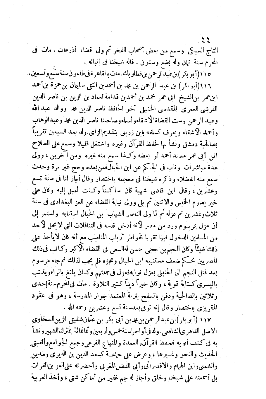 التَّاج السُّبْكِيّ وَسمع من بعض أَصْحَاب الْفَخر ثمَّ ولي قَضَاء أَذْرُعَات مَاتَ فِي الْمحرم سنة ثَمَان وَله بضع وَسِتُّونَ قَالَه شَيخنَا فِي إنبائه 115 (أَبُو بكر) بن عبد الرَّحْمَن بن قطلوبك مَاتَ بِالْقَاهِرَةِ فِي طاعون سنة سبع وَتِسْعين 116 (أَبُو بكر) بن عبد الرحمن بن مُحَمَّد بن أَحْمد بن التقي سُلَيْمَان بن حَمْزَة بن أَحْمد ابْن عمر بن الشَّيْخ أبي عمر مُحَمَّد بن أَحْمد بن قدامَة الْعِمَاد بن الزين بن نَاصِر الدّين الْقرشِي الْعمريّ الْمَقْدِسِي الْحَنْبَلِيّ أَخُو الْحَافِظ نَاصِر الدّين مُحَمَّد ووالد عبد الله وَعبد الرَّحْمَن وست الْقُضَاة الأشقاء وَأَسْمَاء وصاحبنا نَاصِر الدّين مُحَمَّد وَعبد الْوَهَّاب وَأحمد الأشقاء وَيعرف كسلفه بِابْن زُرَيْق بِتَقْدِيم الزَّاي ولد بعد السّبْعين تَقْرِيبًا بصالحية دمشق وَنَشَأ بهَا فحفظ الْقُرْآن وَغَيره واشتغل قَلِيلا وَسمع على الصّلاح أَن ابي عمر مُسْند أَحْمد أَو بعضه وَكَذَا سمع مِنْهُ غَيره وَمن آخَرين وَولي عدَّة مباشرات وناب فِي الحكم عَن ابْن الحبال فَمن بعده وَحج غير مرّة وَحدث سمع مِنْهُ الْفُضَلَاء وَذكره شَيخنَا فِي مُعْجَمه بِاخْتِصَار وَقَالَ أجَاز لنا فِي سنة تسع وَعشْرين وَقَالَ ابْن قَاضِي شُهْبَة كَانَ سَاكِنا وَكنت أميل إِلَيْهِ وَكَانَ على خير يَصُوم الْخَمِيس والاثنين ثمَّ بلَى وَولي نِيَابَة الْقَضَاء عَن الْعِزّ الْبَغْدَادِيّ فِي سنة ثَلَاث وَعشْرين ثمَّ عَزله ثمَّ لما ولي النَّاصِر الشهَاب بن الحبال استنابه وَاسْتمرّ إِلَى أَن عزل بمرسوم ورد من مصر لِأَنَّهُ أَدخل نَفسه فِي التناقلات الَّتِي لَا يحل لأحد من الْمُسلمين الدُّخُول فِيهَا تقربا لخواطر أَرْبَاب المناصب مَعَ أَنه كَانَ لَا يَأْخُذ على ذَلِك شَيْئا وَكَانَ النَّجْم بن حجي حسن لَهُ السَّعْي فِي الْقَضَاء الْأَكْبَر وَكَاتب فِي ذَلِك المصريين بِحكم ضعف مستنيبه ابْن الحبال وعجزه فَلم يجب لذَلِك ثمَّ جَاءَ مرسوم بعد قتل النَّجْم إِلَى الْحَنْبَلِيّ بعزل نوابه فعزل فِي جُمْلَتهمْ وَكَانَ يلثغ بالراء وَيكْتب باليسرى كِتَابَة قَوِيَّة وَكَانَ خيرا دينا كثير التِّلَاوَة مَاتَ فِي الْمحرم سنة إِحْدَى وَثَلَاثِينَ بالصالحية وَدفن بالسفح بتربة الْمُعْتَمد جوَار الْمدرسَة وَهُوَ فِي عُقُود المقريزي بِاخْتِصَار وَقَالَ إِنَّه توفّي بعد سنة تسع وَعشْرين رَحمَه الله 117 (أَبُو بكر) بن عبد الرَّحْمَن بن مُحَمَّد بن أبي بكر بن عُثْمَان شقيقي الزين السخاوي الأَصْل القاهري الشَّافِعِي ولد فِي أَوَاخِر سنة خمس وَأَرْبَعين وَثَمَانمِائَة بمنزلنا الشهير وَنَشَأ بِهِ فِي كنف أَبَوَيْهِ فحفظ الْقُرْآن والعمدة والمنهاج الفرعي وَجمع الْجَوَامِع وألفيتي الحَدِيث والنحو وَغَيرهَا وَعرض على جمَاعَة كسعد الدّين بن الديري ومدين والشمني وَابْن الْهمام والأقصرائي وَأبي الْفضل المغربي وأحضرته على الْعِزّ بن الْفُرَات بل أسمعته على شَيخنَا وَخلق وَأَجَازَ لَهُ جم غفير من أَمَاكِن شَتَّى وَأخذ الْعَرَبيَّة