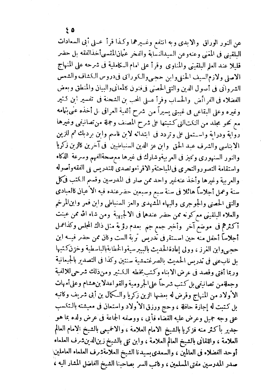عَن النُّور الْوراق والابدي وَبِه انْتفع وَغَيرهمَا وَكَذَا قَرَأَ على ابي السعادات البُلْقِينِيّ فِي المغنى وَعنهُ وَعَن السَّيِّد النسابة وَالْفَخْر عُثْمَان المقسي أَخذ الْفِقْه بل حضر قَلِيلا عِنْد الْعلم البُلْقِينِيّ والمناوي وَقَرَأَ على إِمَام الكاملية فِي شَرحه على الْمِنْهَاج الْأَصْلِيّ ولازم السَّيْف الْحَنَفِيّ وَابْن حجى والكوراني فِي دروس الْكَشَّاف وَالشَّمْس الشرواني فِي أصُول الدّين والتقي الحصني فِي فنون كالمعاني وَالْبَيَان والمنطق وَبَعض الْفُضَلَاء فِي الْفَرَائِض والحساب وَقَرَأَ على الْمُحب بن الشّحْنَة فِي تَفْسِير ابْن كثير وَغَيره وعَلى البقاعي فِي غيبتي يَسِيرا من شرح ألفية الْعِرَاقِيّ بل أَخذه عني بِتَمَامِهِ مَعَ نَحْو مُجَلد من النكت الَّتِي كتبتها على شرح المُصَنّف وَجُمْلَة من تصانيفي وَغَيرهَا رِوَايَة ودراية واستملى عَليّ وَتردد فِي ابْتِدَائه لِابْنِ قَاسم وَابْن بردبك ثمَّ للزين الأبناسي والشرف عبد الْحق وَابْن عز الدّين السنباطيين فِي آخَرين كالزين زَكَرِيَّا والنور السنهوري وتميز فِي الْعَرَبيَّة وشارك فِي غَيرهَا مَعَ صِحَة الْفَهم وَسُرْعَة الذكاء واستقامة التَّصَوُّر والتحري فِي المباحثة والإقراء وتصدى للتدريس فِي الْفِقْه وأصوله والعربية وَغَيرهَا وَأخذ عَنهُ غير وَا حد مِمَّن صَار فِي المدرسين وَقسم الْكتب فِي كل سنة وَعمل أجلاسا هائلا فِي سنة سبع وَسبعين حضر عِنْده فِيهِ الْأَعْيَان كالعبادي والتقى الحصني والجوجري والبهاء المشهدي والعز السنباطي وَابْن قمر وَابْن المرخم والْعَلَاء البُلْقِينِيّ مَعَ كَونه مِمَّن حضر عِنْدهمَا فِي الألجيهية وَمن شَاءَ الله مِمَّن عينت أَكْثَرهم فِي مَوضِع آخر وَأخْبر جمع جم بِعَدَمِ رُؤْيَة مثل ذَاك الْمجْلس وَكَذَا عمل أجلاسا أحفل مِنْهُ حِين اسْتَقر فِي تدريس تربة السِّت وَكَانَ مِمَّن حضر فِيهِ ابْن حجي وَابْن الغرز وَولي إِعَادَة الحَدِيث بالبيبرسية والخطابة بالباسطية وخزن كتبهَا بل نَاب عني فِي تدريس الحَدِيث بالصرغتمشية سنتَيْن وَكَذَا فِي التصدير بالجيعانية وَرُبمَا أفتى وَقصد فِي عرض الْأَبْنَاء وَكتب بِخَطِّهِ الْكثير وَمن ذَلِك شرحي للألفية وَجُمْلَة من تصانيفي بل كتب شرحا على الجرومية وَالْقَوَاعِد لِابْنِ هِشَام وعَلى أُمَّهَات الْأَوْلَاد من الْمِنْهَاج وقرض لَهُ بَعْضهَا الزين زَكَرِيَّا والكمال بن أبي شرِيف وكاتبه بل كتبت لَهُ إجَازَة حافلة وَحج ورزق الْأَوْلَاد واستعان فِي معيشته بالتكسب على وَجه جميل وَعرض عَلَيْهِ الْقَضَاء فَأبى وَوَصفه الْجَمَاعَة فِي عرض وَلَده بِمَا هُوَ جدير بِأَكْثَرَ مِنْهُ فزكريا بالشيخ الإِمَام الْعَلامَة والأخميمي بالشيخ الإِمَام الْعَالم الْعَلامَة واللقاني بالشيخ الْعَالم الْعَلامَة وَابْن تَقِيّ بالشيخ زين الدّين شرف الْعلمَاء أوحد الْفُضَلَاء فِي الْعَالمين وَالسَّعْدِي بسيدنا الشَّيْخ الْعَلامَة شرف الْعلمَاء العاملين صدر المدرسين مفتي الْمُسلمين وَكَاتب السِّرّ بصاحبنا الشَّيْخ الْفَاضِل الْمشَار إِلَيْهِ