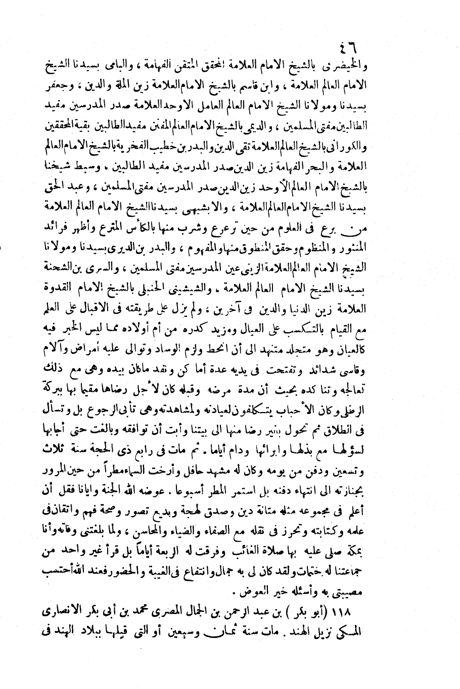 والخيضرمي بالشيخ الإِمَام الْعَلامَة الْمُحَقق المتقن الفهامة والبامي بسيدنا الشَّيْخ الإِمَام الْعَالم الْعَلامَة وَابْن قَاسم بالشيخ الإِمَام الْعَلامَة زين الْملَّة وَالدّين وجعفر بسيدنا ومولانا الشَّيْخ الإِمَام الْعَالم الْعَامِل الأوحد الْعَلامَة صدر المدرسين مُفِيد الطالبين مفتي الْمُسلمين والديمي بالشيخ الإِمَام الْعَالم المفنن مُفِيد الطالبين بَقِيَّة الْمُحَقِّقين والكوراني بالشيخ الْعَالم الْعَلامَة تَقِيّ الدّين والبدر بن خطيب الفخرية بالشيخ الإِمَام الْعَالم الْعَلامَة وَالْبَحْر الفهامة زين الدّين صدر المدرسين مُفِيد الطالبين وسبط شَيخنَا بالشيخ الإِمَام الْعَالم الأوحد زين الدّين صدر المدرسين مفتي الْمُسلمين وَعبد الْحق بسيدنا الشَّيْخ الإِمَام الْعَالم الْعَلامَة والابشبهي بسيدنا الشَّيْخ الإِمَام الْعَالم الْعَلامَة من برع فِي الْعُلُوم من حِين ترعرع وَشرب مِنْهَا بالكأس المترع وَأظْهر فرائد المنثور والمنظوم وحقق الْمَنْطُوق مِنْهَا وَالْمَفْهُوم والبدر بن الديري بسيدنا ومولانا الشَّيْخ الإِمَام الْعَالم الْعَلامَة الزيني عين المدرسين مفتي الْمُسلمين وَالسري بن الشّحْنَة بسيدنا الشَّيْخ الإِمَام الْعَالم الْعَلامَة والشيشيني الْحَنْبَلِيّ بالشيخ الإِمَام الْقدْوَة الْعَلامَة زين الدُّنْيَا وَالدّين فِي آخَرين وَلم يزل على طَرِيقَته فِي الإقبال على الْعلم مَعَ الْقيام بالتكسب على الْعِيَال ومزيد كدره من أم أَوْلَاده مِمَّا لَيْسَ الْخَبَر فِيهِ كالعيان وَهُوَ متجلد متنهد إِلَى أَن انحط وَلزِمَ الوساد وتوالى عَلَيْهِ أمراض وآلام وقاسى شَدَائِد وتفتحت فِي يَدَيْهِ عدَّة أَمَاكِن ونفد مَا كَانَ بِيَدِهِ وَهِي مَعَ ذَلِك تعالجه وتناكده بِحَيْثُ أَن مُدَّة مَرضه وَقَبله كَانَ لأجل رِضَاهَا مُقيما بهَا ببركة الرطلى وَكَانَ الأحباب يتكلفون لعيادته ولمشاهدته وَهِي تأبى الرُّجُوع بل وتسأل فِي الطَّلَاق ثمَّ تحول بِغَيْر رضَا مِنْهَا إِلَى بيتنا وأبت أَن توافقه وبالغت حَتَّى أجابها لسؤلها مَعَ بذلها وإبرائها ودام أَيَّامًا ثمَّ مَاتَ فِي رَابِع ذِي الْحجَّة سنة ثَلَاث وَتِسْعين وَدفن من يَوْمه وَكَانَ لَهُ مشْهد حافل وأرخت السَّمَاء مَطَرا من حِين الْمُرُور بجنازته إِلَى انْتِهَاء دَفنه بل اسْتمرّ الْمَطَر أسبوعا عوضه الله الْجنَّة وإيانا فَقل أَن أعلم فِي مَجْمُوعه مثله متانة دين وَصدق لهجة وبديع تصور وَصِحَّة فهم واتقان فِي علمه وكتابته وتحرز فِي نَقله مَعَ الصفاء والضياء والمحاسن وَلما بلغتني وَفَاته وَأَنا بِمَكَّة صلى عَلَيْهِ بهَا صَلَاة الْغَائِب وَفرقت لَهُ الربعة أَيَّامًا بل قَرَأَ غير وَاحِد من جماعتنا لَهُ ختمات وَلَقَد كَانَ لي بِهِ جمال وانتفاع فِي الْغَيْبَة والحضور فَعِنْدَ الله أحتسب مصيبتي بِهِ وأسأله خير الْعِوَض 11 {أَبُو بكر) بن عبد الرَّحْمَن بن الْجمال الْمصْرِيّ مُحَمَّد بن أبي بكر الْأنْصَارِيّ الْمَكِّيّ نزيل الْهِنْد مَاتَ سنة ثَمَان وَسبعين أَو الَّتِي قبلهَا بِبِلَاد الْهِنْد فِي