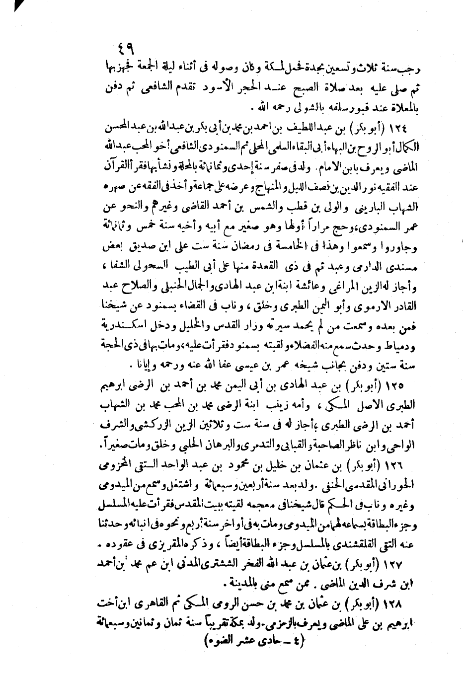 رَجَب سنة ثَلَاث وَتِسْعين بجدة فَحمل لمَكَّة وَكَانَ وُصُوله فِي أثْنَاء لَيْلَة الْجُمُعَة فَجهز بهَا ثمَّ صلى عَلَيْهِ بعد صَلَاة الصُّبْح عِنْد الْحجر الْأسود تقدم الشَّافِعِي ثمَّ دفن بالمعلاة عِنْد قبُول سلفه بالشولي رَحمَه الله 124 (أَبُو بكر) بن عبد اللَّطِيف بن أَحْمد بن مُحَمَّد بن أبي بكر بن عبد الله بن عبد المحسن الْكَمَال أَبُو الرّوح بن الْبَهَاء أبي الْبَقَاء السّلمِيّ الْمحلي ثمَّ السمنودي الشَّافِعِي أَخُو الْمُحب عبد الله الْمَاضِي وَيعرف بِابْن الإِمَام ولد فِي صفر سنة إِحْدَى وَثَمَانمِائَة بالمحلة وَنَشَأ بهَا فَقَرَأَ الْقُرْآن عِنْد الْفَقِيه نور الدّين بن نصف اللَّيْل والمنهاج وَعرضه على جمَاعَة وَأخذ فِي الْفِقْه عَن صهره الشهَاب الباريني وَالْوَلِيّ بن قطب وَالشَّمْس بن أَحْمد القَاضِي وَغَيرهم والنحو عَن عمر السمنودي وَحج مرَارًا أَولهَا وَهُوَ صَغِير مَعَ أَبِيه وأخيه سنة خمس وَثَمَانمِائَة وجاوروا وسمعوا وَهَذَا فِي الْخَامِسَة فِي رَمَضَان سنة سِتّ على ابْن صديق بعض مسندي الدَّارمِيّ وَعبد ثمَّ فِي ذِي الْقعدَة مِنْهَا على أبي الطّيب السحولي الشفا وَأَجَازَ لَهُ الزين المراغي وَعَائِشَة ابْنة ابْن عبد الْهَادِي وَالْجمال الْحَنْبَلِيّ وَالصَّلَاح عبد الْقَادِر الأرموي وَأَبُو الْيمن الطَّبَرِيّ وَخلق وناب فِي الْقَضَاء بسمنود عَن شَيخنَا فَمن بعده وَسمعت من لم يحمد سيرته وزار الْقُدس والخليل وَدخل اسكندرية ودمياط وَحدث سمع مِنْهُ الْفُضَلَاء ولقيته بسمنود فَقَرَأت عَلَيْهِ وَمَات بهَا فِي ذِي الْحجَّة سنة سِتِّينَ وَدفن بِجَانِب شَيْخه عمر بن عِيسَى عَفا الله عَنهُ ورحمه وإيانا 125 (أَبُو بكر) ابْن عبد الْهَادِي بن أبي الْيمن مُحَمَّد بن أَحْمد بن الرضي إِبْرَاهِيم الطَّبَرِيّ الأَصْل الْمَكِّيّ وَأمه زَيْنَب ابْنة الرضي مُحَمَّد بن الْمُحب مُحَمَّد بن الشهَاب أَحْمد بن الرضي الطَّبَرِيّ أجَاز لَهُ فِي سنة سِتّ وَثَلَاثِينَ الزين الزَّرْكَشِيّ والشرف الواحي وَابْن نَاظر الصاحبة والقبابي والتدمري والبرهان الْحلَبِي وَخلق وَمَات صَغِيرا 126 (أَبُو بكر) بن عُثْمَان بن خَلِيل بن مَحْمُود بن عبد الْوَاحِد التقي المَخْزُومِي الحوراني الْمَقْدِسِي الْحَنَفِيّ ولد بعد سنة أَرْبَعِينَ وَسَبْعمائة واشتغل وَسمع من الْمَيْدُومِيُّ وَغَيره وناب فِي الحكم قَالَ شَيخنَا فِي مُعْجَمه لَقيته بِبَيْت الْمُقَدّس فَقَرَأت عَلَيْهِ المسلسل وجزء البطاقة بِسَمَاعِهِ لَهما من الْمَيْدُومِيُّ وَمَات بِهِ فِي أَوَاخِر سنة أَربع وَنَحْوه فِي أنبائه وَحدثنَا عَنهُ التقي القلقشندي بالمسلسل وجزء البطاقة أَيْضا وَذكره المقريزي فِي عقوده 127 (أَبُو بكر) بن عُثْمَان بن عبد الله الْفَخر الششتري الْمدنِي ابْن عَم مُحَمَّد بن أَحْمد ابْن شرف الدّين الْمَاضِي مِمَّن سمع مني بِالْمَدِينَةِ 12 {أَبُو بكر) بن عُثْمَان بن مُحَمَّد بن حسن الرُّومِي الْمَكِّيّ ثمَّ القاهري ابْن أُخْت إِبْرَاهِيم بن عَليّ الْمَاضِي وَيعرف بالزمزمي ولد بِمَكَّة تَقْرِيبًا سنة ثَمَان وَثَمَانِينَ وَسَبْعمائة