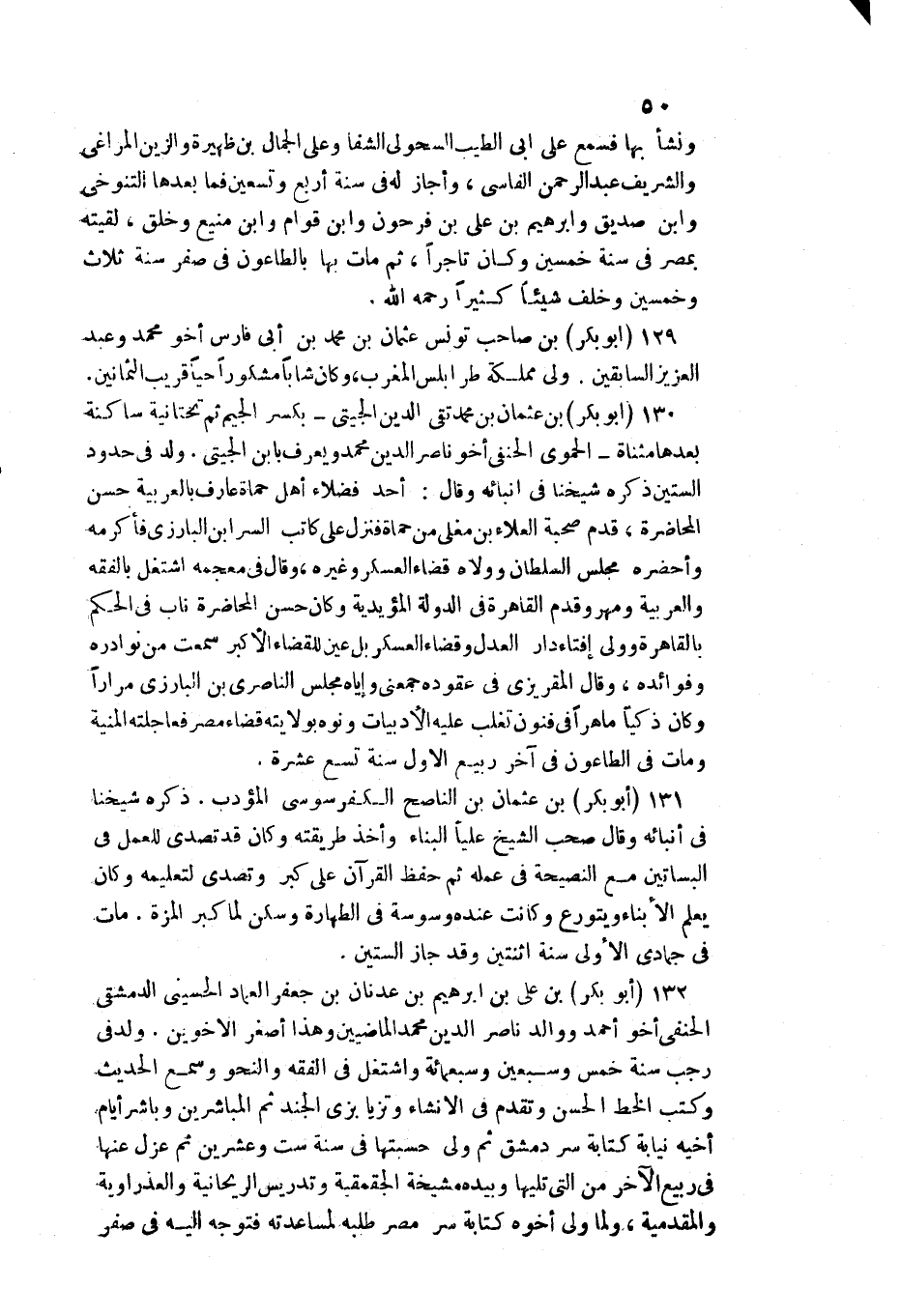 وَنَشَأ بهَا فَسمع على أبي الطّيب السحولي الشفا وعَلى الْجمال بن ظهيرة والزين المراغي والشريف عبد الرَّحْمَن الفاسي وَأَجَازَ لَهُ فِي سنة أَربع وَتِسْعين فَمَا بعْدهَا التنوخي وَابْن صديق وَإِبْرَاهِيم بن عَليّ بن فَرِحُونَ وَابْن قوام وَابْن منيع وَخلق لَقيته بِمصْر فِي سنة خمسين وَكَانَ تَاجِرًا ثمَّ مَاتَ بهَا بالطاعون فِي صفر سنة ثَلَاث وَخمسين وَخلف شَيْئا كثيرا رَحمَه الله 129 (أَبُو بكر) بن صَاحب تونس عُثْمَان بن مُحَمَّد بن أبي فَارس أَخُو مُحَمَّد وَعبد الْعَزِيز السَّابِقين ولي مملكة طرابلس الْمغرب وَكَانَ شَابًّا مشكورا حَيا قريب الثَّمَانِينَ 130 (أَبُو بكر) بن عُثْمَان بن مُحَمَّد تَقِيّ الدّين الجيتي بِكَسْر الْجِيم ثمَّ تَحْتَانِيَّة سَاكِنة بعْدهَا مثناة الْحَمَوِيّ الْحَنَفِيّ أَخُو نَاصِر الدّين مُحَمَّد وَيعرف بِابْن الجيتي ولد فِي حُدُود السِّتين ذكره شَيخنَا فِي أنبائه وَقَالَ أحد فضلاء أهل حماة عَارِف بِالْعَرَبِيَّةِ حسن المحاضرة قدم صُحْبَة الْعَلَاء بن مغلي من حماة فَنزل على كَاتب السِّرّ ابْن الْبَارِزِيّ فَأكْرمه وأحضره مجْلِس السُّلْطَان وولاه قَضَاء الْعَسْكَر وَغَيره وَقَالَ فِي مُعْجَمه اشْتغل بالفقه والعربية وَمهر وَقدم الْقَاهِرَة فِي الدولة المؤيدية وَكَانَ حسن المحاضرة نَاب فِي الحكم بِالْقَاهِرَةِ وَولي إِفْتَاء دَار الْعدْل وَقَضَاء الْعَسْكَر بل عين للْقَضَاء الْأَكْبَر سَمِعت من نوادره وفوائده وَقَالَ المقريزي فِي عقوده جمعني وإياه مجْلِس الناصري بن الْبَارِزِيّ مرَارًا وَكَانَ ذكيا ماهرا فِي فنون تغلب عَلَيْهِ الأدبيات ونوه بولايته قَضَاء مصر فعاجلته الْمنية وَمَات فِي الطَّاعُون فِي آخر ربيع الأول سنة تسع عشرَة 13 (أَبُو بكر) بن عُثْمَان بن الناصح الكفرسوسي الْمُؤَدب ذكره شَيخنَا فِي أنبائه وَقَالَ صحب الشَّيْخ عليا الْبناء وَأخذ طَرِيقَته وَكَانَ قد تصدى للْعَمَل فِي الْبَسَاتِين مَعَ النَّصِيحَة فِي عمله ثمَّ حفظ الْقُرْآن على كبر وتصدى لتعليمه وَكَانَ يعلم الْأَبْنَاء ويتورع وَكَانَت عِنْده وَسْوَسَة فِي الطَّهَارَة وَسكن لما كبر المزة مَاتَ فِي جُمَادَى الأولى سنة اثْنَتَيْنِ وَقد جَازَ السِّتين 13 (أَبُو بكر) بن عَليّ بن إِبْرَاهِيم بن عدنان بن جَعْفَر الْعِمَاد الْحُسَيْنِي الدِّمَشْقِي الْحَنَفِيّ أَخُو أَحْمد ووالد نَاصِر الدّين مُحَمَّد الماضيين وَهَذَا أَصْغَر الْأَخَوَيْنِ ولد فِي رَجَب سنة خمس وَسبعين وَسَبْعمائة واشتغل فِي الْفِقْه والنحو وَسمع الحَدِيث وَكتب الْخط الْحسن وَتقدم فِي الْإِنْشَاء وتزيا بزِي الْجند ثمَّ المباشرين وباشر أَيَّام أَخِيه نِيَابَة كِتَابَة سر دمشق ثمَّ ولي حسبتها فِي سنة سِتّ وَعشْرين ثمَّ عزل عَنْهَا فِي ربيع الآخر من الَّتِي تَلِيهَا وَبِيَدِهِ مشيخة الجقمقية وتدريس الريحانية والعذراوية والمقدمية وَلما ولي أَخُوهُ كِتَابَة سر مصر طلبه لمساعدته فَتوجه إِلَيْهِ فِي صفر