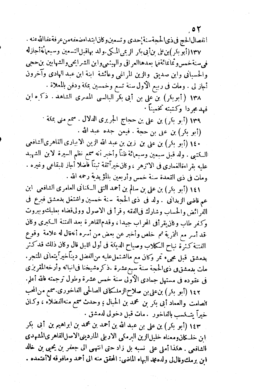 انْفِصَال الْحَج فِي ذِي الْحجَّة سنة إِحْدَى وَتِسْعين وَكَانَ ابْتِدَاء ضعفه من عَرَفَة عَفا الله عَنهُ 137 (أَبُو بكر) بن عَليّ بن أبي بكر الريمي الْمَكِّيّ ولد بهَا قبل التسعين وَسَبْعمائة أجَاز لَهُ فِي سنة خمس وَثَمَانمِائَة فَمَا بعْدهَا الْعِرَاقِيّ والهيثمي وَابْن الشرايحي والشهابين بن حجي والحسباني وَابْن صديق والزين المراغي وَعَائِشَة ابْنة ابْن عبد الْهَادِي وَآخَرُونَ أجَاز لي وَمَات فِي ربيع الأول سنة تسع وَخمسين بِمَكَّة وَدفن بالمعلاة 13 {أَبُو بكر) بن عَليّ بن أبي بكر البالسي الْمصْرِيّ الشَّاهِد ذكره ابْن فَهد مُجَردا وكتبته تخمينا 139 (أَبُو بكر) بن عَليّ بن حجاج الْجريرِي الدَّلال سمع مني بِمَكَّة (أَبُو بكر) بن عَليّ بن حجَّة فِيمَن جده عبد الله 140 (أَبُو بكر) بن عَليّ بن زين بن عبد الله الزين الأبياري القاهري الشَّافِعِي الكتبي ولد قبل سبعين وَسَبْعمائة ظنا وَأخْبر أَنه سمع نظر السِّيرَة لِابْنِ الشَّهِيد عَلَيْهِ بِقِرَاءَة الغماري فِي الْأَزْهَر وَكَانَ خيرا ثِقَة ثبتا فَاضلا أجَاز للبقاعي وَغَيره وَمَات فِي ذِي الْقعدَة سنة خمس وَأَرْبَعين بالمؤيدية رَحمَه الله 14 (أَبُو بكر) بن عَليّ بن سَالم بن أَحْمد التقي الْكِنَانِي العامري الشَّافِعِي ابْن عَم قَاضِي الزبداني ولد فِي ذِي الْحجَّة سنة خمسين واشتغل بِدِمَشْق فبرع فِي الْفَرَائِض والحساب وشارك فِي الْفِقْه وَقَرَأَ فِي الْأُصُول وَولي قَضَاء بعلبك وبيروت وَكفر طَابَ وَكَانَ يقْرَأ فِي الْمِحْرَاب جيدا وَقدم الْقَاهِرَة بعد الْفِتْنَة الْكُبْرَى وَكَانَ قد أسر مَعَ التمرية ثمَّ خلص وَأخْبر عَن بعض من أسره أَنه قَالَ لَهُ عَلامَة وُقُوع الْفِتْنَة كَثْرَة نباح الْكلاب وصياح الديكة فِي أول اللَّيْل قَالَ وَكَانَ ذَلِك قد كثر بِدِمَشْق قبل مَجِيء تمر وَكَانَ مَعَ مَا اشْتَمَل عَلَيْهِ من الْفضل دينا خيرا يتعانى المتجر مَاتَ بِدِمَشْق فِي ذِي الْحجَّة سنة سبع عشرَة ذكره شَيخنَا فِي أنبائه وأرخه المقريزي فِي عقوده فِي مستهل جُمَادَى الأولى سنة خمس عشرَة وَطول تَرْجَمته فَالله أعلم 14 (أَبُو بكر) بن عَليّ بن صَلَاح الزملكاني الصَّالِحِي الفاخوري سمع من الْمُحب الصَّامِت والعماد أبي بكر بن مُحَمَّد بن الحبال وَحدث سمع مِنْهُ الْفُضَلَاء وَكَانَ خيرا يتكسب بالفاخور مَاتَ قبل دخولي لدمشق 143 (أَبُو بكر) بن عَليّ بن عبد الله بن أَحْمد بن مُحَمَّد بن إِبْرَاهِيم بن أبي بكر بن خلكان وَمَعْنَاهُ الْخَلِيل الزين الْبَرْمَكِي الأربلي المارديني الأَصْل القاهري المشهدي الشَّافِعِي هَكَذَا أمْلى عَليّ نسبه بل زَاد حَتَّى انْتهى إِلَى جَعْفَر بن يحيى بن خَالِد بن برمك وَقَالَ لي وَلَده مُحَمَّد الْبَهَاء الْمَاضِي الْمُحَقق مِنْهُ إِلَى أَحْمد وَمَا فَوْقه لَا أعتمده