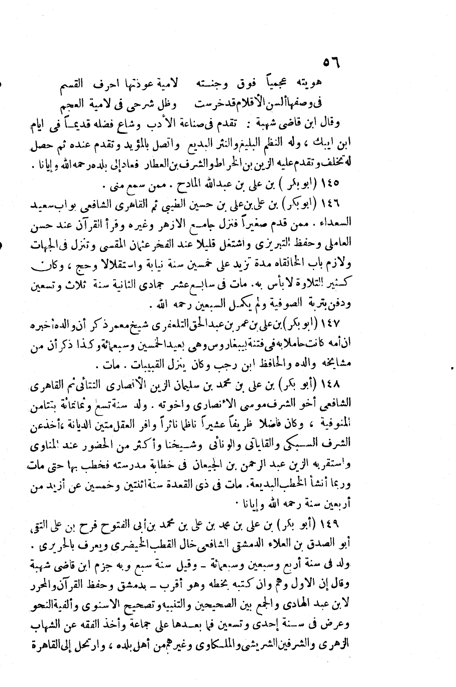 وَقَالَ ابْن قَاضِي شُهْبَة تقدم فِي صناعَة الْأَدَب وشاع فَضله قَدِيما فِي أَيَّام ابْن ايبك وَله النّظم البليغ والنثر البديع واتصل بالمؤيد وَتقدم عِنْده ثمَّ حصل لَهُ تخلف وَتقدم عَلَيْهِ الزين بن الْخَرَّاط والشرف بن الْعَطَّار فَعَاد إِلَى بَلَده رَحمَه الله وإيانا 145 (أَبُو بكر) بن عَليّ بن عبد الله المادح مِمَّن سمع مني 146 (أَبُو بكر) بن عَليّ بن حُسَيْن الطَّيِّبِيّ ثمَّ القاهري الشَّافِعِي بواب سعيد السُّعَدَاء مِمَّن قدم صَغِيرا فَنزل جَامع الْأَزْهَر وَغَيره وَقَرَأَ الْقُرْآن عِنْد حسن العاملي وَحفظ التبريزي واشتغل قَلِيلا عِنْد الْفَخر عُثْمَان المقسي وتنزل فِي الْجِهَات ولازم بَاب الخانقاه مُدَّة تزيد على خمسين سنة نِيَابَة واستقلالا وَحج وَكَانَ كثير التِّلَاوَة لَا بَأْس بِهِ مَاتَ فِي سَابِع عشر جُمَادَى الثَّانِيَة سنة ثَلَاث وَتِسْعين وَدفن بتربة الصُّوفِيَّة وَلم يكمل السّبْعين رَحمَه الله 147 (أَبُو بكر) بن عَليّ بن عمر بن عبد الْحق التلعفري شيخ معمر ذكر أَن وَالِده أخبرهُ أَن أمه كَانَت حَامِلا بِهِ فِي فتْنَة بيبغاروس وَهِي بعيد الْخمسين وَسَبْعمائة وَكَذَا ذكر أَن من مشايخه وَالِده والحافظ ابْن رَجَب وَكَانَ ينزل القبيبات مَاتَ 14 {أَبُو بكر) بن عَليّ بن مُحَمَّد بن سُلَيْمَان الزين الْأنْصَارِيّ التتائي ثمَّ القاهري الشَّافِعِي أَخُو الشّرف مُوسَى الْأنْصَارِيّ واخوته ولد سنة تسع وَثَمَانمِائَة بتتامن المنوفية وَكَانَ فَاضلا ظريفا عشيرا ناظما ناثرا وافر الْعقل متين الدّيانَة أَخذ عَن الشّرف السُّبْكِيّ والقاياتي والونائي وَشَيخنَا واكثر من الْحُضُور عِنْد الْمَنَاوِيّ واستقربه الزين عبد الرَّحْمَن بن الجيعان فِي خطابة مدرسته فَخَطب بهَا حَتَّى مَاتَ وَرُبمَا أنشأ الْخطب البديعة مَاتَ فِي ذِي الْقعدَة سنة اثْنَتَيْنِ وَخمسين عَن أَزِيد من أَرْبَعِينَ سنة رَحمَه الله وإيانا 149 (أَبُو بكر) بن عَليّ بن مُحَمَّد بن عَليّ بن مُحَمَّد بن أبي الْفتُوح فَرح بن عَليّ التقي أَبُو الصدْق بن الْعَلَاء الدِّمَشْقِي الشَّافِعِي خَال القطب الخيضري وَيعرف بالحريري ولد فِي سنة أَربع وَسبعين وَسَبْعمائة وَقيل سنة سبع وَبِه جزم ابْن قَاضِي شُهْبَة وَقَالَ إِن الأول وهم وَإِن كتبه بِخَطِّهِ وَهُوَ أقرب بِدِمَشْق وَحفظ الْقُرْآن وَالْمُحَرر لِابْنِ عبد الْهَادِي وَالْجمع بَين الصحيحن والتنبيه وَتَصْحِيح الأسنوي وألفية النَّحْو وَعرض فِي سنة إِحْدَى وَتِسْعين فَمَا بعْدهَا على جمَاعَة وَأخذ الْفِقْه عَن الشهَاب الزُّهْرِيّ والشرفين الشريشي والملكاوي وَغَيرهم من أهل بَلَده وارتحل إِلَى الْقَاهِرَة