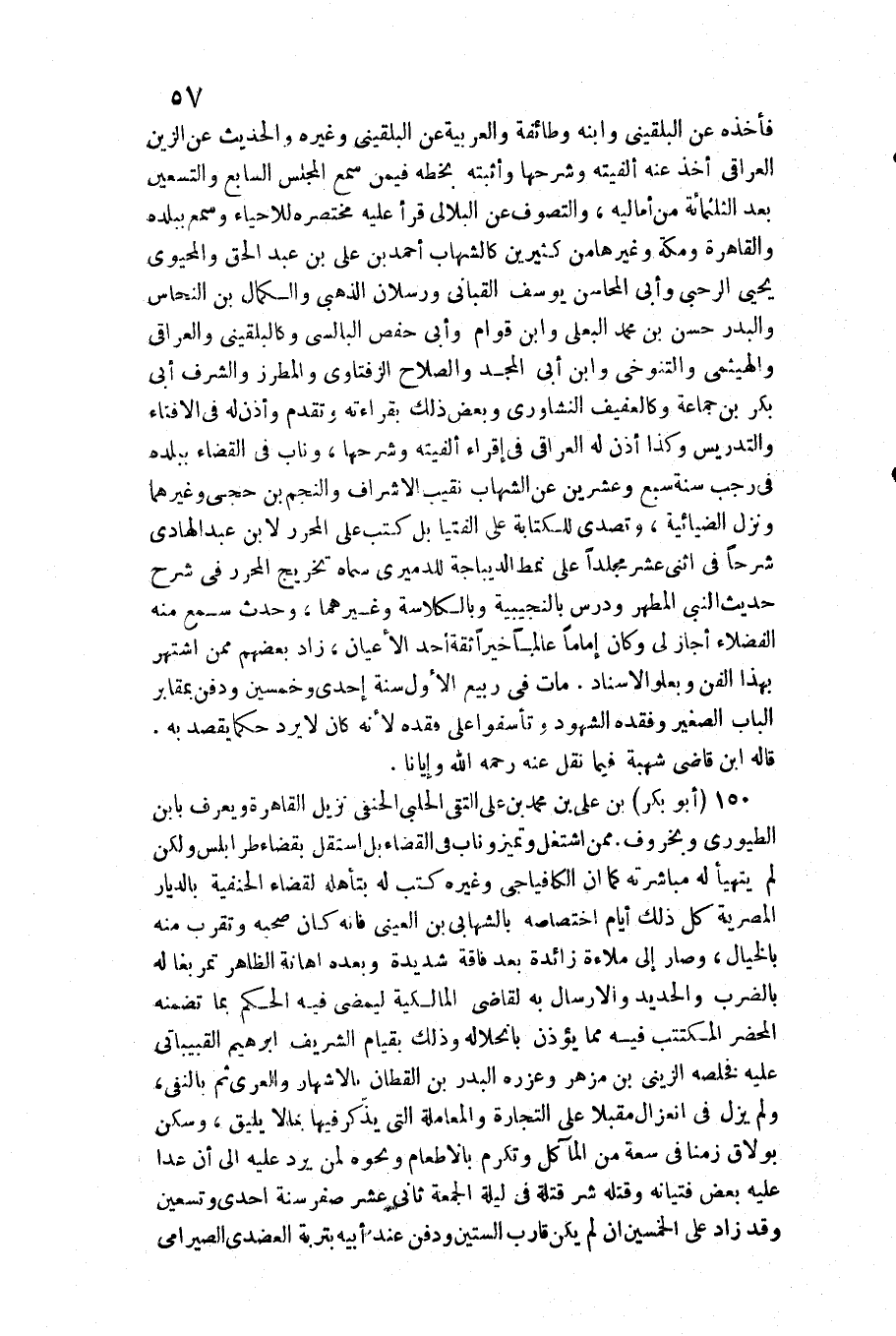 فَأَخذه عَن البُلْقِينِيّ وَابْنه وَطَائِفَة والعربية عَن البُلْقِينِيّ وَغَيره والْحَدِيث عَن الزين الْعِرَاقِيّ أَخذ عَنهُ ألفيته وَشَرحهَا وأثبته بِخَطِّهِ فِيمَن سمع الْمجْلس السَّابِع وَالتسْعين بعد الثلثمائة من أَمَالِيهِ والتصوف عَن البلالي قَرَأَ عَلَيْهِ مُخْتَصره للأحياء وَسمع بِبَلَدِهِ والقاهرة وَمَكَّة وَغَيرهَا من كثيرين كالشهاب أَحْمد بن عَليّ بن عبد الْحق والمحيوي يحيى الرَّحبِي وَأبي المحاسن يُوسُف القباني ورسلان الذَّهَبِيّ والكمال بن النّحاس والبدر حسن بن مُحَمَّد البعلي وَابْن قوام وَأبي حَفْص البالسي وكالبلقيني والعراقي والهيثمي والتنوخي وَابْن أبي الْمجد وَالصَّلَاح الزفتاوي والمطرز والشرف أبي بكر بن جمَاعَة وكالعفيف النشاوري وَبَعض ذَلِك بقرَاءَته وَتقدم وَأذن لَهُ فِي الْإِفْتَاء والتدريس وَكَذَا أذن لَهُ الْعِرَاقِيّ فِي إقراء ألفيته وَشَرحهَا وناب فِي الْقَضَاء بِبَلَدِهِ فِي رَجَب سنة سبع وَعشْرين عَن الشهَاب نقيب الْأَشْرَاف والنجم بن حجي وَغَيرهمَا وَنزل الضيائية وتصدى للكتابة على الْفتيا بل كتب على الْمُحَرر لِابْنِ عبد الْهَادِي شرحا فِي اثنى عشر مجلدا على نمط الديباجة للدميري سَمَّاهُ تَخْرِيج الْمُحَرر فِي شرح حَدِيث النَّبِي المطهر ودرس بالنجيبية وبالكلاسة وَغَيرهمَا وَحدث سمع مِنْهُ الْفُضَلَاء أجَاز لي وَكَانَ إِمَامًا عَالما خيرا ثِقَة أحد الْأَعْيَان زَاد بَعضهم مِمَّن اشْتهر بِهَذَا الْفَنّ وبعلو الْإِسْنَاد مَاتَ فِي ربيع الأول سنة إِحْدَى وَخمسين وَدفن بمقابر الْبَاب الصَّغِير وفقده الشُّهُود وتأسفوا على فَقده لِأَنَّهُ كَانَ لَا يرد حكما يقْصد بِهِ قَالَه ابْن قَاضِي شُهْبَة فِيمَا نقل عَنهُ رَحمَه الله وإيانا 150 (أَبُو بكر) بن عَليّ بن مُحَمَّد بن عَليّ التقي الْحلَبِي الْحَنَفِيّ نزيل الْقَاهِرَة وَيعرف بِابْن الطيوري وبخروف مِمَّن اشْتغل وتميز وناب فِي الْقَضَاء بل اسْتَقل بِقَضَاء طرابلس وَلَكِن لم يتهيأ لَهُ مُبَاشَرَته كَمَا أَن الكافياجي وَغَيره كتب لَهُ بتأهله لقَضَاء الْحَنَفِيَّة بالديار المصرية كل ذَلِك أَيَّام اخْتِصَاصه بالشهابي بن الْعَيْنِيّ فَإِنَّهُ كَانَ صَحبه وتقرب مِنْهُ بالخيال وَصَارَ إِلَى ملاءة زَائِدَة بعد فاقة شَدِيدَة وَبعده إهانة الظَّاهِر تمر بغاله بِالضَّرْبِ وَالْحَدِيد والإرسال بِهِ لقَاضِي الْمَالِكِيَّة ليمضي فِيهِ الحكم بِمَا تضمنه الْمحْضر المكتتب فِيهِ مِمَّا يُؤذن بانحلاله وَذَلِكَ بِقِيَام الشريف إِبْرَاهِيم القبيباتي عَلَيْهِ فخلصه الزيني بن مزهر وعزره الْبَدْر بن الْقطَّان بالإشهار والعري ثمَّ بِالنَّفْيِ وَلم يزل فِي إنعزال مُقبلا على التِّجَارَة والمعاملة الَّتِي يذكر فِيهَا بِمَا لَا يَلِيق وَسكن بولاق زَمنا فِي سَعَة من المآكل وتكرم بِالْإِطْعَامِ وَنَحْوه لمن يرد عَلَيْهِ إِلَى أَن عدا عَلَيْهِ بعض فتيانه وَقَتله شَرّ قتلة فِي لَيْلَة الْجُمُعَة ثَانِي عشر صفر سنة إِحْدَى وَتِسْعين وَقد زَاد على الْخمسين إِن لم يكن قَارب السِّتين وَدفن عِنْد أَبِيه بتربة العضدي الصيرامي
