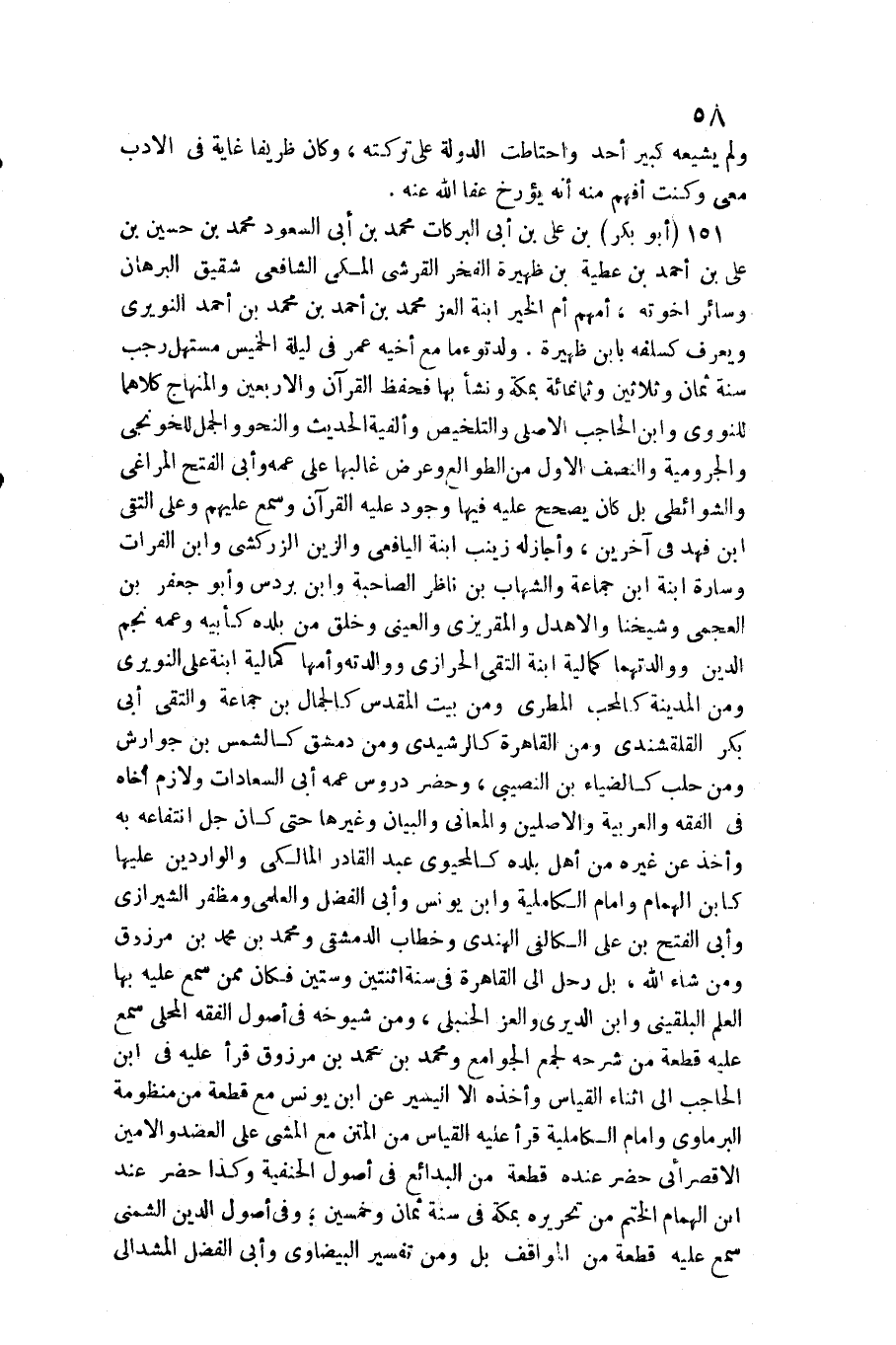 وَلم يشيعه كَبِير أحد واحتاطت الدولة على تركته وَكَانَ ظريفا غَايَة فِي الْأَدَب معي وَكنت أفهم مِنْهُ أَنه يؤرخ عَفا الله عَنهُ 15 (أَبُو بكر) بن عَليّ بن أبي البركات مُحَمَّد بن أبي السُّعُود مُحَمَّد بن حُسَيْن بن عَليّ بن أَحْمد بن عَطِيَّة بن ظهيرة الْفَخر الْقرشِي الْمَكِّيّ الشَّافِعِي شَقِيق الْبُرْهَان وَسَائِر اخوته أمّهم أم الْخَيْر ابْنة الْعِزّ مُحَمَّد بن أَحْمد بن مُحَمَّد بن أَحْمد النويري وَيعرف كسلفه بِابْن ظهيرة ولد توءما مَعَ أَخِيه عمر فِي لَيْلَة الْخَمِيس مستهل رَجَب سنة ثَمَان وَثَلَاثِينَ وَثَمَانمِائَة بِمَكَّة وَنَشَأ بهَا فحفظ الْقُرْآن وَالْأَرْبَعِينَ والمنهاج كِلَاهُمَا للنووي وَابْن الْحَاجِب الْأَصْلِيّ وَالتَّلْخِيص وألفية الحَدِيث والنحو والجمل للخوبخي والجرومية وَالنّصف الأول من الطوالع وَعرض غالبها على عَمه وابي الْفَتْح المراغي والشوائطي بل كَانَ يصحح عَلَيْهِ فِيهَا وجود عَلَيْهِ الْقُرْآن وَسمع عَلَيْهِم وعَلى التقي بن فَهد فِي آخَرين وَأَجَازَ لَهُ زَيْنَب ابْنة اليافعي والزين الزَّرْكَشِيّ وَابْن الْفُرَات وَسَارة ابْنة جمَاعَة والشهاب بن نَاظر الصاحبة وَابْن بردس وَأَبُو جَعْفَر بن العجمي وَشَيخنَا والأهدل والمقريزي والعيني وَخلق من بَلَده كأبيه وَعَمه نجم الدّين ووالدتهما كمالية ابْنة التقي الْحرَازِي ووالدته وَأمّهَا كمالية ابْنة عَليّ النويري وَمن الْمَدِينَة كالمحب المطري وَمن بَيت الْمُقَدّس كالجمال بن جمَاعَة والتقي أبي بكر القلقشندي وَمن الْقَاهِرَة كالرشيدي وَمن دمشق كَالشَّمْسِ بن جوارش وَمن حلب كالضياء بن النصيبي وَحضر دروس عَمه أبي السعادات ولازم أَخَاهُ فِي الْفِقْه والعربية والأصلين والمعاني وَالْبَيَان وَغَيرهَا حَتَّى كَانَ جلّ انتفاعه بِهِ وَأخذ عَن غَيره من أهل بَلَده كالمحيوي عبد الْقَادِر الْمَالِكِي والواردين عَلَيْهَا كَابْن الْهمام وأمام الكاملية وَابْن يُونُس وَأبي الْفضل والعلمي ومظفر الشِّيرَازِيّ وَأبي الْفَتْح بن عَليّ الكالفي الْهِنْدِيّ وخطاب الدِّمَشْقِي وَمُحَمّد بن مُحَمَّد بن مَرْزُوق وَمن شَاءَ الله بل رَحل إِلَى الْقَاهِرَة فِي سنة اثْنَتَيْنِ وَسِتِّينَ فَكَانَ مِمَّن سمع عَلَيْهِ بهَا الْعلم البُلْقِينِيّ وَابْن الديري والعز الْحَنْبَلِيّ وَمن شُيُوخه فِي أصُول الْفِقْه الْمحلى سمع عَلَيْهِ قِطْعَة من شَرحه لجمع الْجَوَامِع وَمُحَمّد بن مُحَمَّد بن مَرْزُوق قَرَأَ عَلَيْهِ فِي ابْن الْحَاجِب إِلَى أثْنَاء الْقيَاس وَأَخذه إِلَّا الْيَسِير عَن ابْن يُونُس مَعَ قِطْعَة من منظومة الْبرمَاوِيّ وامام الكاملية قَرَأَ عَلَيْهِ الْقيَاس من الْمَتْن مَعَ الْمَشْي على الْعَضُد والأمين الأقصرائي حضر عِنْده قِطْعَة من الْبَدَائِع فِي أصُول الْحَنَفِيَّة وَكَذَا حضر عِنْد ابْن الْهمام الْخَتْم فِي تحريره بِمَكَّة فِي سنة ثَمَان وَخمسين وَفِي أصُول الدّين الشمنى سمع عَلَيْهِ قِطْعَة من المواقف بل وَمن تَفْسِير الْبَيْضَاوِيّ وَأبي الْفضل المشدالي