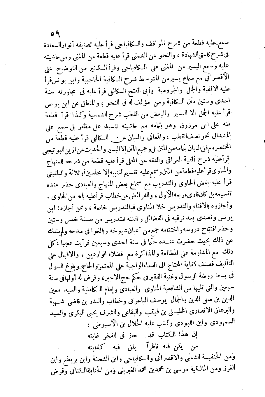 سمع عَلَيْهِ قِطْعَة من شرح المواقف والكافياجي قَرَأَ عَلَيْهِ تصنيفه أنوار السَّعَادَة فِي شرح كلمتي الشَّهَادَة والنحو عَن الشمني قَرَأَ عَلَيْهِ قِطْعَة من المغنى وَمن حَاشِيَته عَلَيْهِ وَسمع الْيَسِير من المغنى على الكافياجي وَقَرَأَ الْكثير من التَّوْضِيح على الأقصرائي مَعَ سَماع يسير من الْمُتَوَسّط شرح الكافية الحاجبية وَابْن يُونُس قَرَأَ عَلَيْهِ الألفية والجمل والجرومية وَأبي الْفَتْح الكالفي قَرَأَ عَلَيْهِ فِي مجاورته سنة إِحْدَى وَسِتِّينَ متن الكافية وَمن مؤلف لَهُ فِي النَّحْو والمنطق عَن ابْن يُونُس قَرَأَ عَلَيْهِ الْجمل إِلَّا الْيَسِير وَالْبَعْض من القطب شرح الشمسية وَكَذَا قَرَأَ قِطْعَة مِنْهُ على ابْن مَرْزُوق وَهُوَ بِتَمَامِهِ مَعَ حَاشِيَته للسَّيِّد على مظفر بل سمع على المشدالي نَحْو نصف القطب والمعاني وَالْبَيَان عَن الكالفي قَرَأَ عَلَيْهِ قِطْعَة من الْمُخْتَصر مَعَ فن الْبَيَان بِتَمَامِهِ من الْمَتْن بل وَجَمِيع الْمَتْن إِلَّا الْيَسِير والْحَدِيث عَن الزين البوتيجي قَرَأَ عَلَيْهِ شرح ألفية الْعِرَاقِيّ وَالْفِقْه عَن الْمحلى قَرَأَ عَلَيْهِ قِطْعَة من شَرحه للمنهاج والمناوي قَرَأَ عَلَيْهِ قِطْعَة من الْمَتْن وَسمع عَلَيْهِ تَقْسِيم التَّنْبِيه إِلَّا مجلسين أَو ثَلَاثَة والبلقيني قَرَأَ عَلَيْهِ بعض الْحَاوِي والتدريب مَعَ سَماع بعض الْمِنْهَاج والعبادي حضر عِنْده تقسيمه بل كَانَ قَارِئ ربعه الأول والفرائض عَن خطاب قَرَأَ عَلَيْهِ بَابه من الْحَاوِي وأجازوه بالإفتاء والتدريس خلا الْمَنَاوِيّ فبالتدريس خَاصَّة وَمِمَّنْ أجَازه ابْن يُونُس وتصدى بعد ترقيه فِي الْفَضَائِل وتفننه للتدريس من سنة خمس وَسِتِّينَ وَحضر افْتِتَاح دروسه واختتامه جمع من أَعْيَان شُيُوخه وبالغوا فِي مدحه وَلم يَنْفَكّ عَن ذَلِك بِحَيْثُ حضرت عِنْده حتما فِي سنة إِحْدَى وَسبعين فَرَأَيْت عجبا كل ذَلِك مَعَ المداومة على المطالعة والمذاكرة مَعَ فضلاء الواردين والإقبال على التَّأْلِيف فصنف كِفَايَة الْمُحْتَاج إِلَى الدِّمَاء الْوَاجِبَة على الْمُعْتَمِر والحاج وبلوغ السول فِي بسط رَوْضَة الرَّسُول وغنية الْفَقِير فِي حكم حج الْأَجِير وقرض لَهُ أَولهَا فِي سنة سبعين وَالَّتِي تَلِيهَا من الشَّافِعِيَّة الْمَنَاوِيّ والعبادي وَإِمَام الكاملية وَالسَّيِّد معِين الدّين بن صفي الدّين وَالْجمال يُوسُف الباعوني وخطاب والبدر بن قَاضِي شُهْبَة والبرهان الْأنْصَارِيّ الخليلي بن قيقب والبقاعي والشرف يحيى الْبكْرِيّ وَالسَّيِّد السمهودي وَابْن اللبودي وَكتب عَلَيْهِ الْجلَال بن الأسيوطي